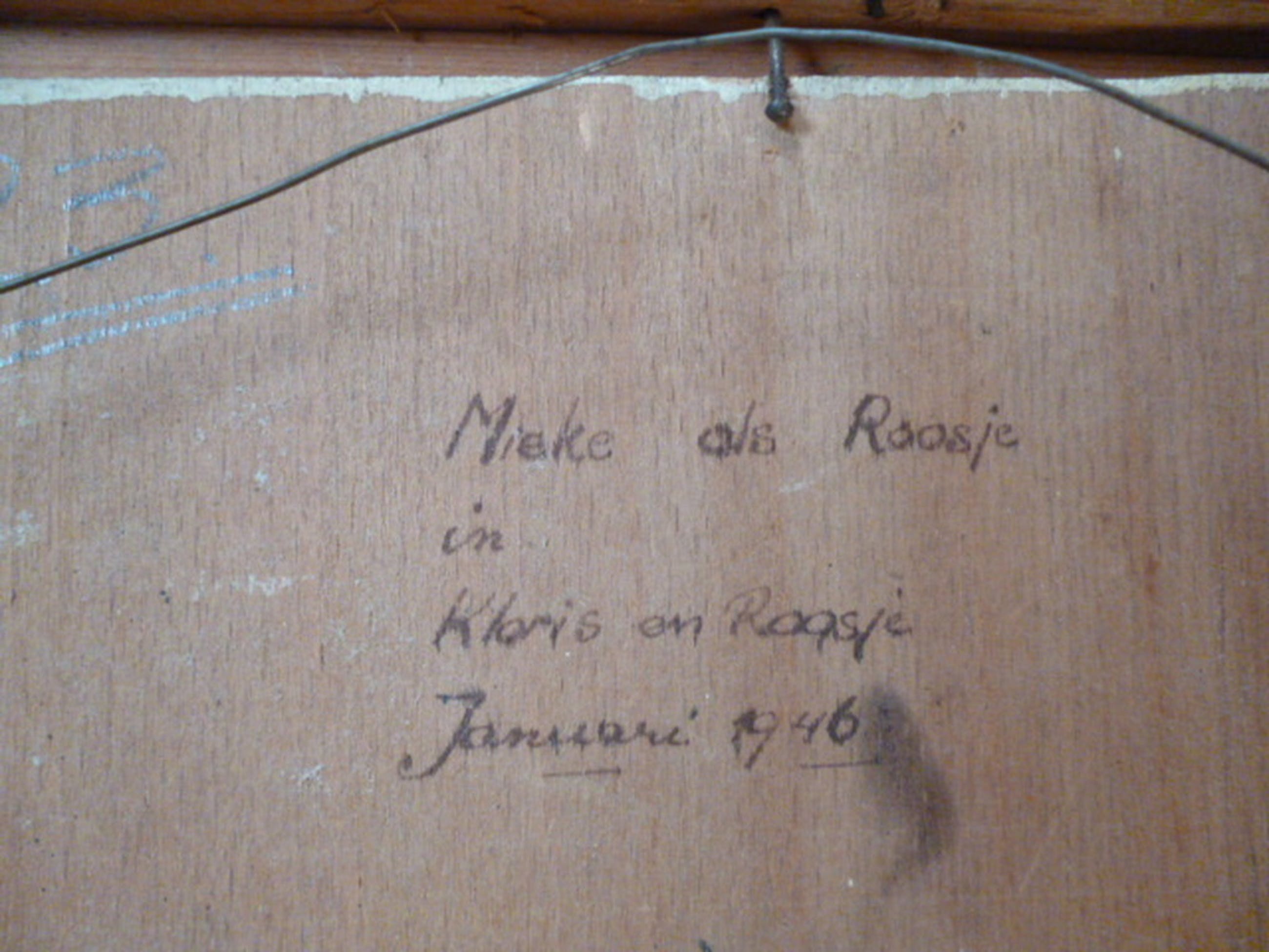 Achterzijde betiteld Mieke als Roosje in Kloris en Roosje - januari 1946.
