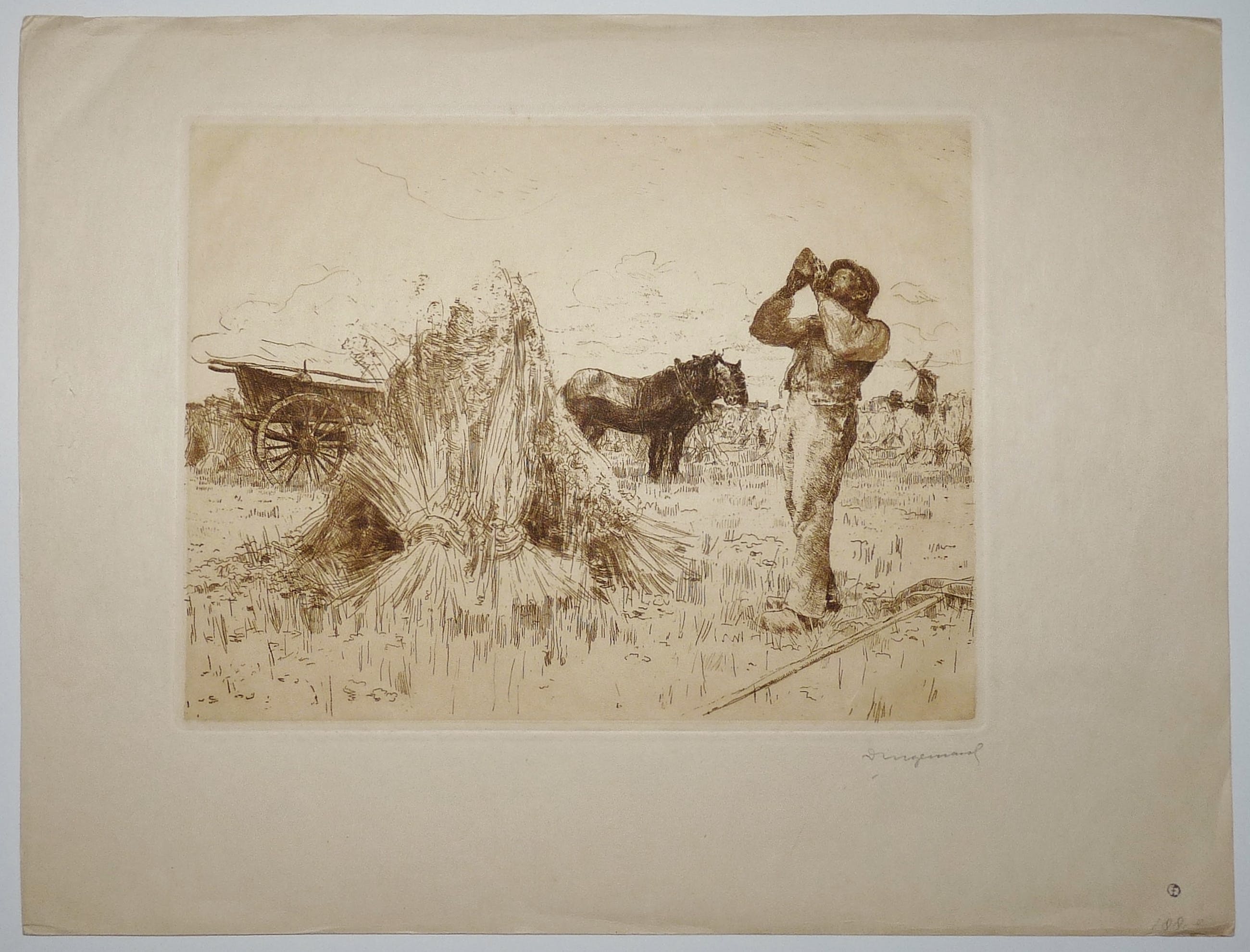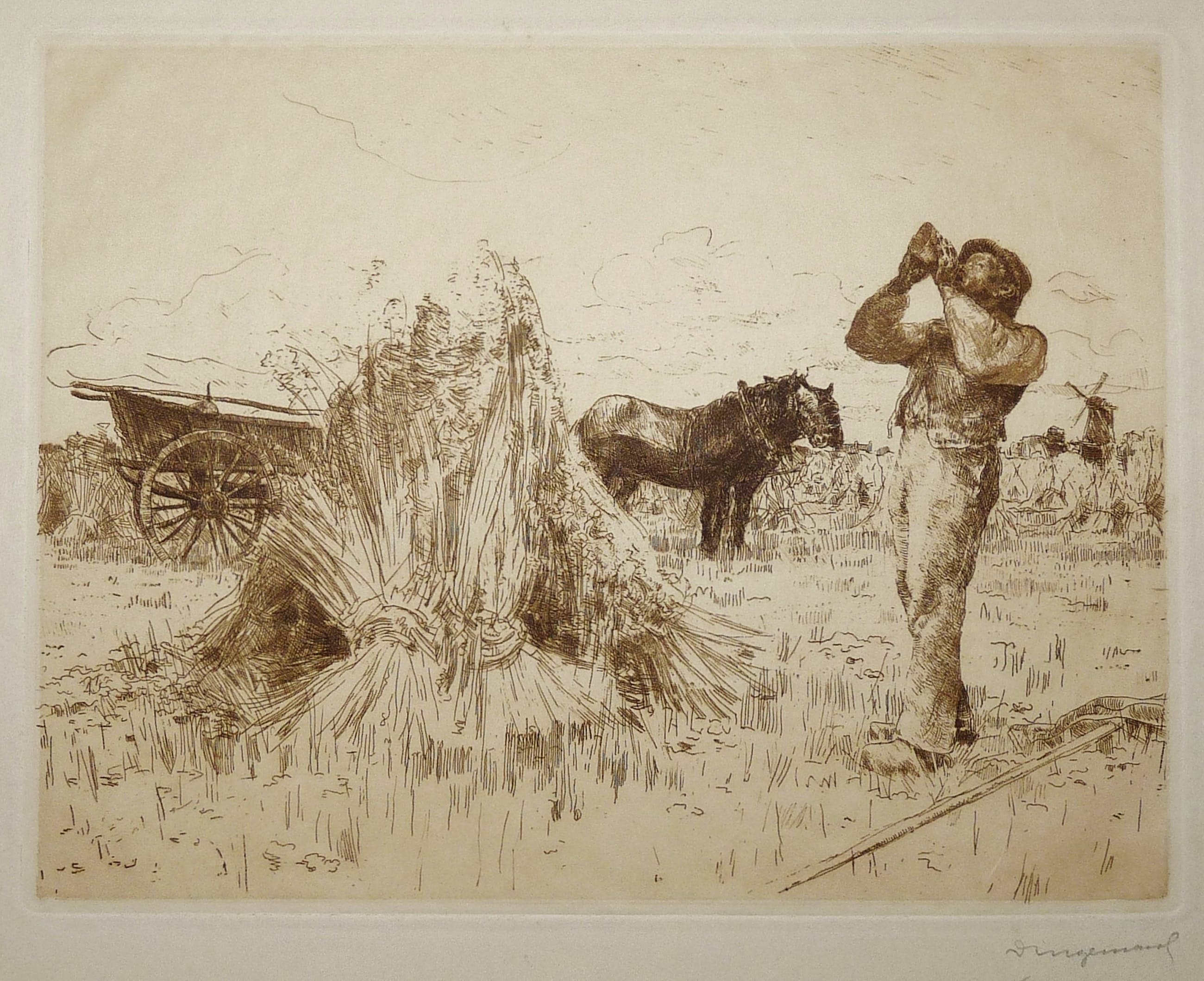 Fraaie ets van Dingemans senior van een arbeider op het land met paarden en kar. Papiermaat 29 x 39 cm. Beeldmaat 19 x 25 cm.