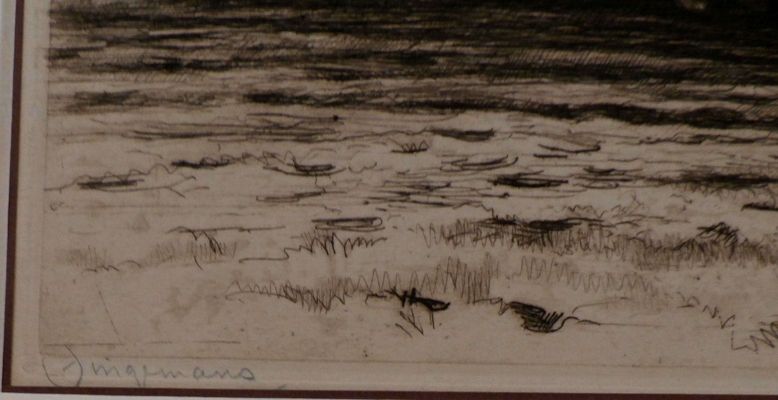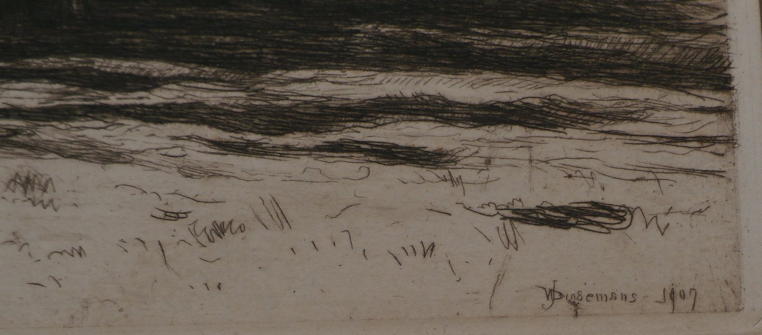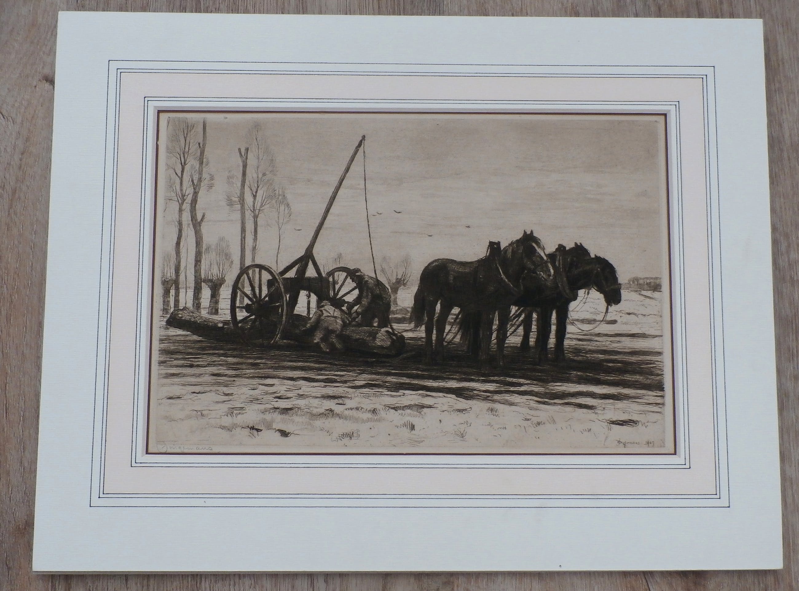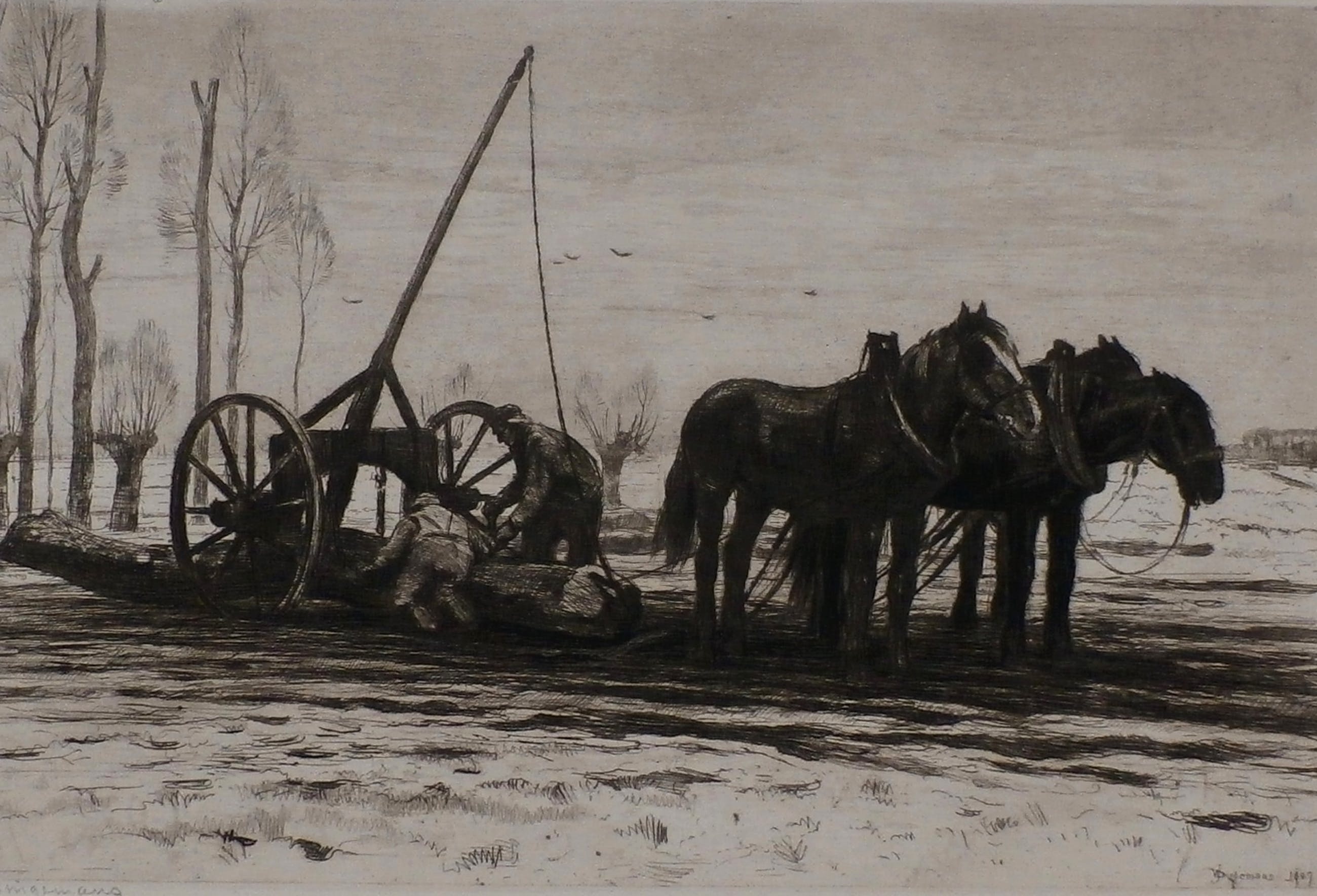 Ets van ploegende paarden van Waalko Jans Dingemans. Jaar: 1907. Het werk is linksonder, met potlood, gesigneerd door de kunstenaar.