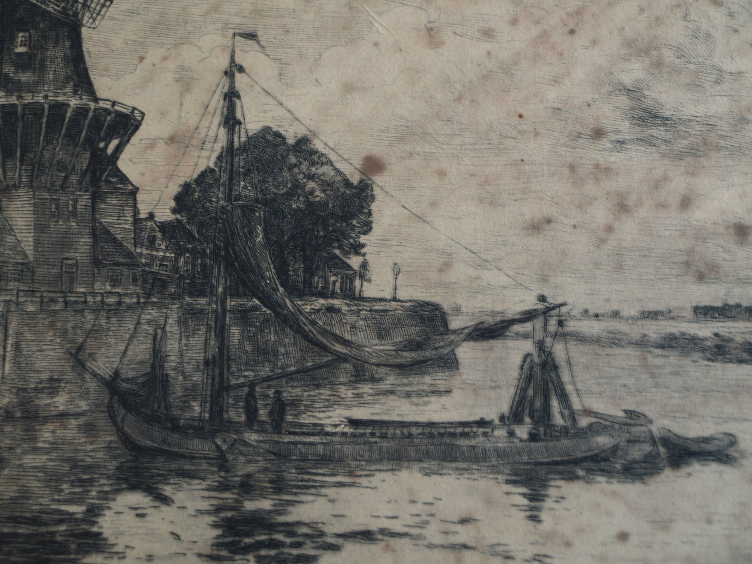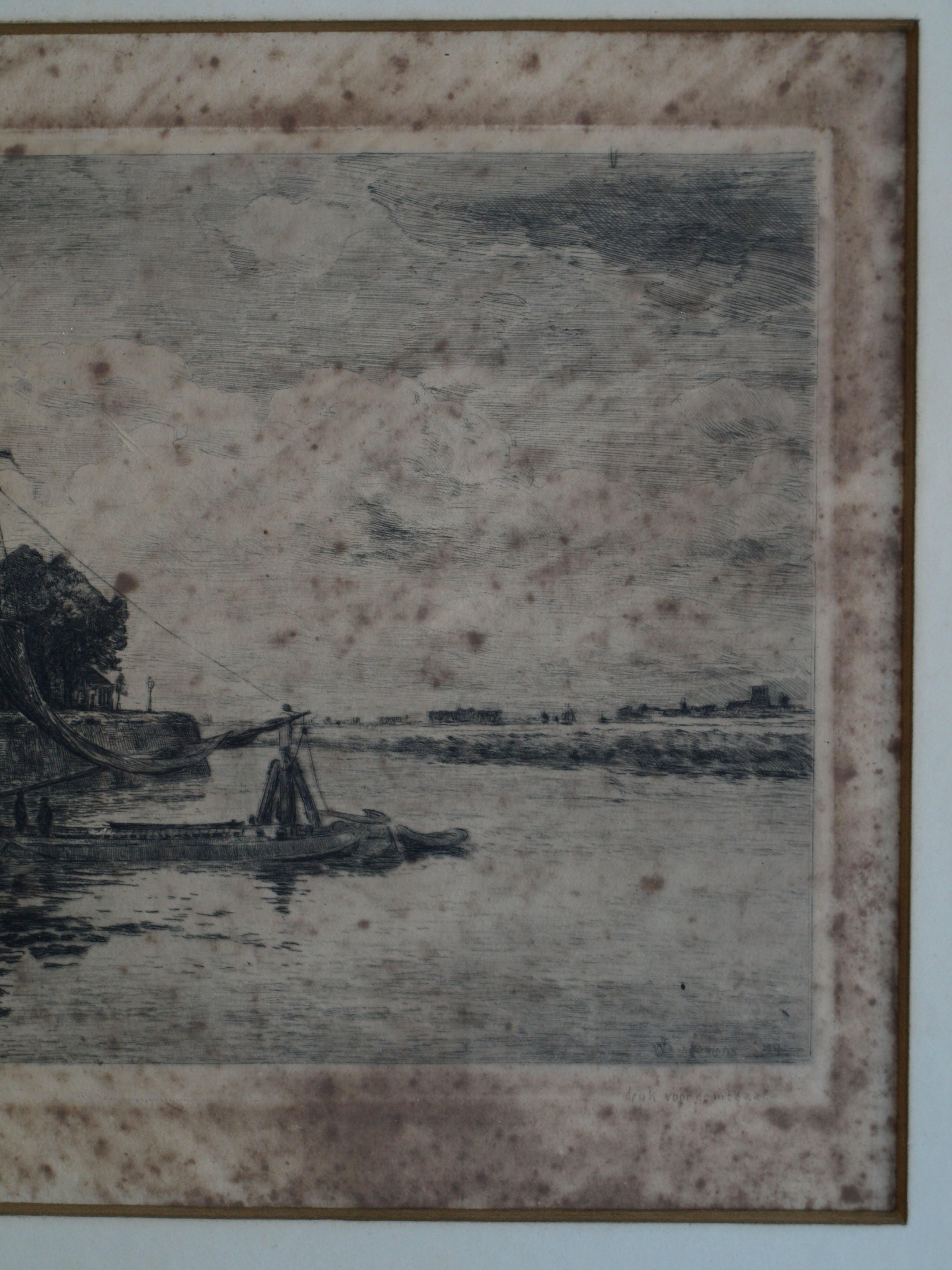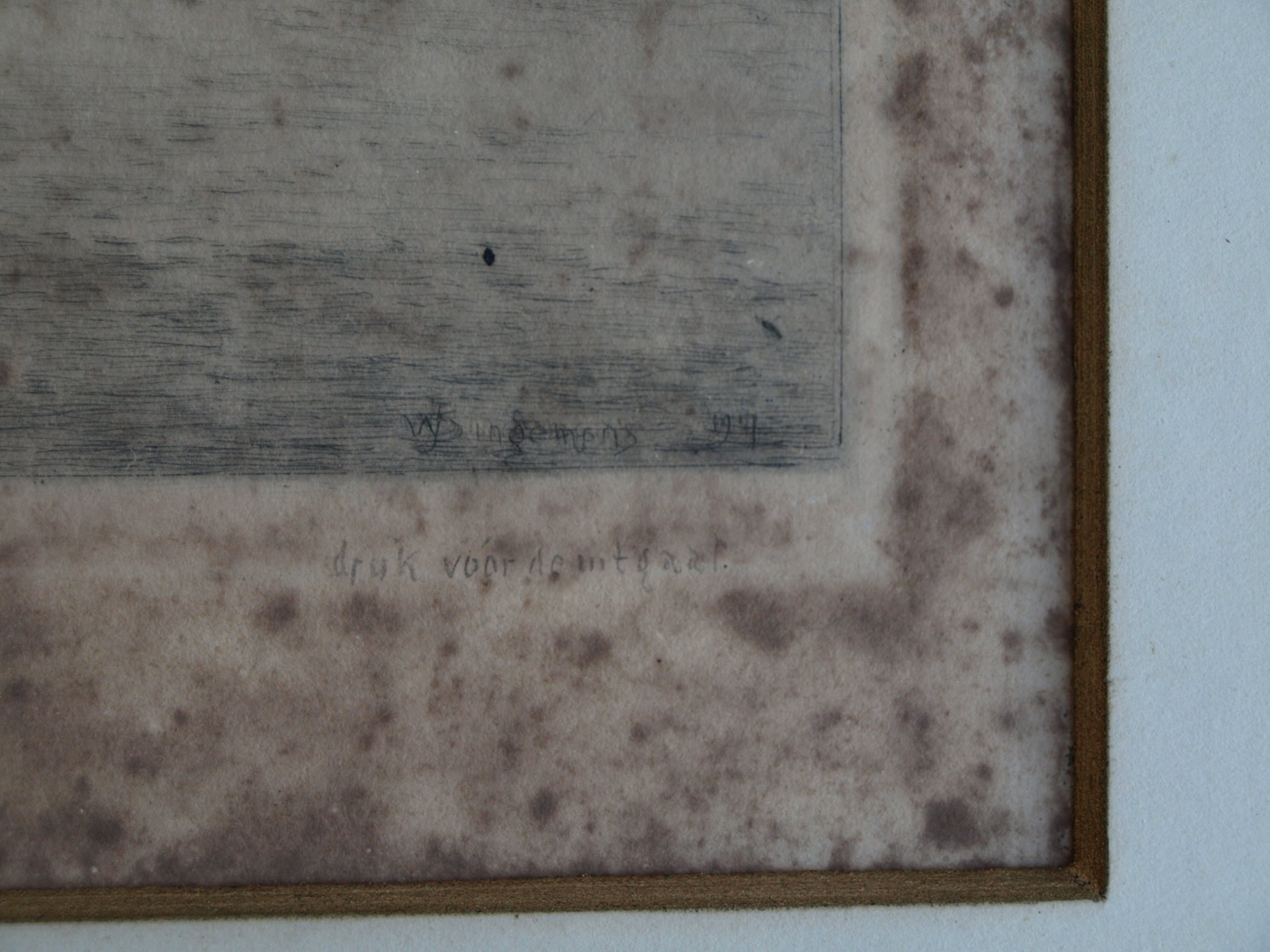 -Conditie: Het papier van de ets heeft veel zuurvlekken. Het passe-partout is vergeeld.