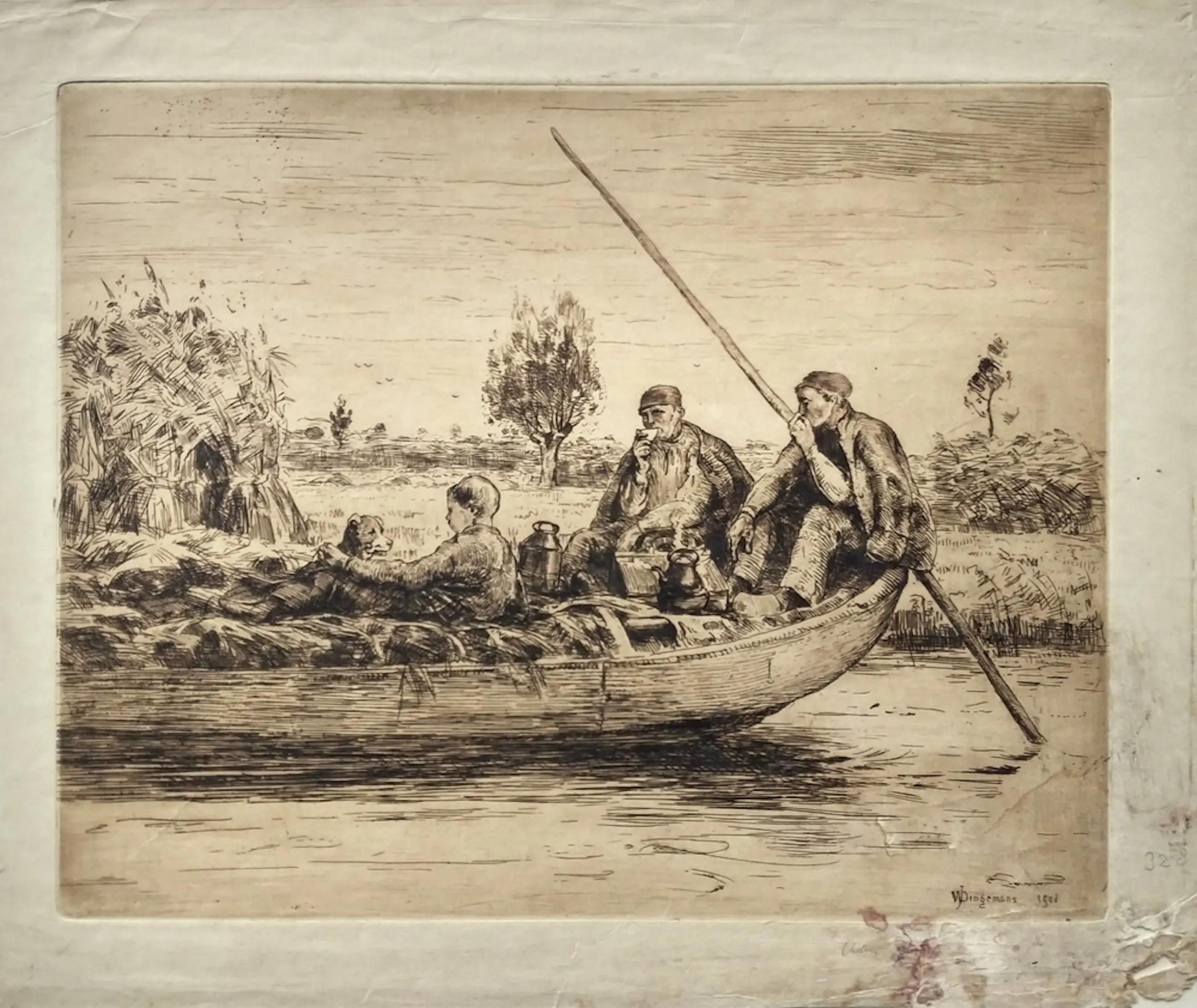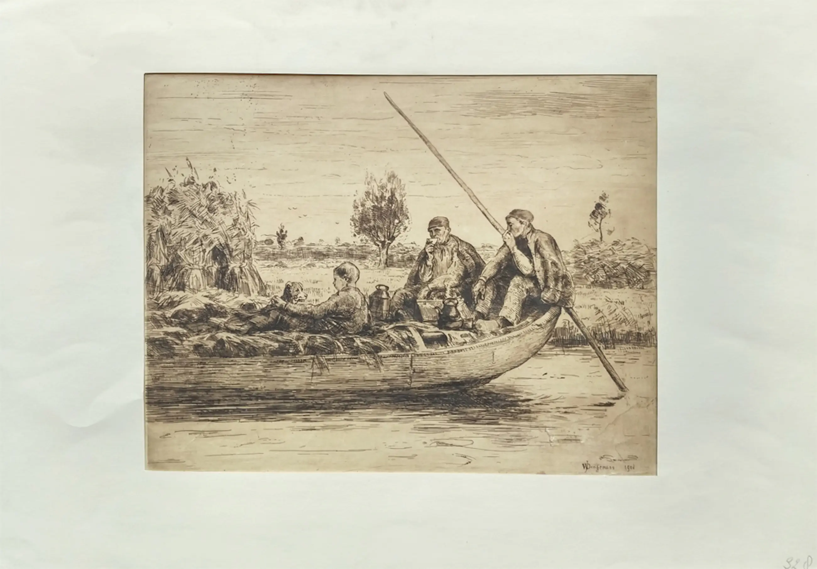 Ets van Waalko Jans Dingemans, afgebeeld is in een roeiboot met een aantal personen. De ets is rechtsonder gesigneerd met ‘WJDingemans’ en gedateerd ‘1908’. Met passe-partout meet het werk 35 centimeter hoog en 50 centimeter breed.