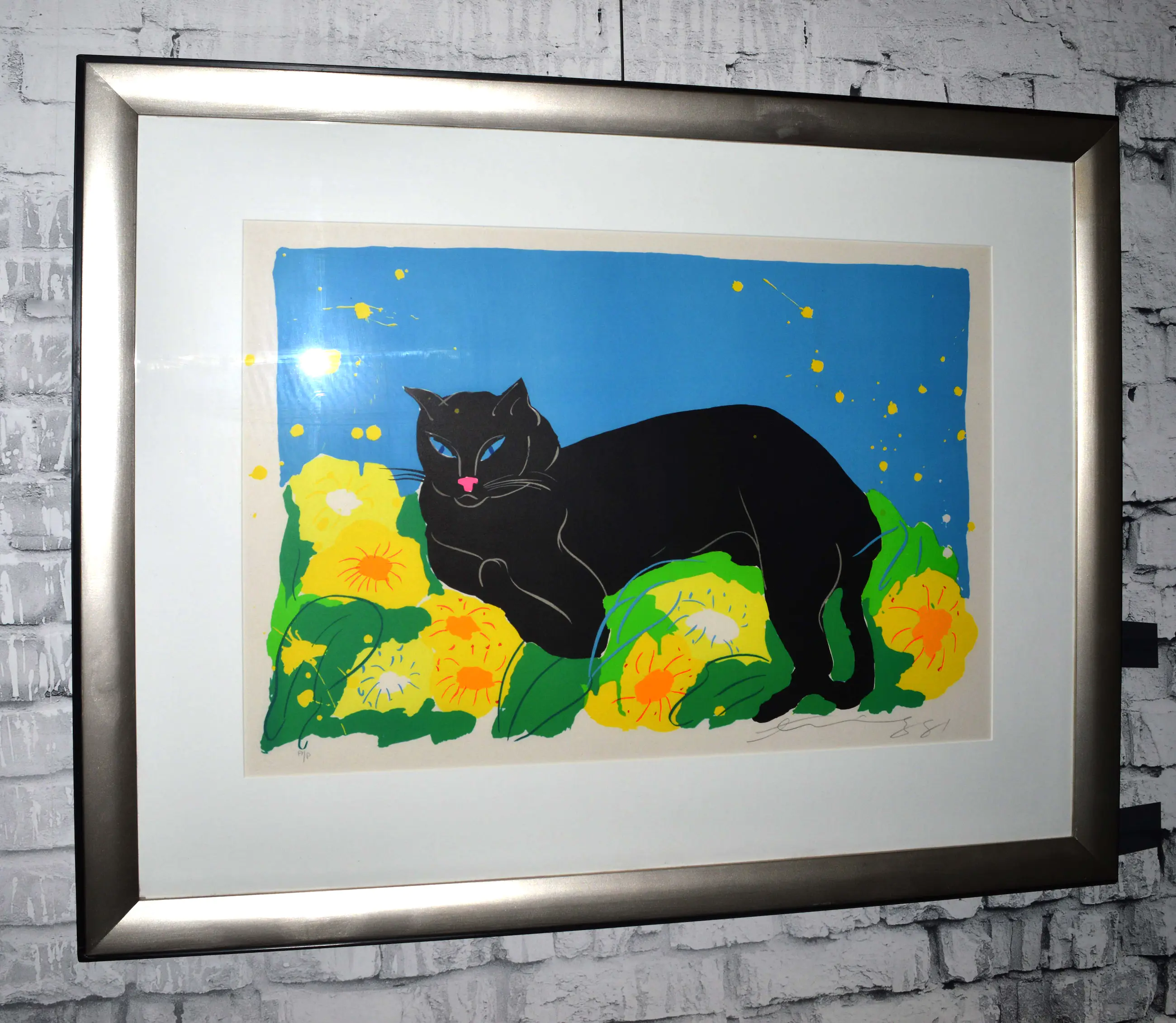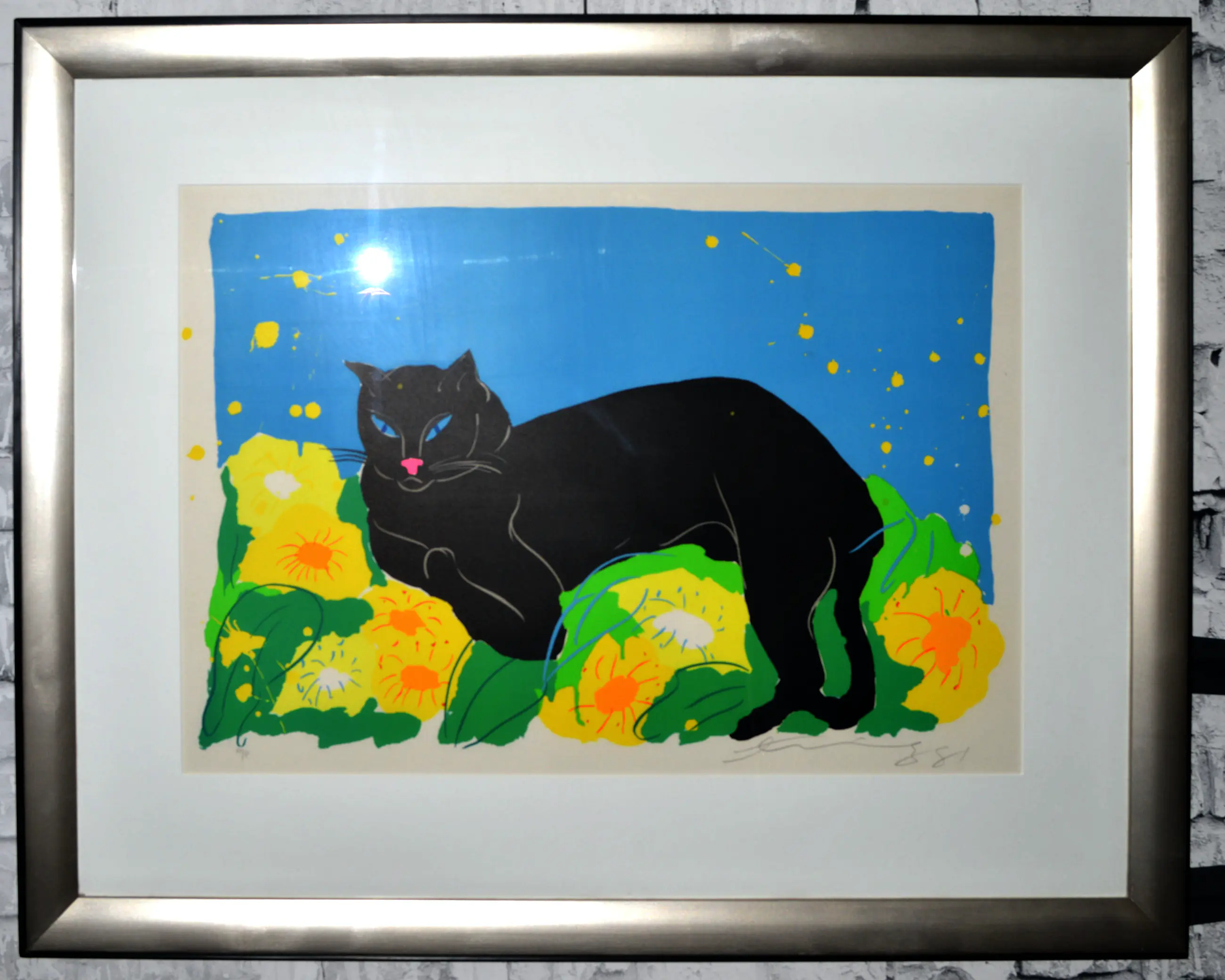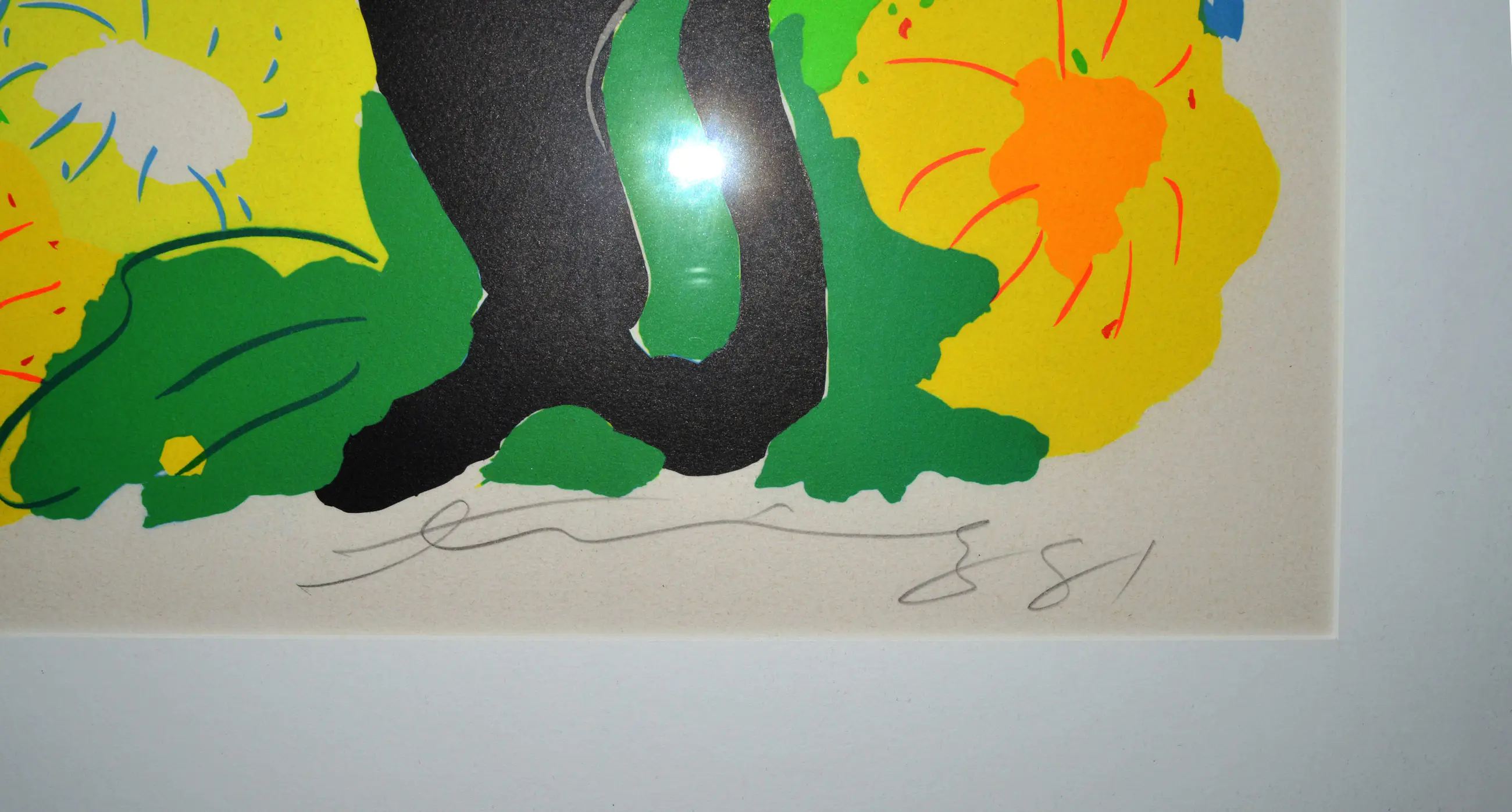 Prachtig kleurrijk werk van Walasse Ting, ingelijst in een zilver zwarte houten lijst met passe partout. Het werk is genummerd A/P.