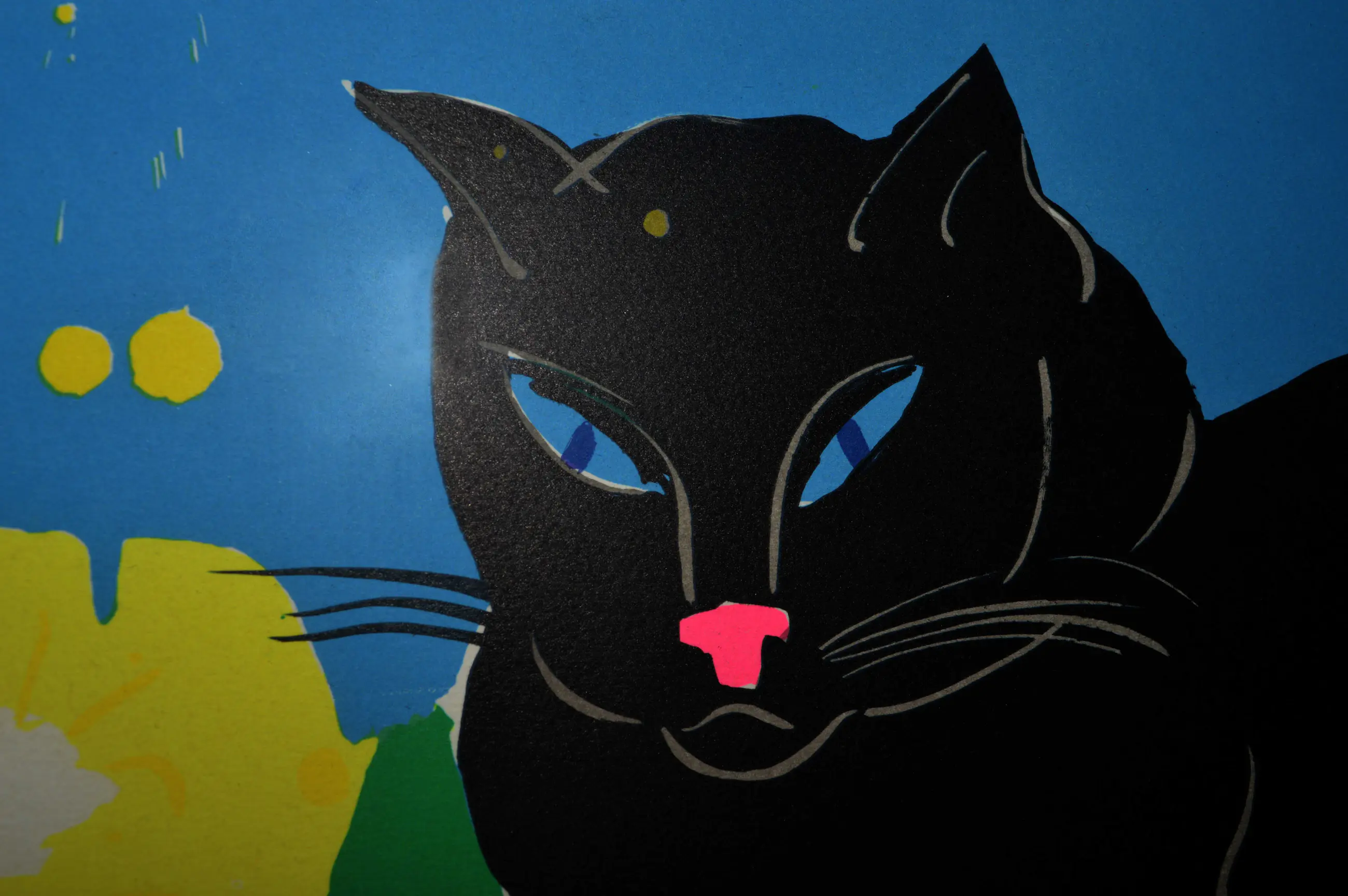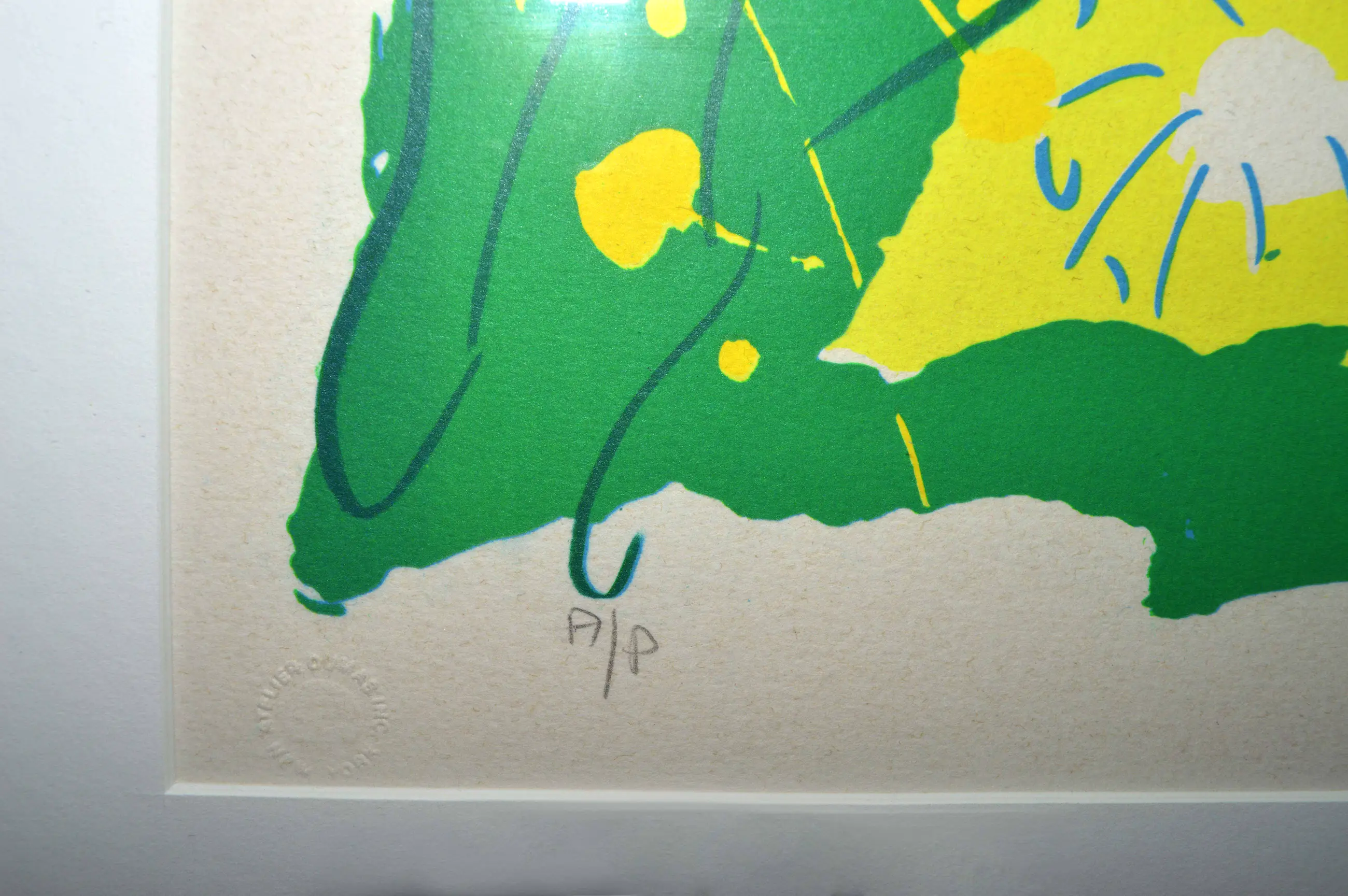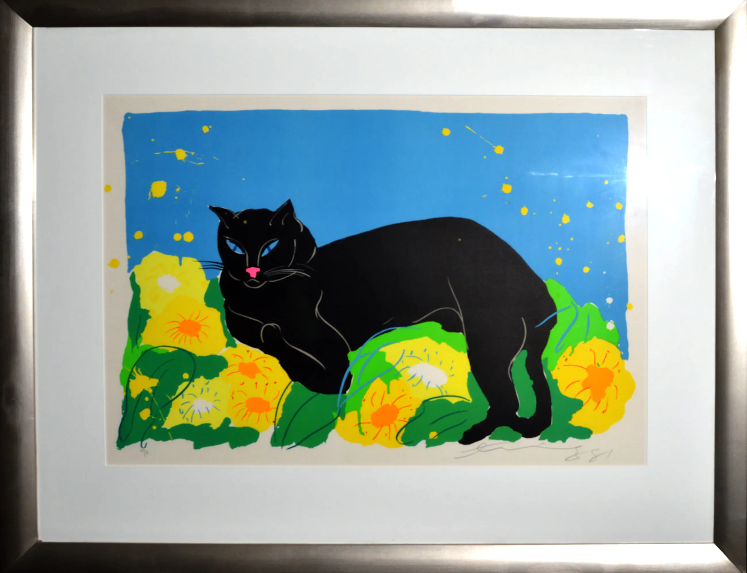 Prachtig kleurrijk werk van Walasse Ting, ingelijst in een zilver zwarte houten lijst met passe partout. Het werk is genummerd A/P.