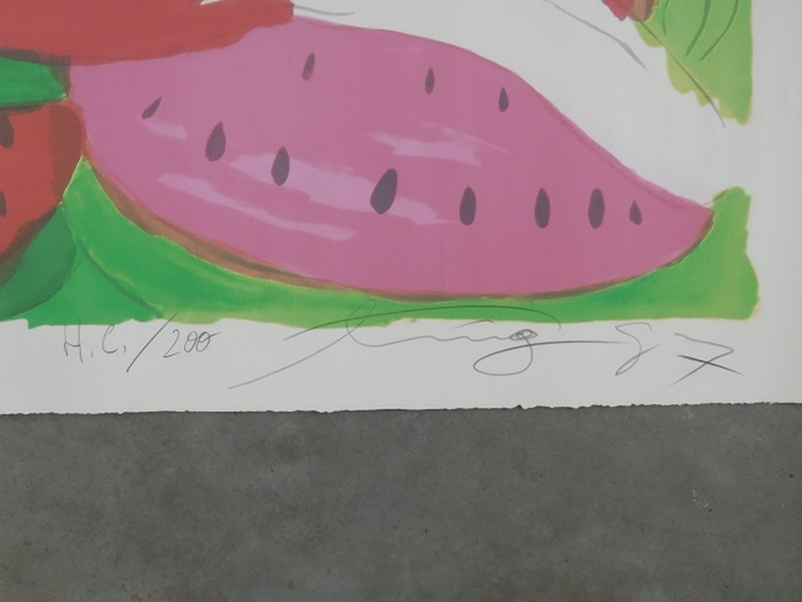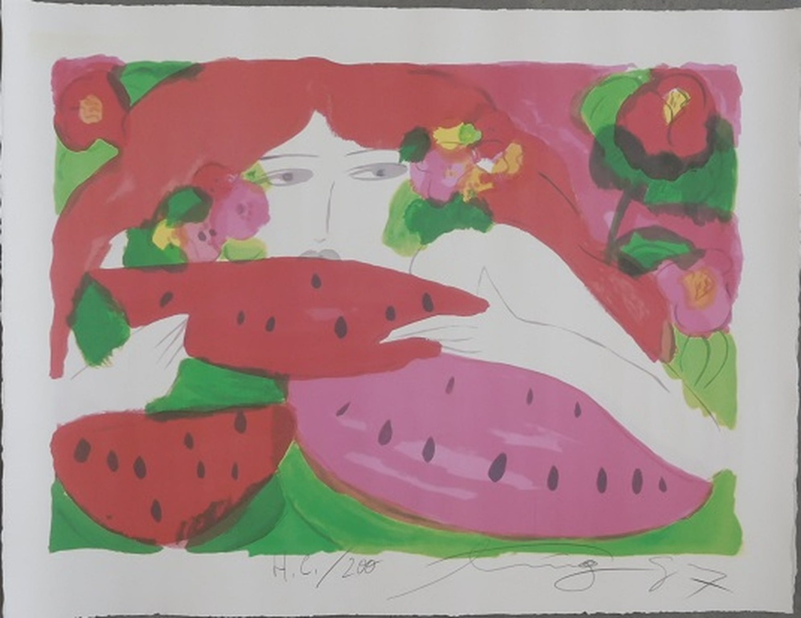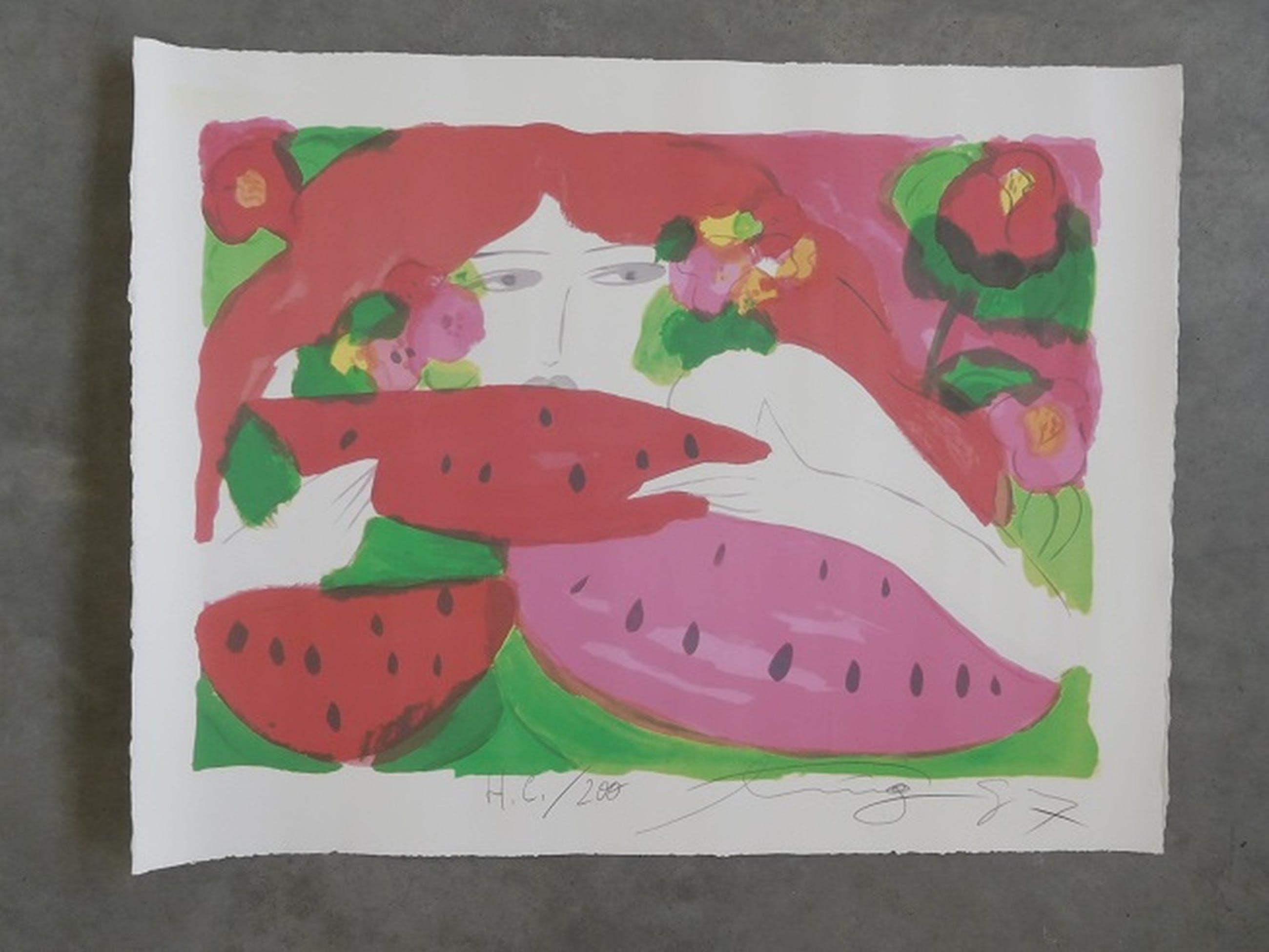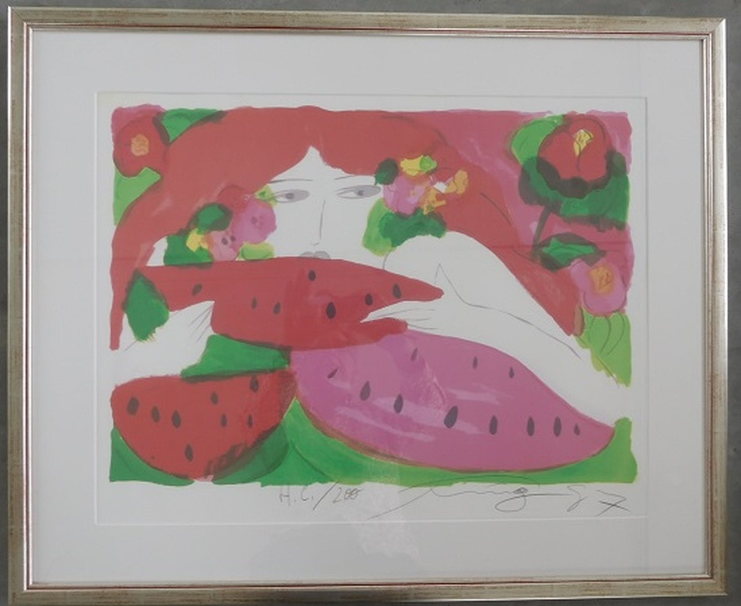Zeefdruk van Walasse Ting uit 1987. Het werk is zeer typerend qua voorstelling (Meloenetende dame) en qua kleur. Het werk is ingelijst en meet 78 x 64 cm. Het werk heeft als nummering HC/200. Afhalen heeft de voorkeur. Versturen in overleg of bezorgen.