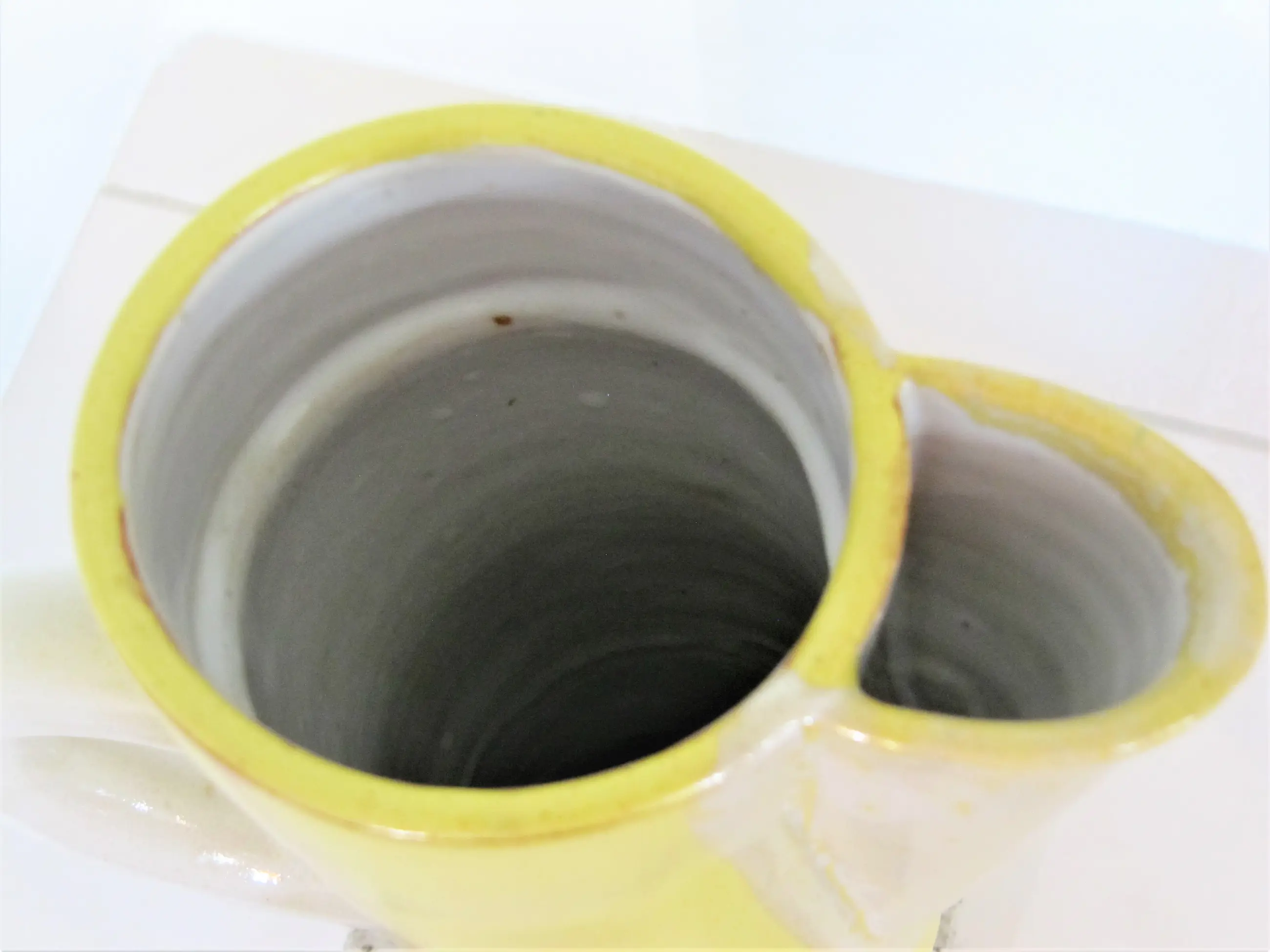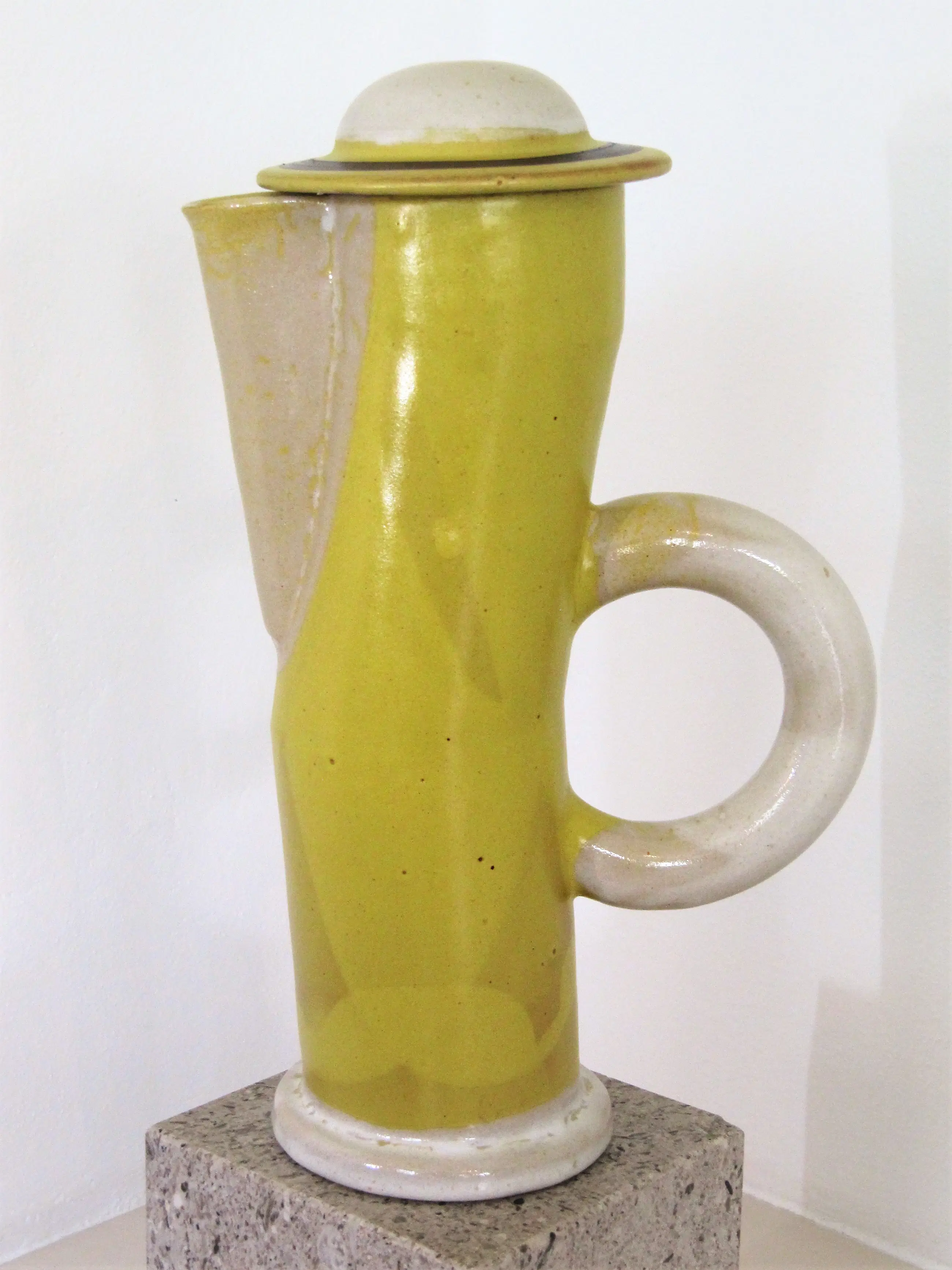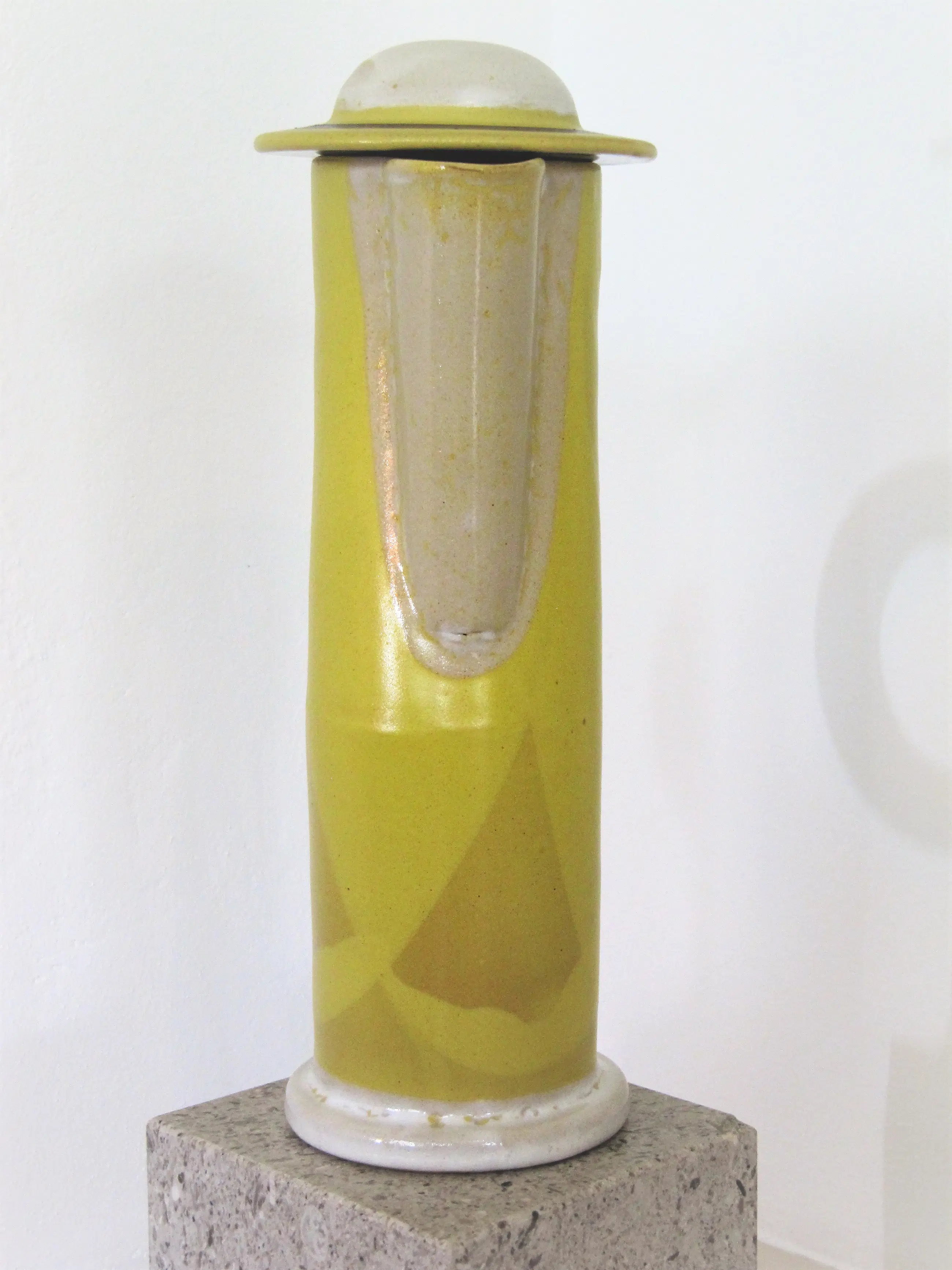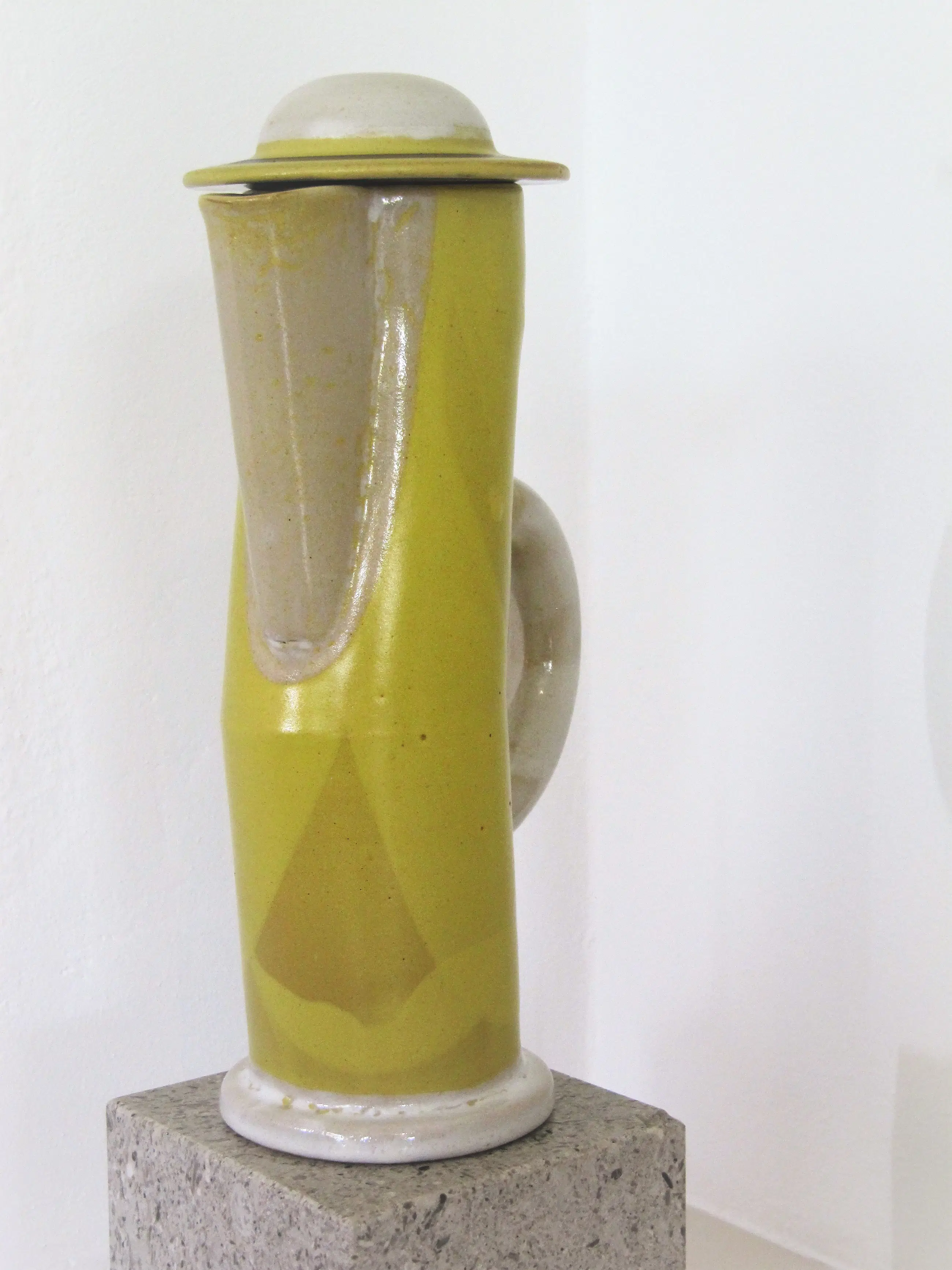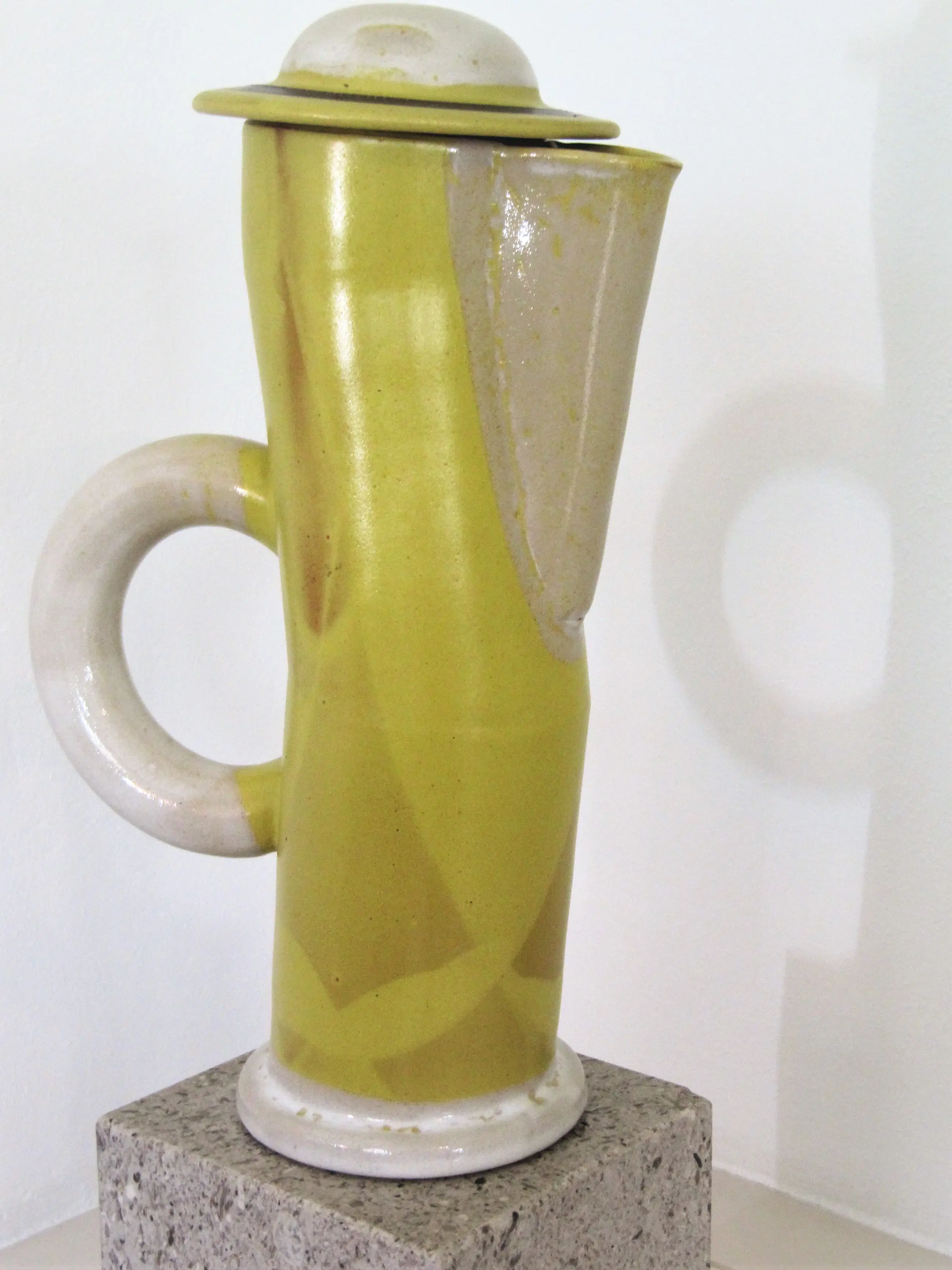 lichte, steengoedachtige scherven, montage van platen en Gedraaide delen, lichte penseelstreken over glanzend wit, oker en gele glazuur, ca. 1985.