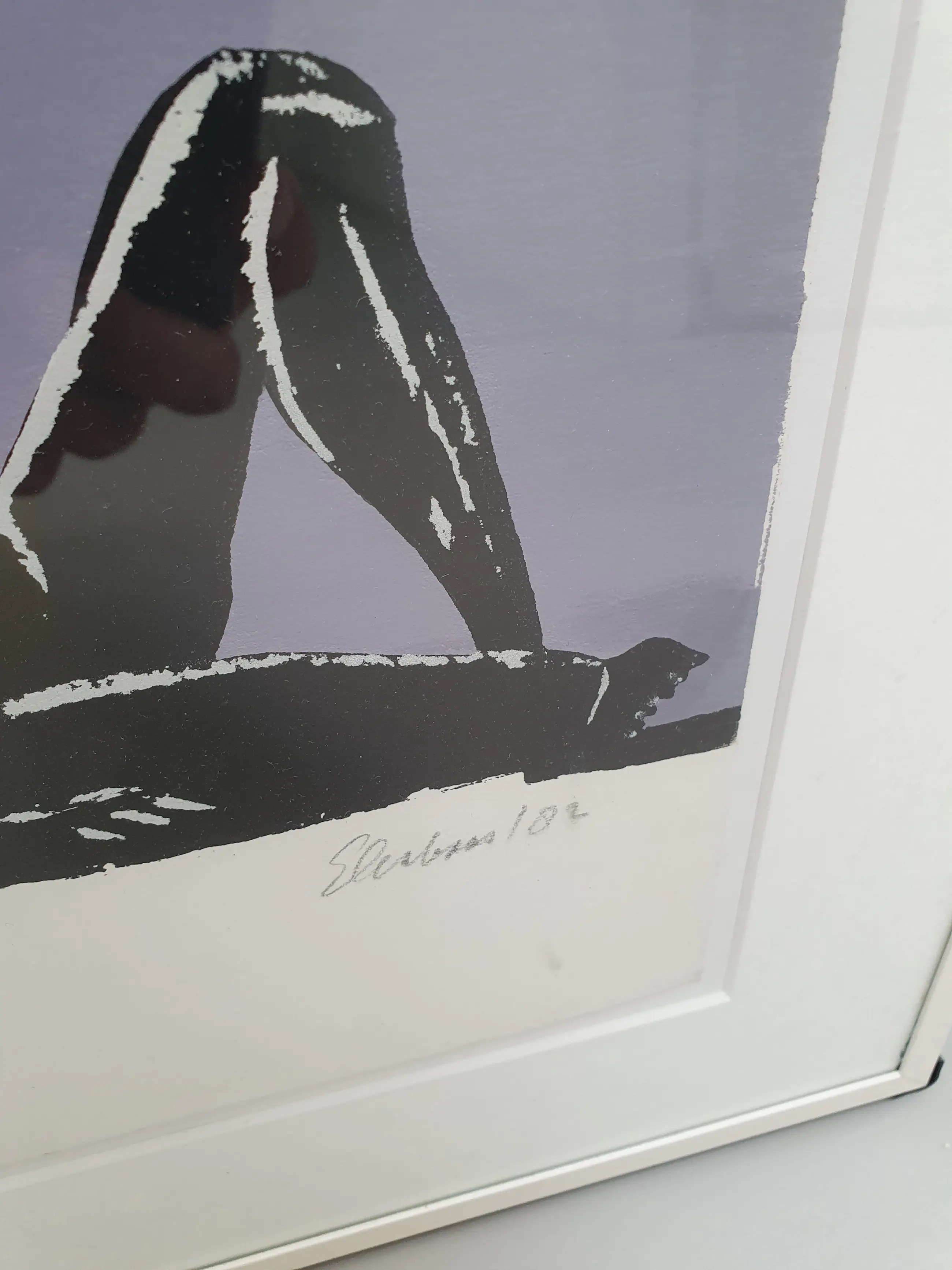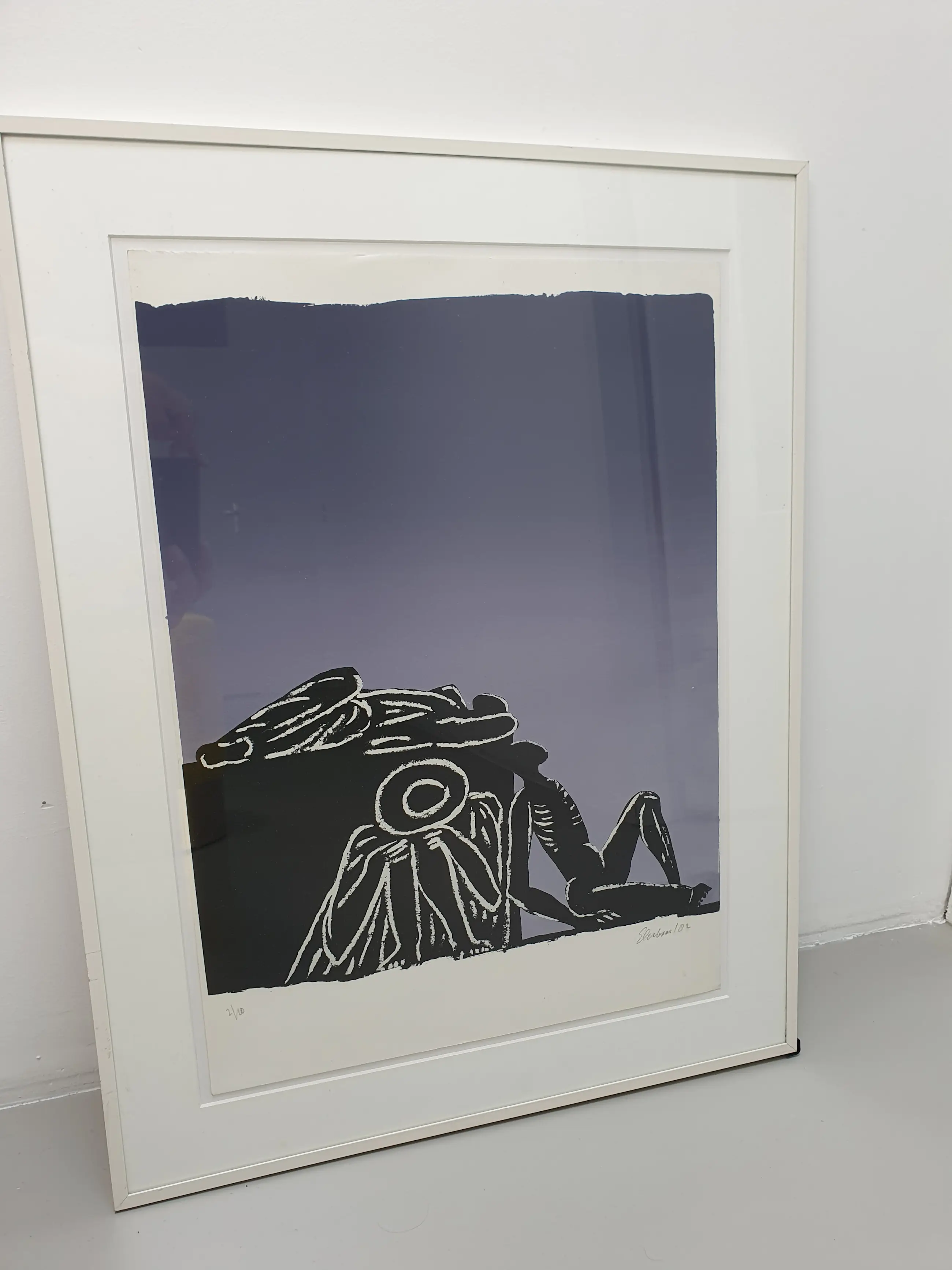 Foto’s maken onderdeel uit van de beschrijving. Lijst is verweerd. Zie foto’s. Zeefdruk ziet er nog goed uit. Kopen voor zeefdruk, niet voor lijst. Wel professioneel / galerie ingelijst.