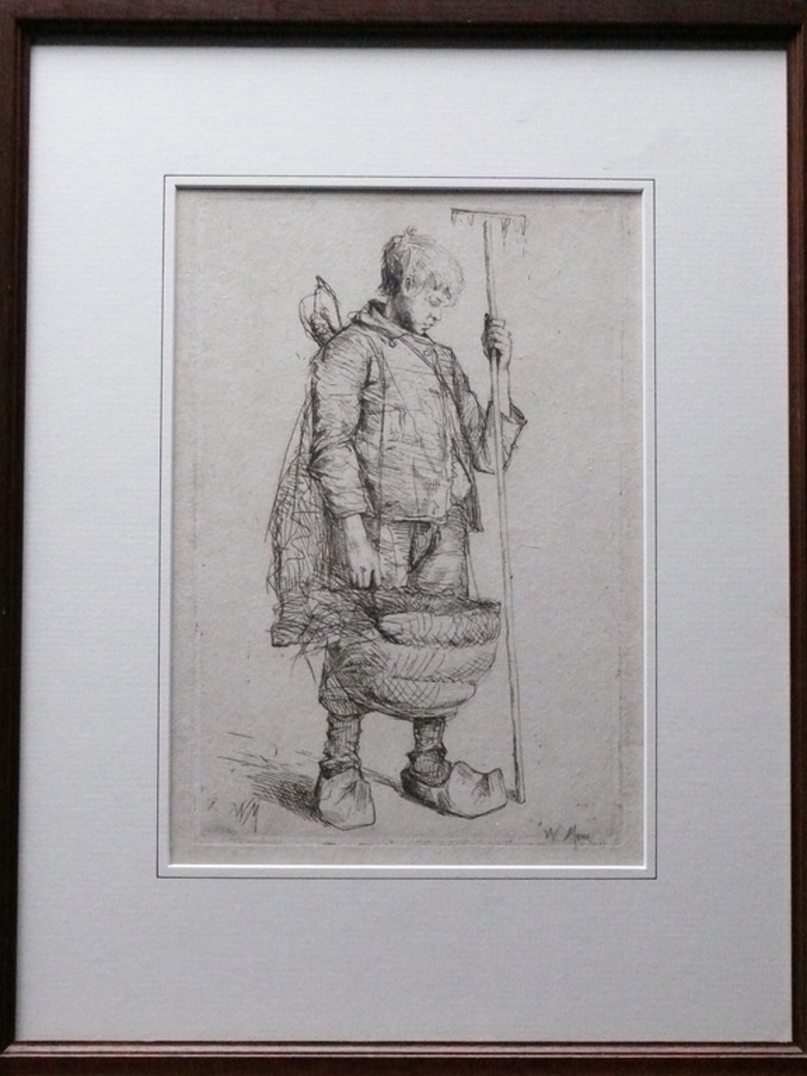 Prachtige ets in houten lijst met passe-partout achter glas.