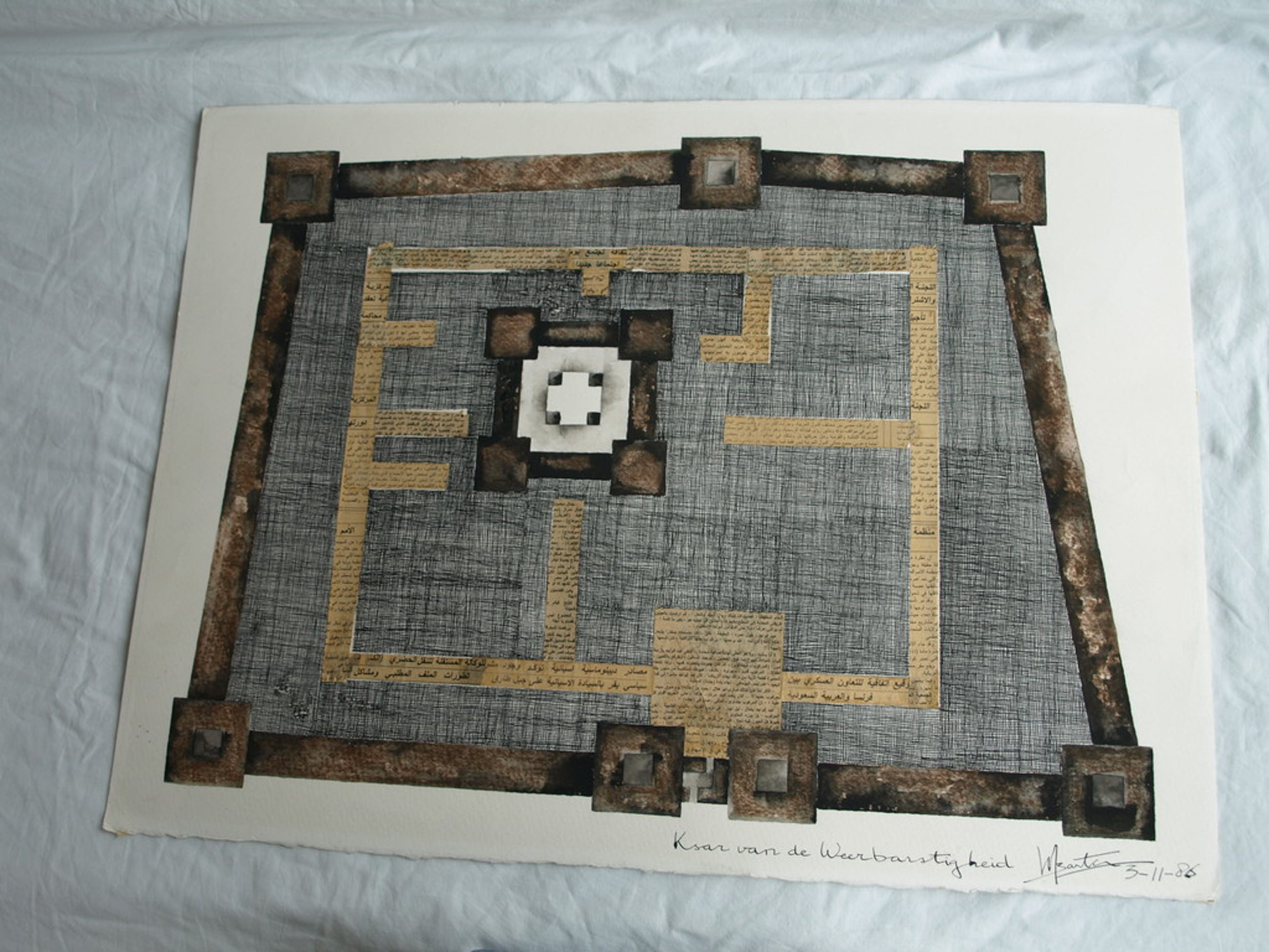 Techniek: Gemengde techniek, een combinatie van verf, inkt en krantenpapier met Arabische teksten..