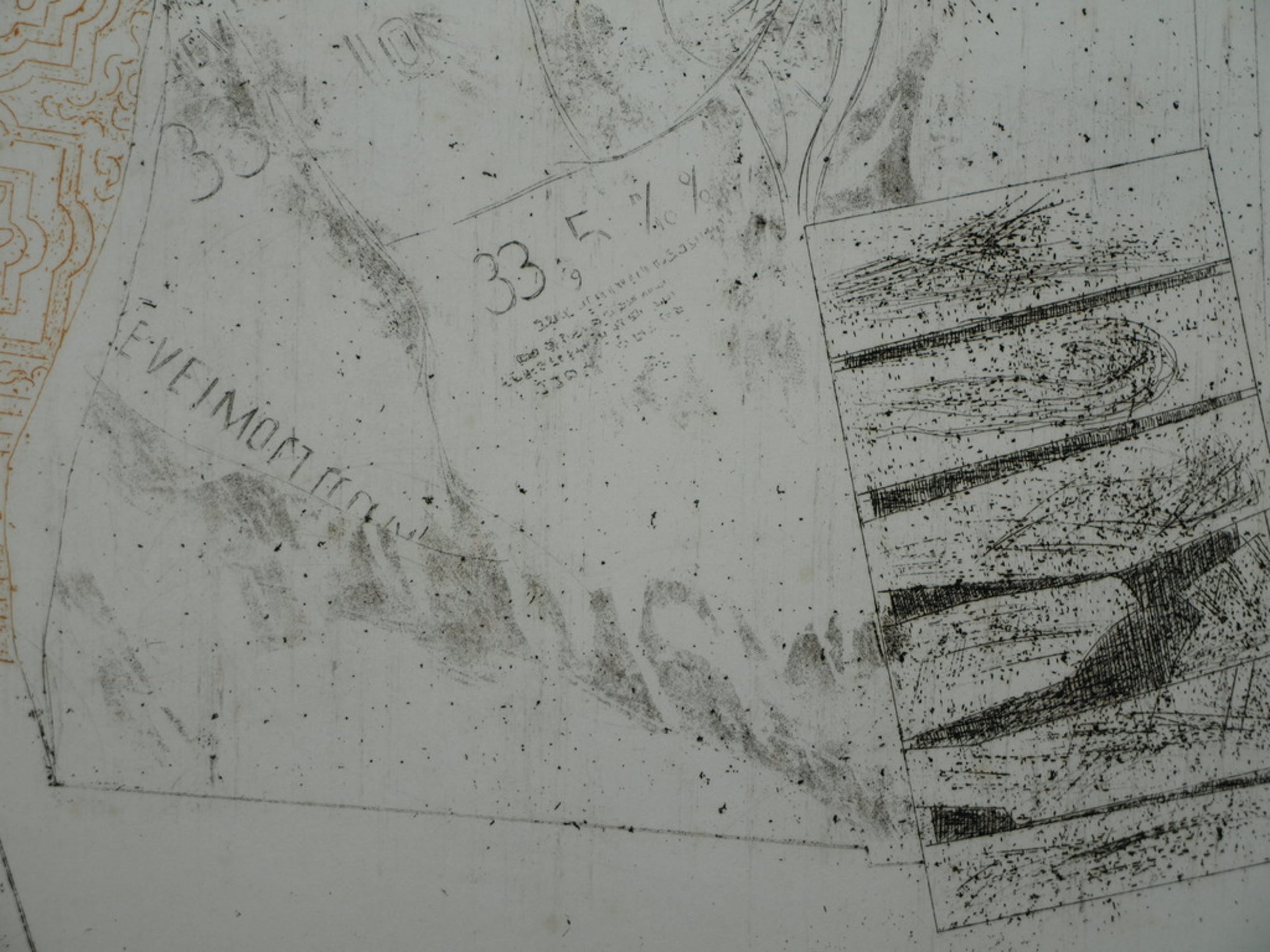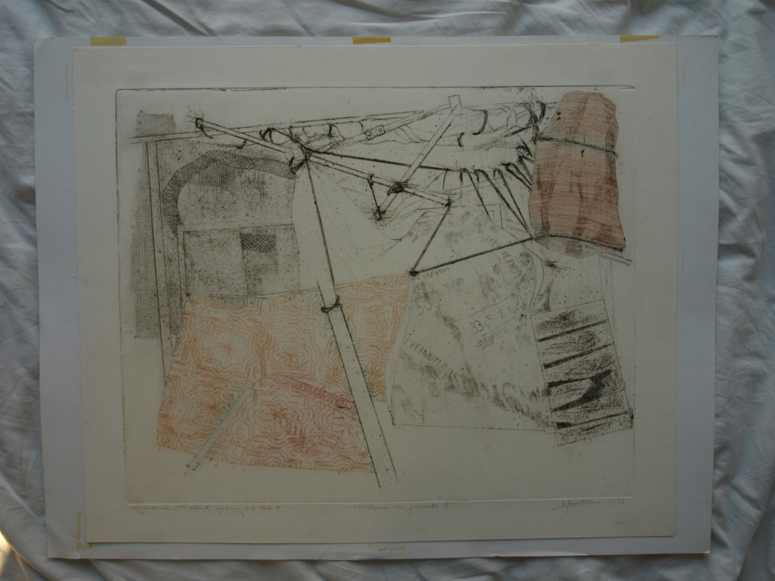 De ets is losbladig, nooit ingelijst geweest. De ets is met 4 stukjes dubbelzijdig tape op een vel papier bevestigd.