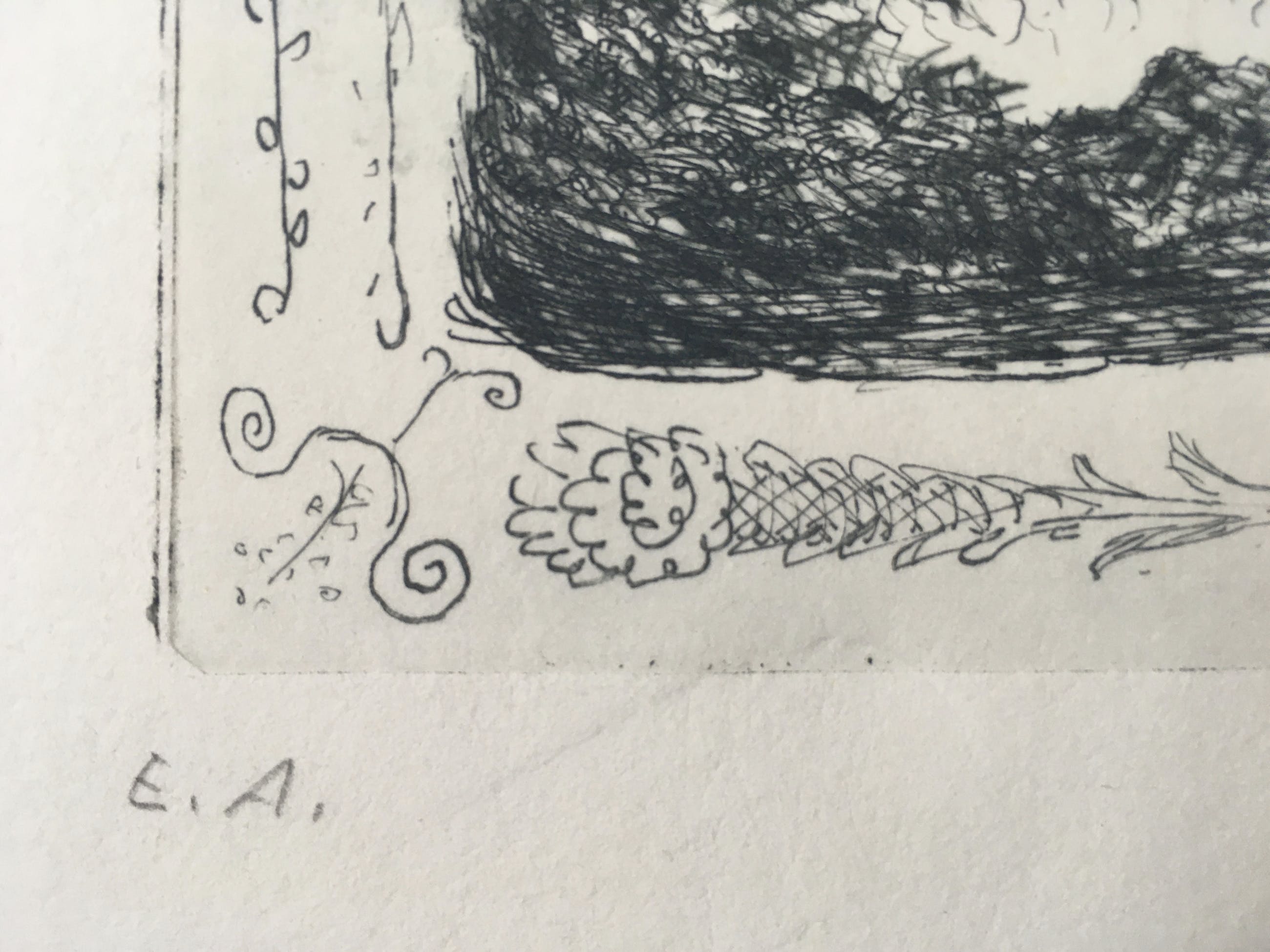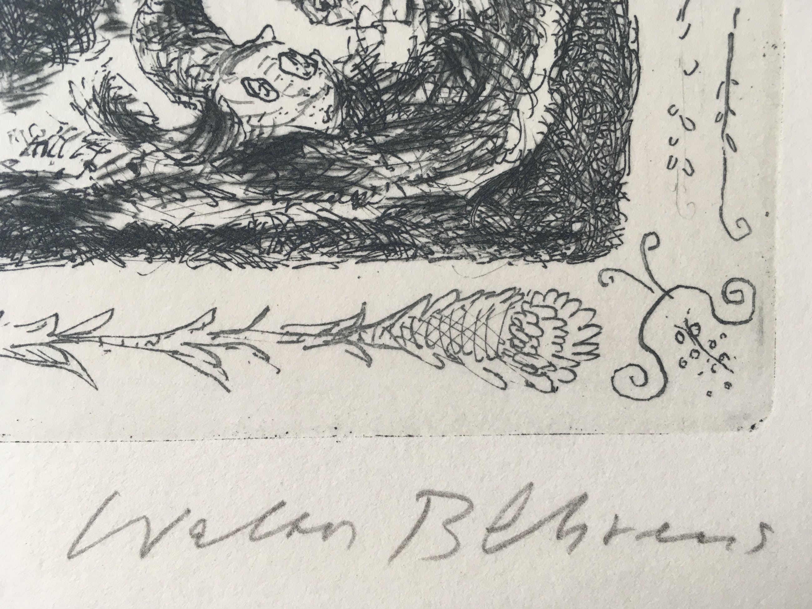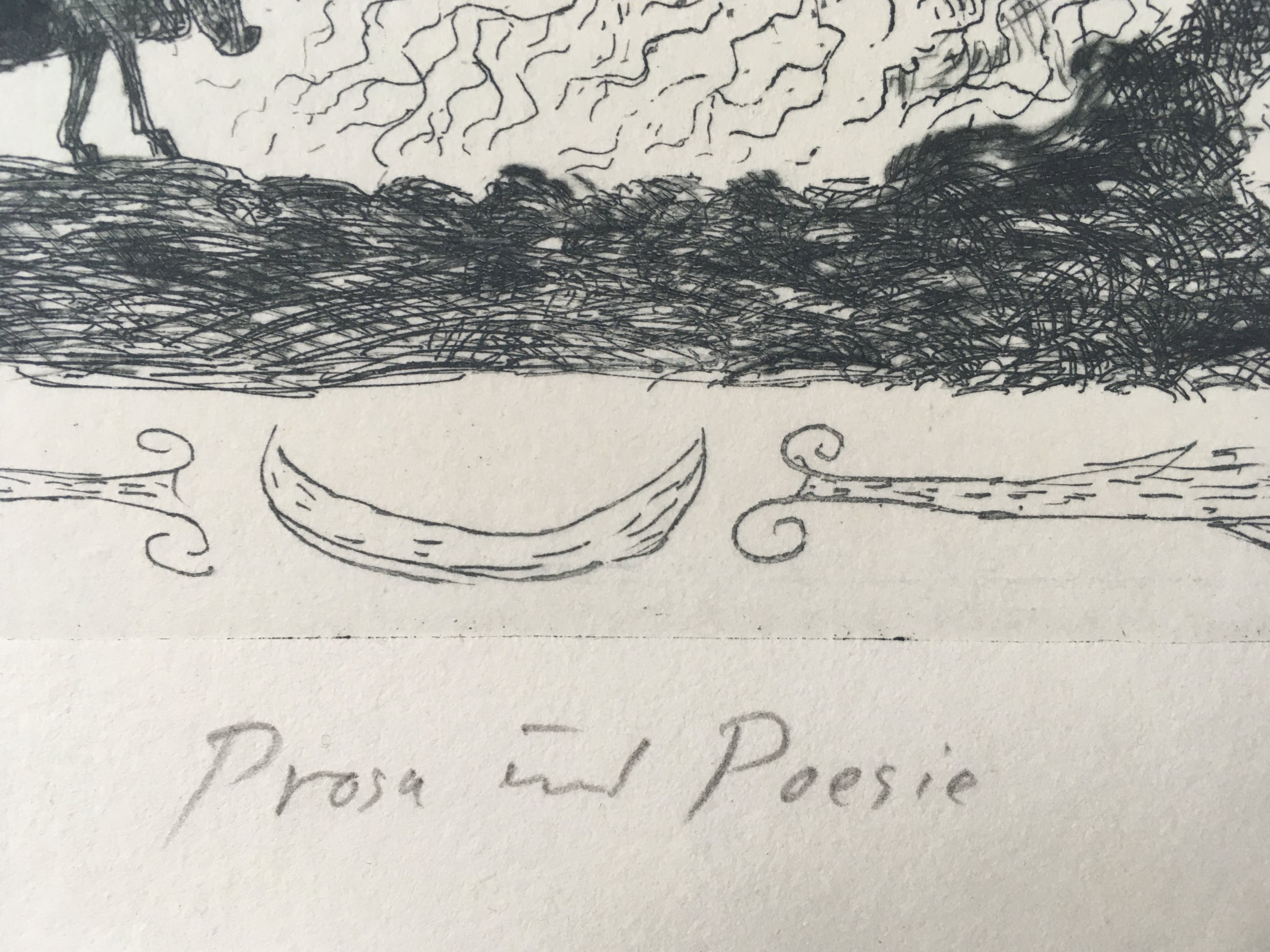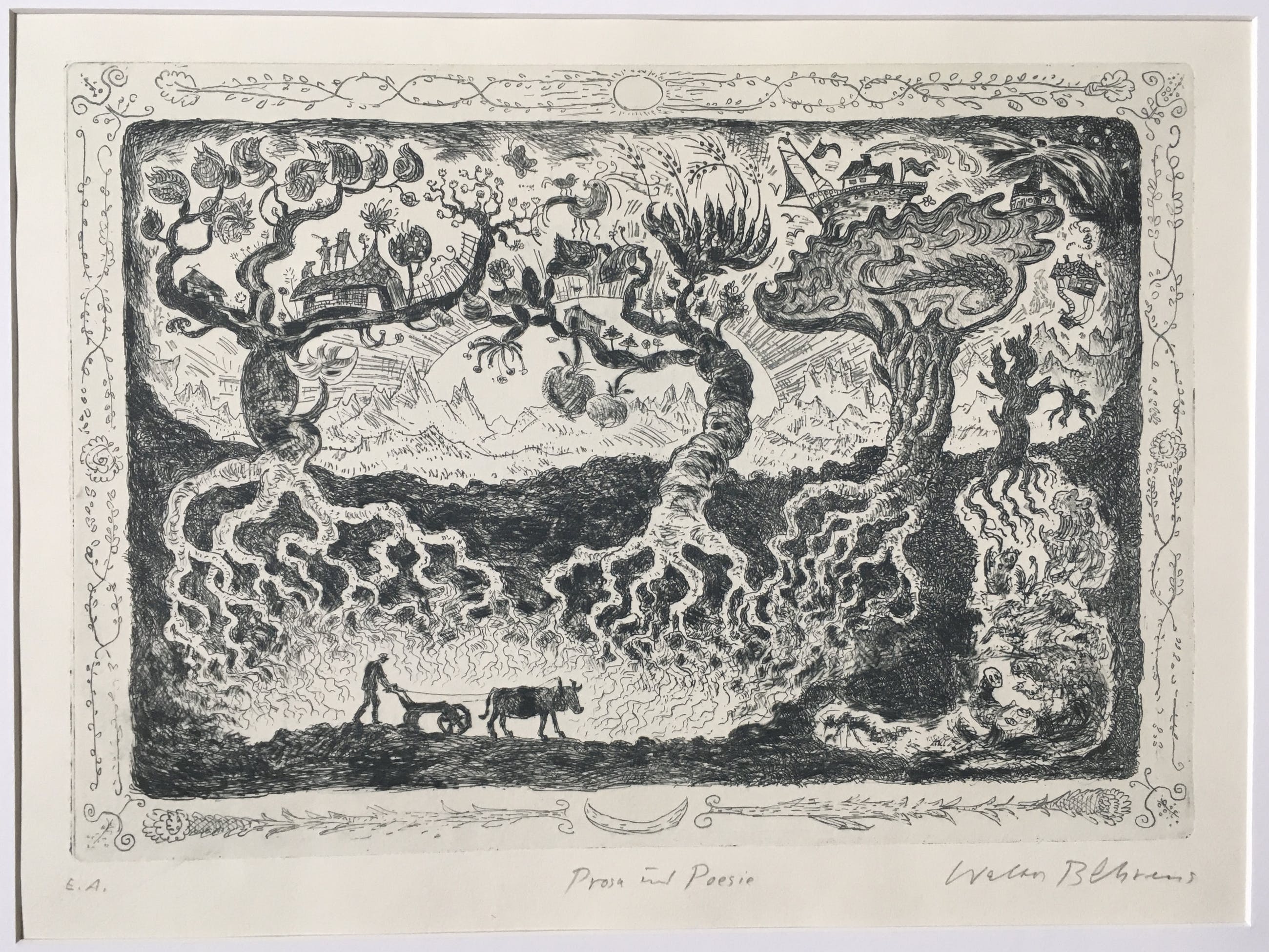 Mooi blad, bladmaat: 35x50 cm. Gemonteerd achter passe-partout. Gedrukt in donkerblauwe inkt. Onderaan: 'E.A., titel: 'Prosa und Poesie', en signatuur: 'Walter Behrens', alle in potlood.