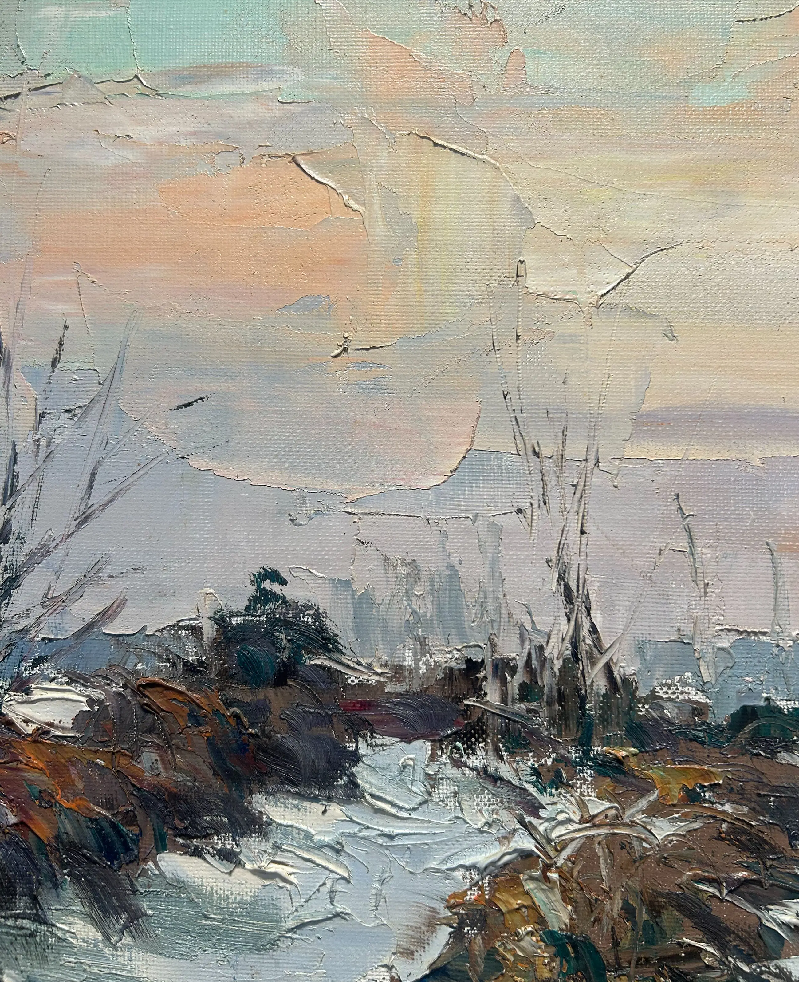 Het schilderij van Walter Jonckheere is ingelijst in een bijpassende lijst. Op de lijst zijn enkele lichte gebruikssporen zichtbaar, passend bij ouderdom en normaal gebruik. Deze hebben geen invloed op de presentatie van het werk. Het doek zelf toont op bepaalde plekken het karakteristieke textuur van het schilderdoek, wat aansluit bij de typische stijl van Jonckheere (zie foto’s voor details).