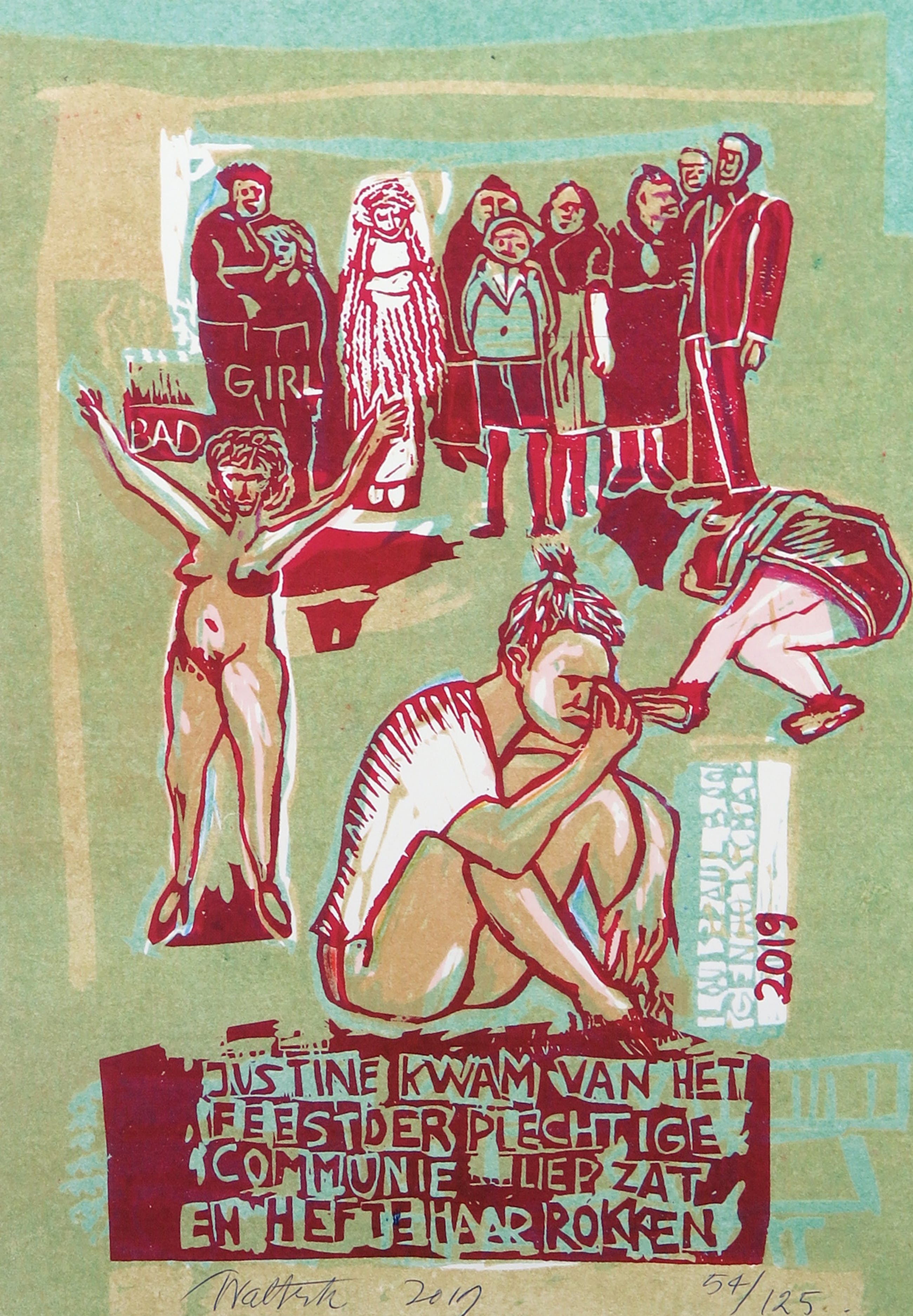 Lot van twee zeefdrukken van Walter Kerkhofs, gemaakt voor het Louis Paul Boon Genootschap. De linker prent komt uit 2019 en de rechter uit 2021. De gegeven maten zijn van één prent.