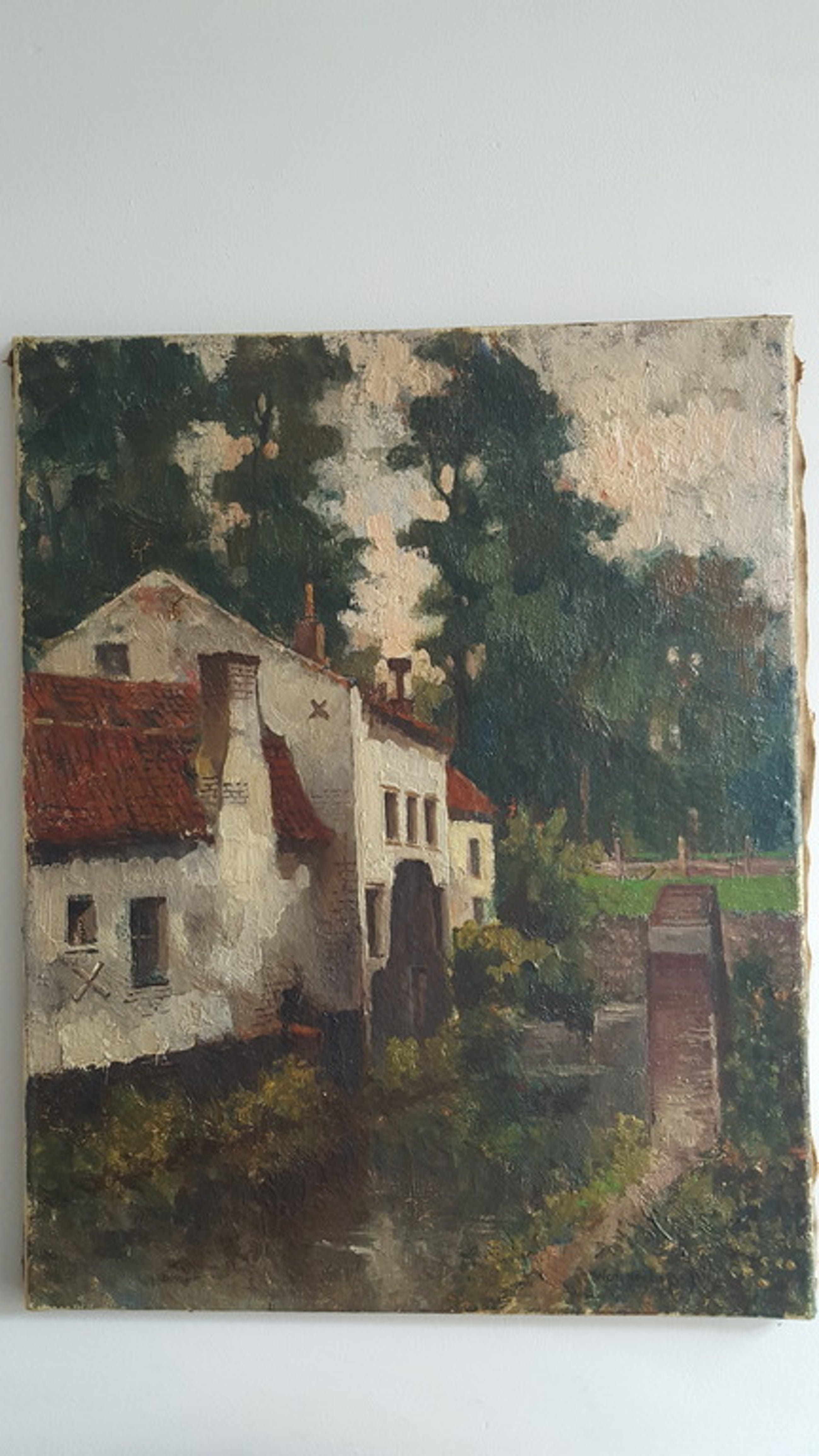 Landschap met huis aan water.Olie op linnen.Rechtsonder gesigneerd.