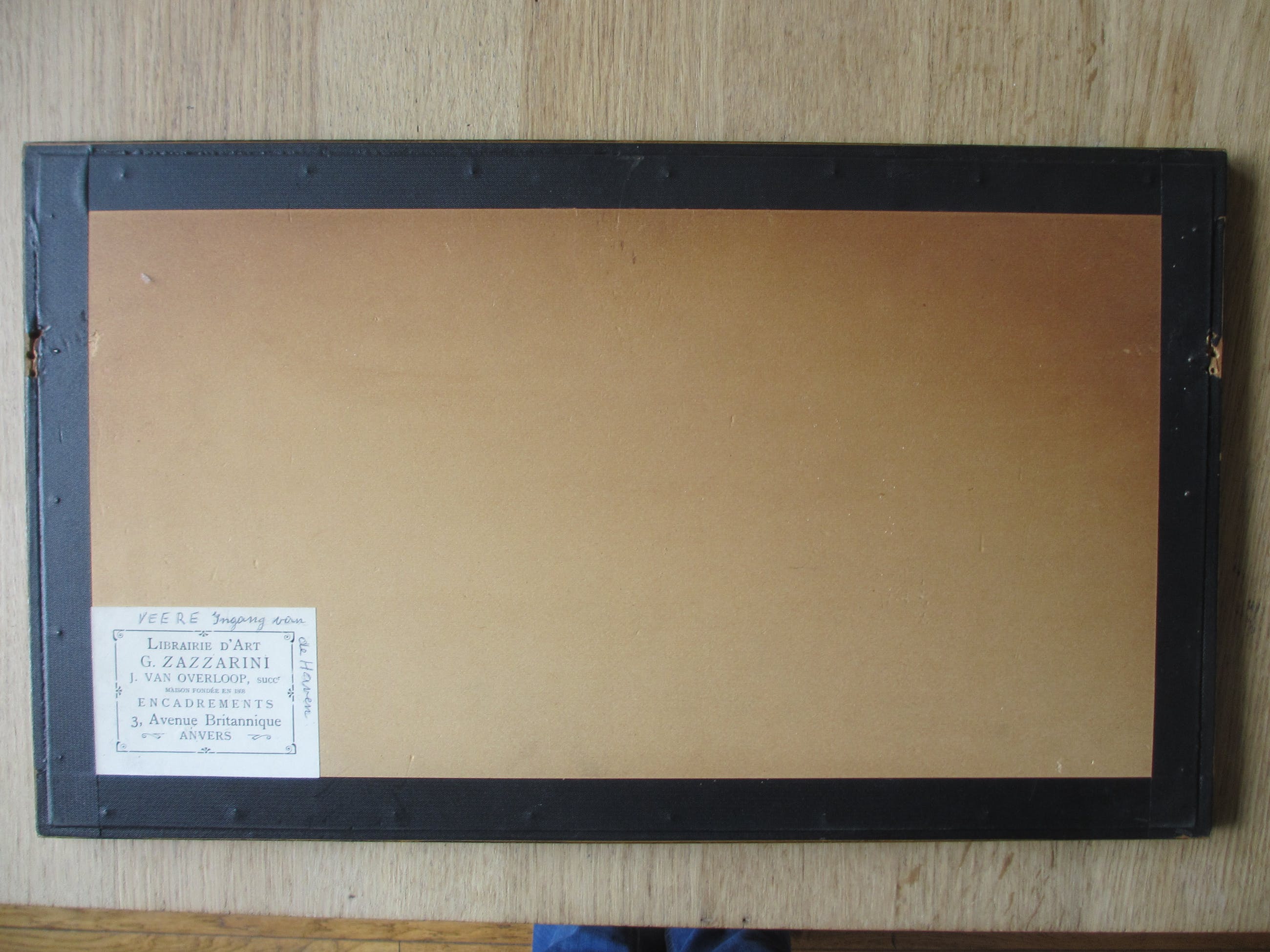 mooi in notenhouten lijst ets gezicht op Veere. papier is egaal verkleurd.