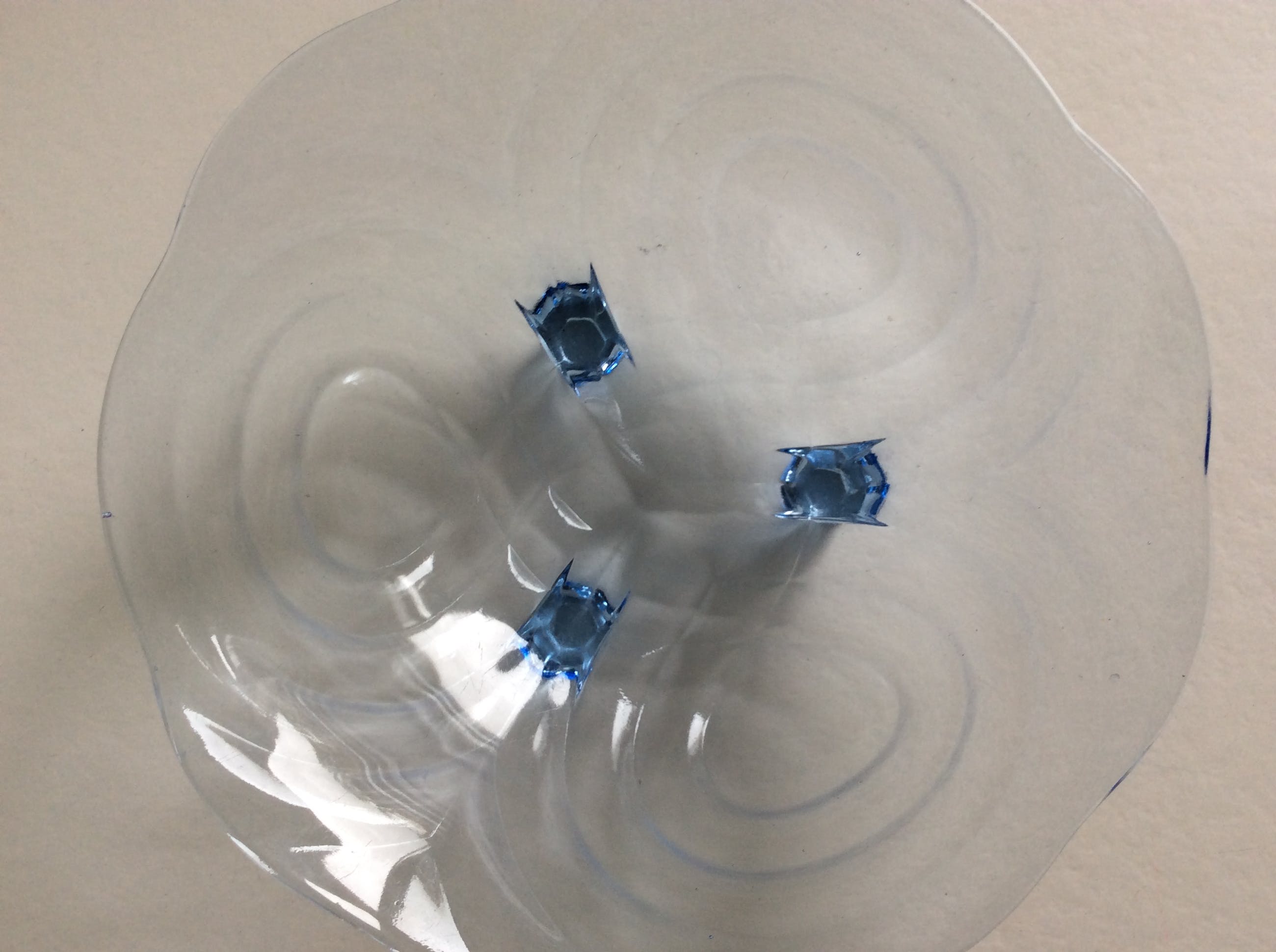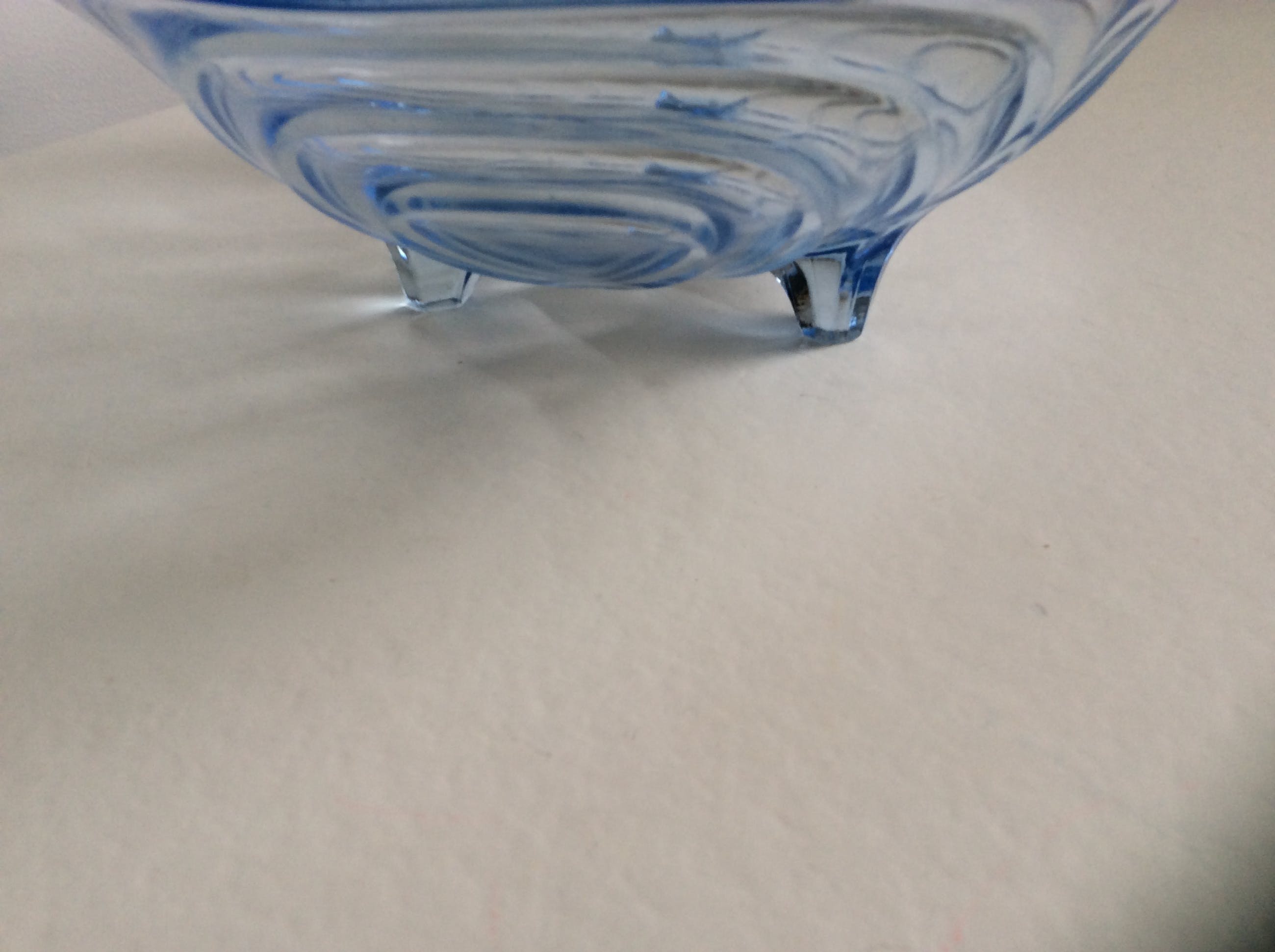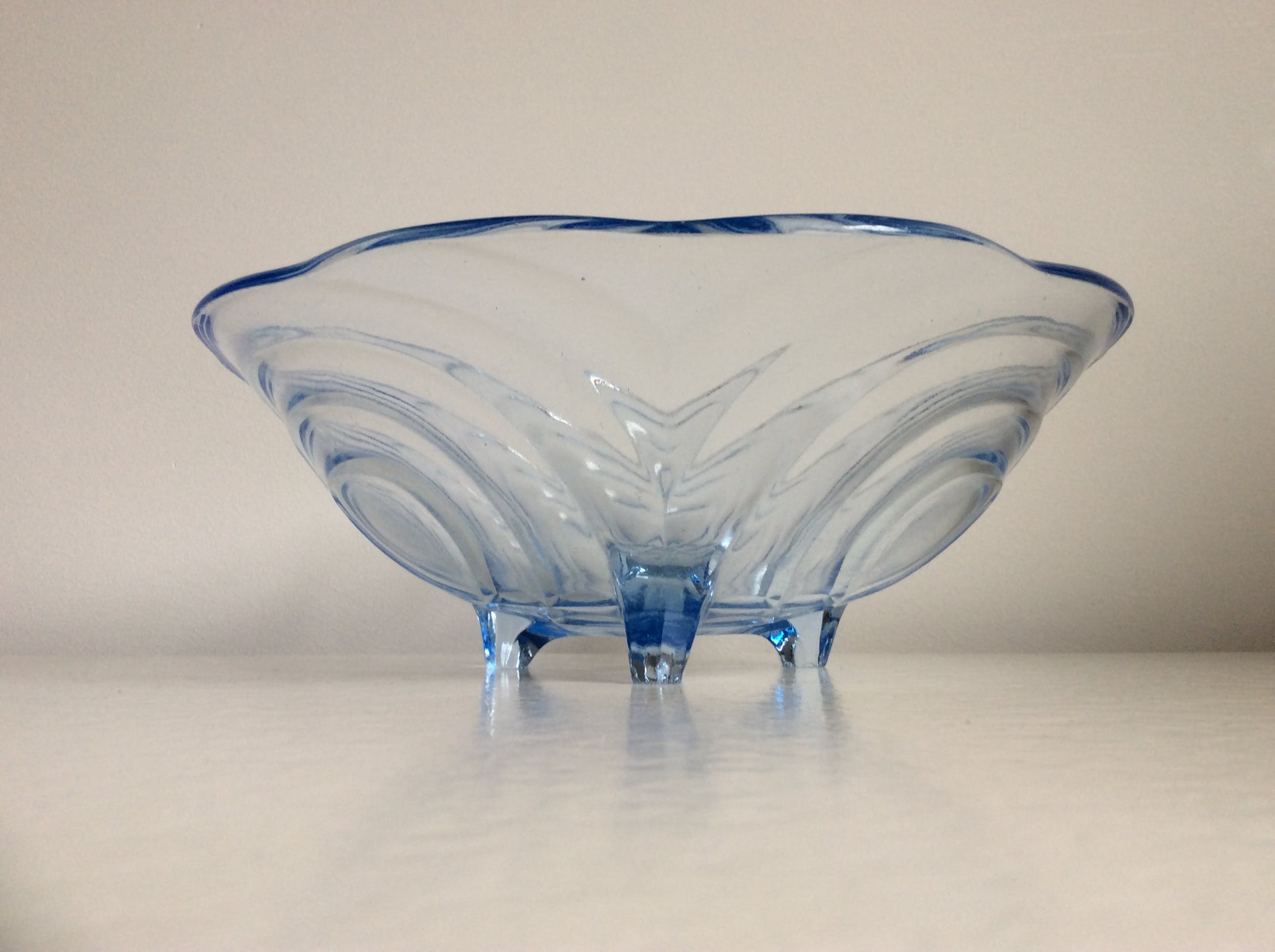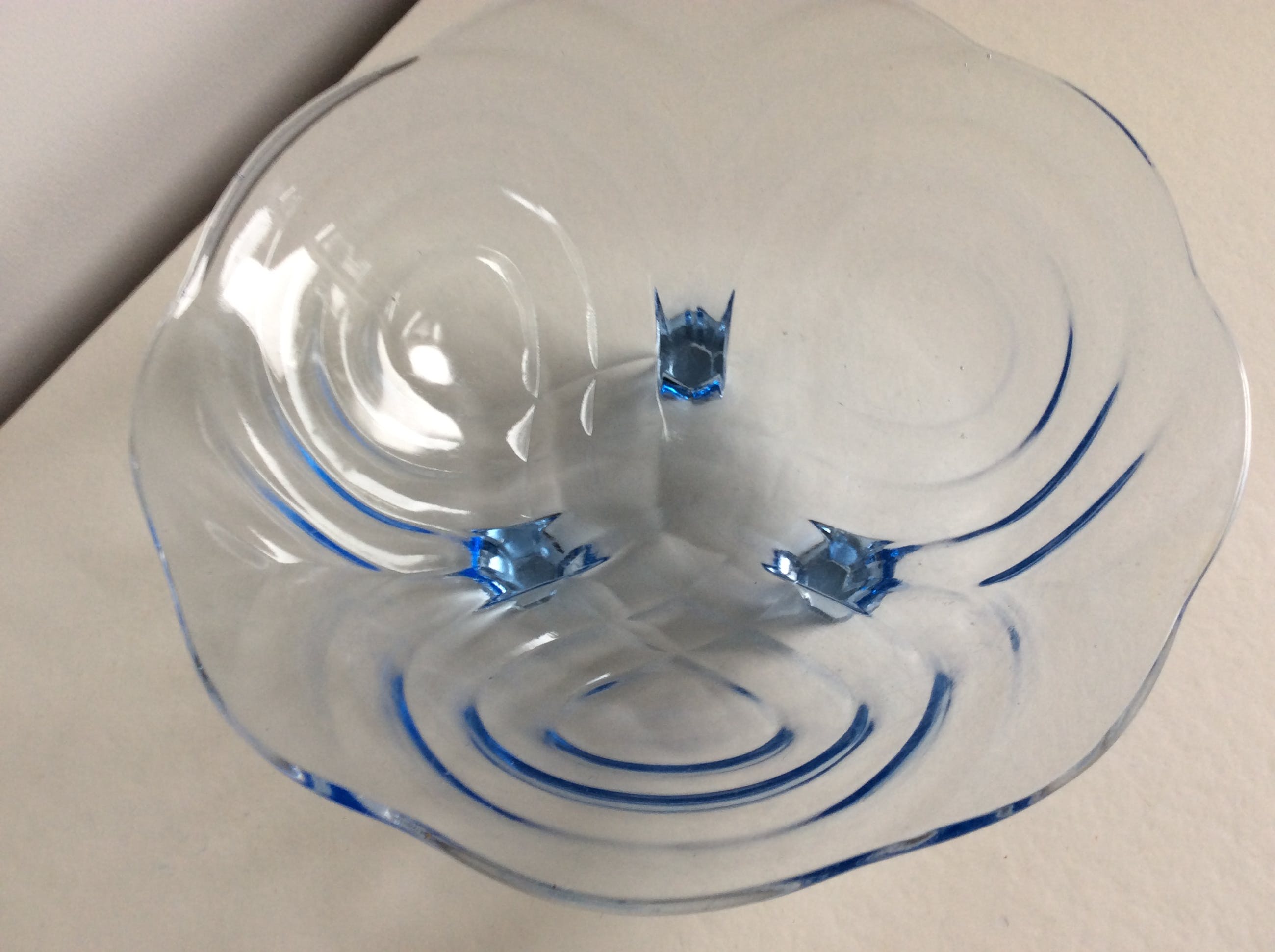 Art Deco fruitschaal “Rotterdam” van Walther & Söhne in lichtblauw persglas, ca 1937 of vroeger.Formaat max doorsnede 28,5 cm, hoogte 10 cm.Minimale gebruikssporen.