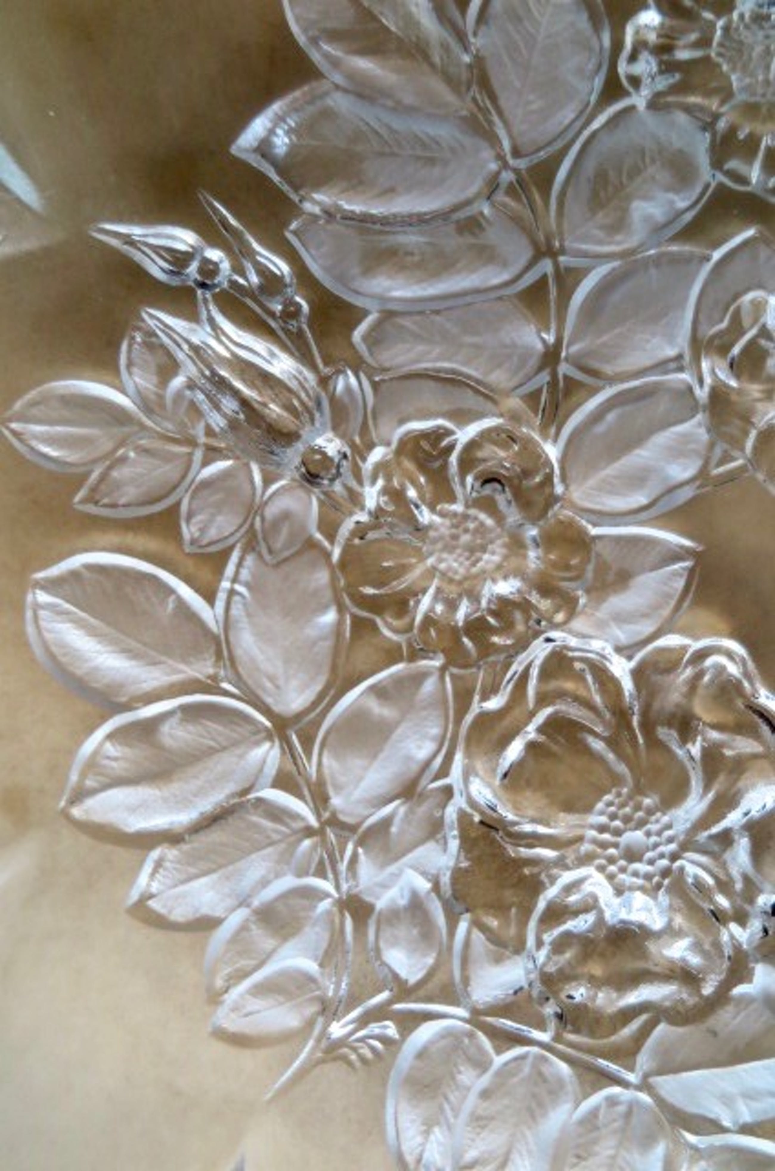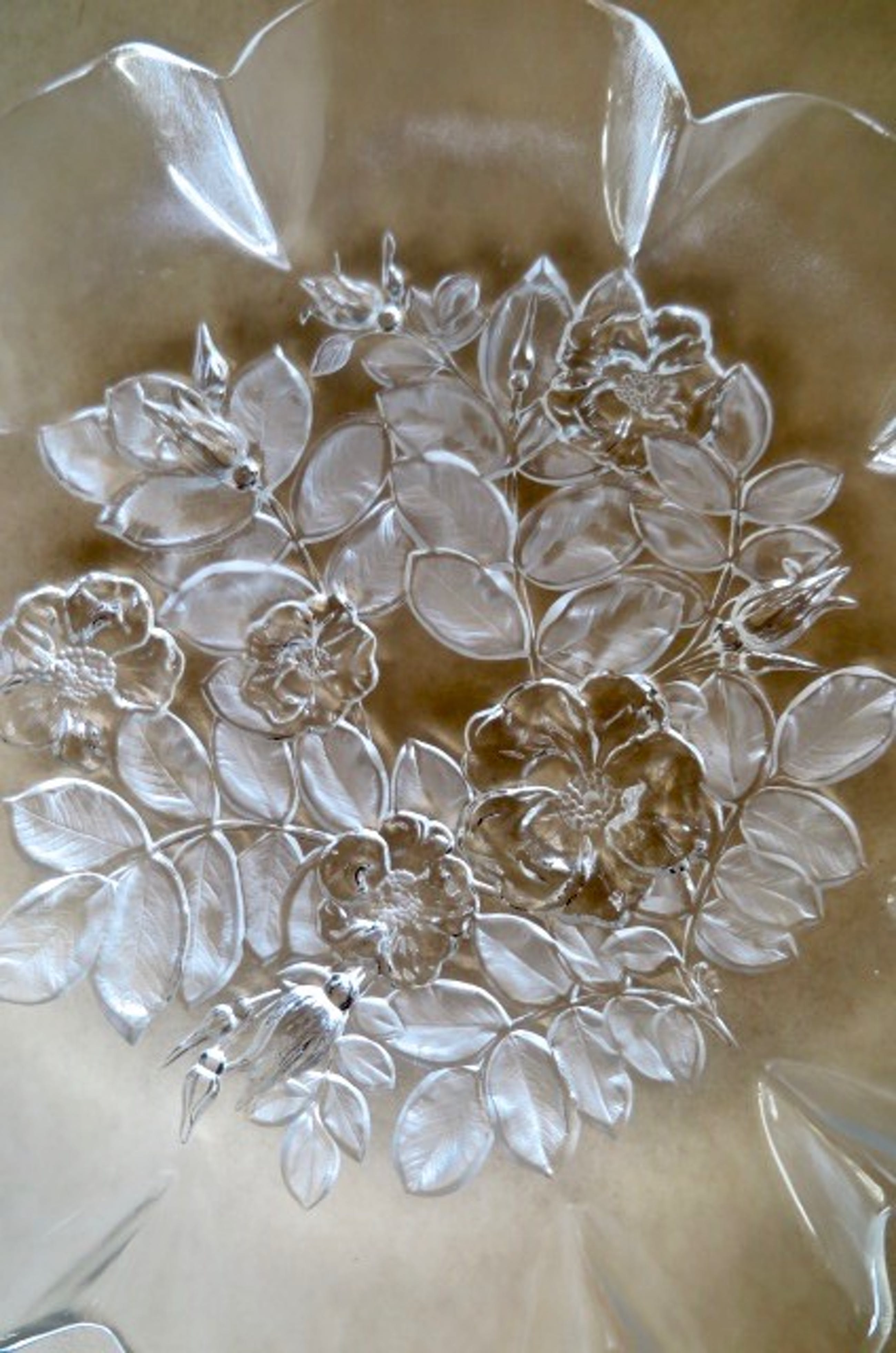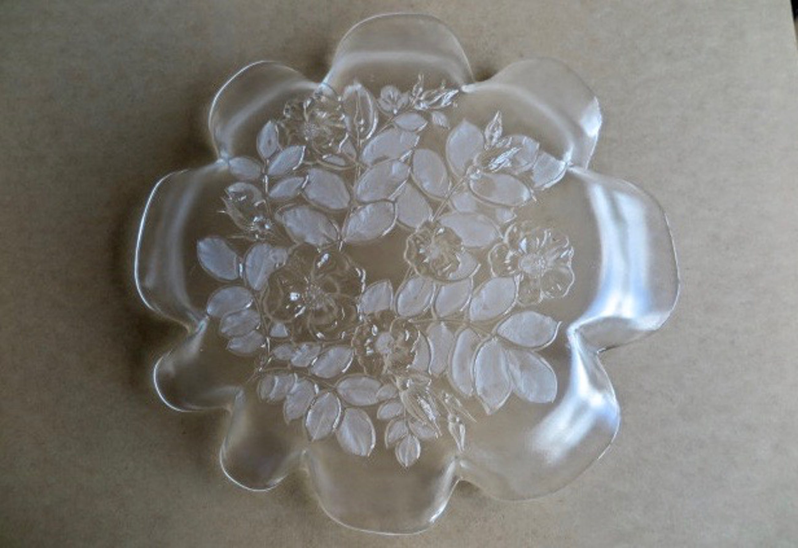 Van het bekende Duitse merk Walther. Romantische stijl. Zware kwaliteit. Fraaie waaiervorm (geschulpte/golvende boven-sierrand). Gedetailleerd geslepen met een floraal decor in reliëf. Twee bijpassende schaaltjes, gemerkt, ook van Walther, staan elders op de veiling.