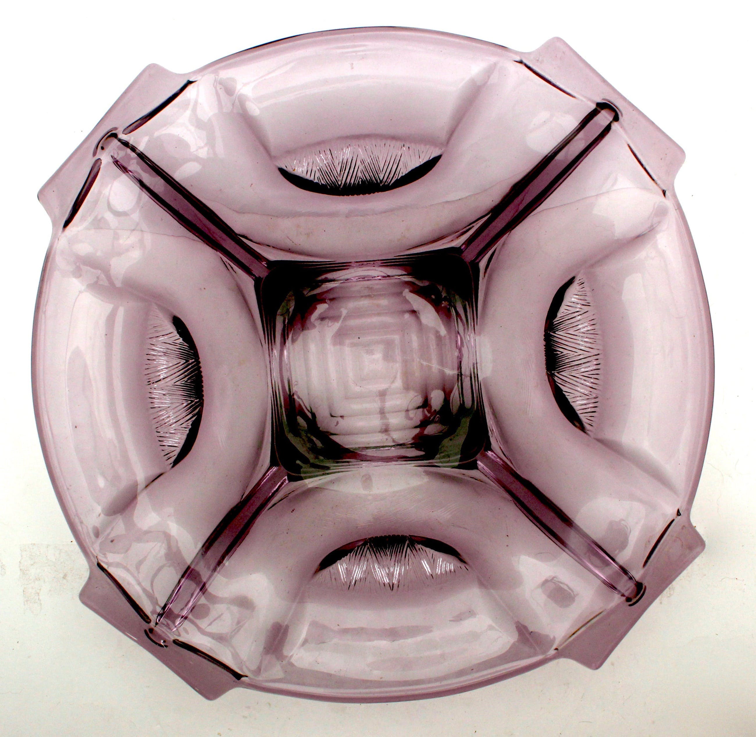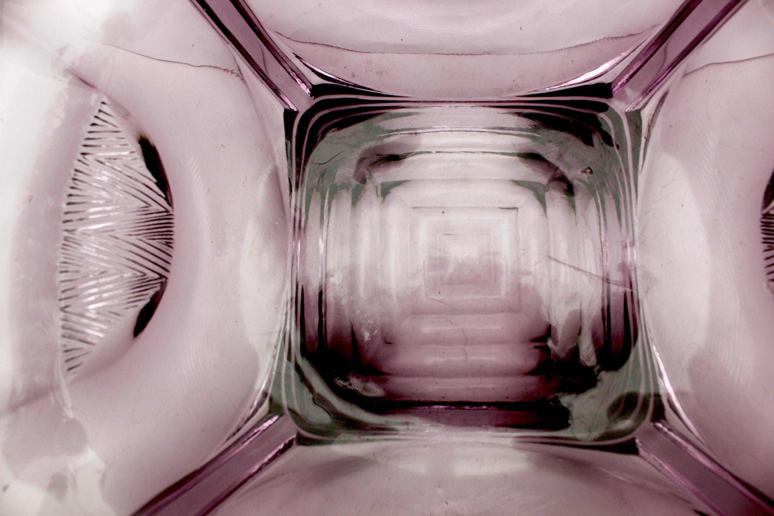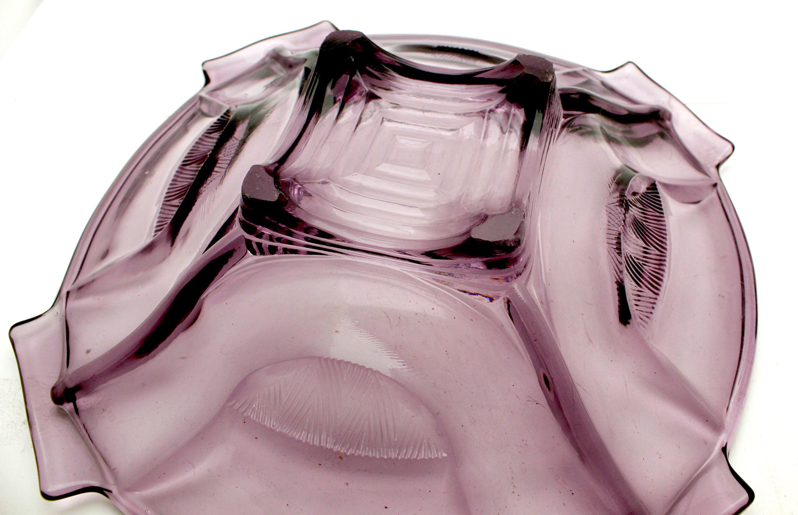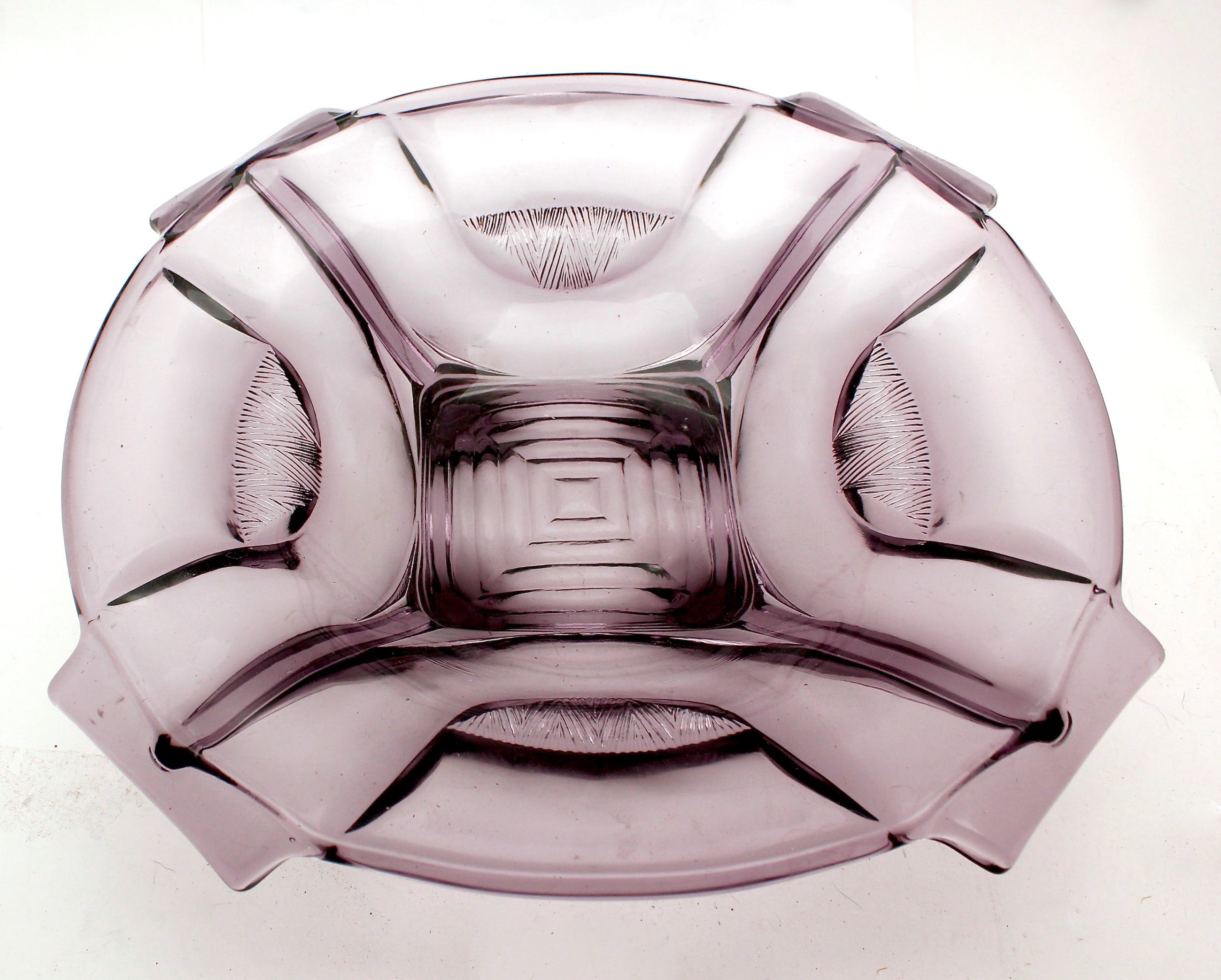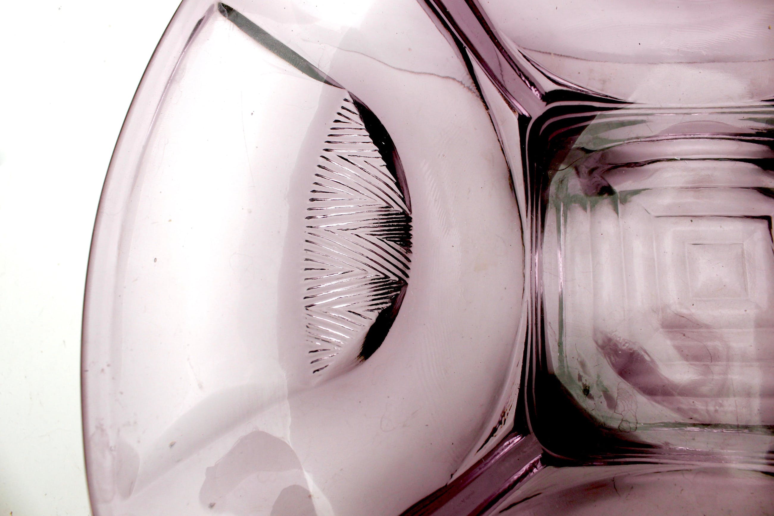 Augustus Walther & zonen zalmkleurige schaal met het decor 'Sigrid' uit 1936. De gebruikte kleur behoort de inmiddels zeldzamere kleuren. De schaal is in goede gebruikte staat met de gebruikelijk gebruikssporen aan de voet.Hoogte: ca. 6 cmDiameter: ca. 32 cm August Walther & Zn was een 19e eeuwse glasfabiek uit Dresden, die samen met de Saksische Glasfabriek in 1932 opging in de "Sachsische Glasfabrik August Walther and Sohne AG". Zij waren vooral beroemd om hun art deco vrouwenfiguren en kunstglasvazen en -schalen, tot na de Tweede Wereldoorlog.