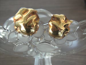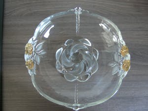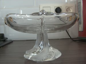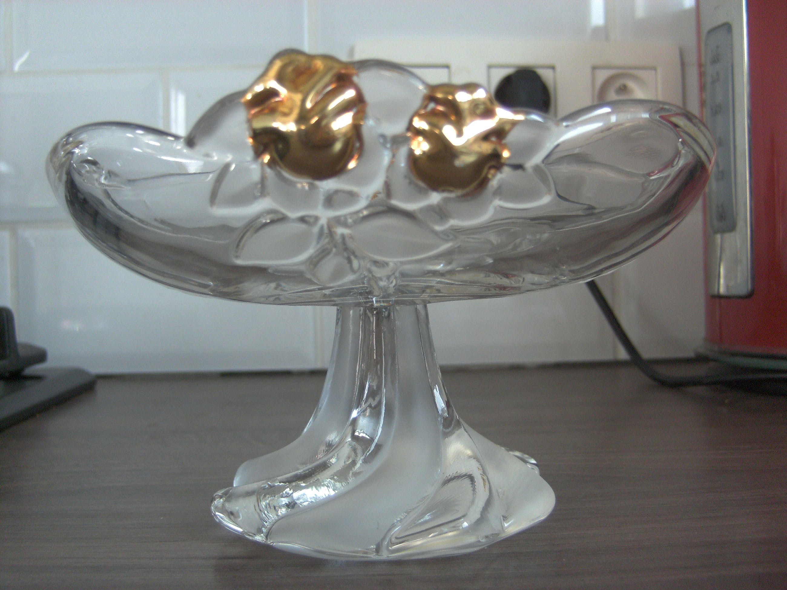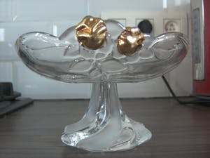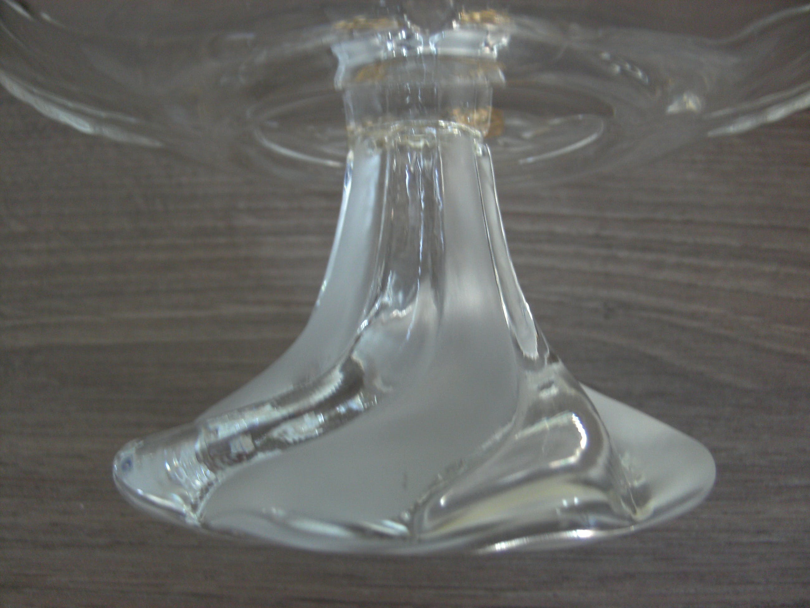 Zeer mooi schaaltje Walther Glass. Voet afwisselend blinkend en mat glas. Schaaltje met bloemetjes in goudkleur en blaadjes mat glas. Zie foto's