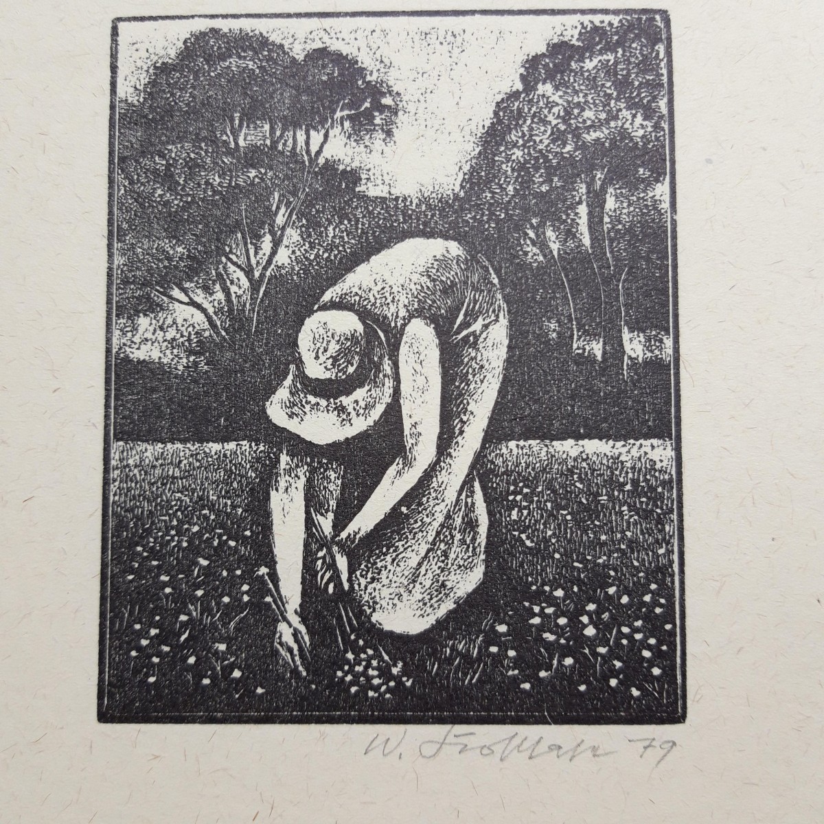1-FARBIG SCHWARZER HOLZSTICH VON WALTHER KOHLHASE 'BLUMENPFLÜCKENDES MÄDCHEN' AUF CHAMOIS HADERN. FORMAT 20x29 CM. UNTEN RECHTS MIT BLEISTIFT SIGNIERT UND DATIERT 'W. Kohlhase 79'. ERHALTUNGSZUSTAND: EXCELLENT