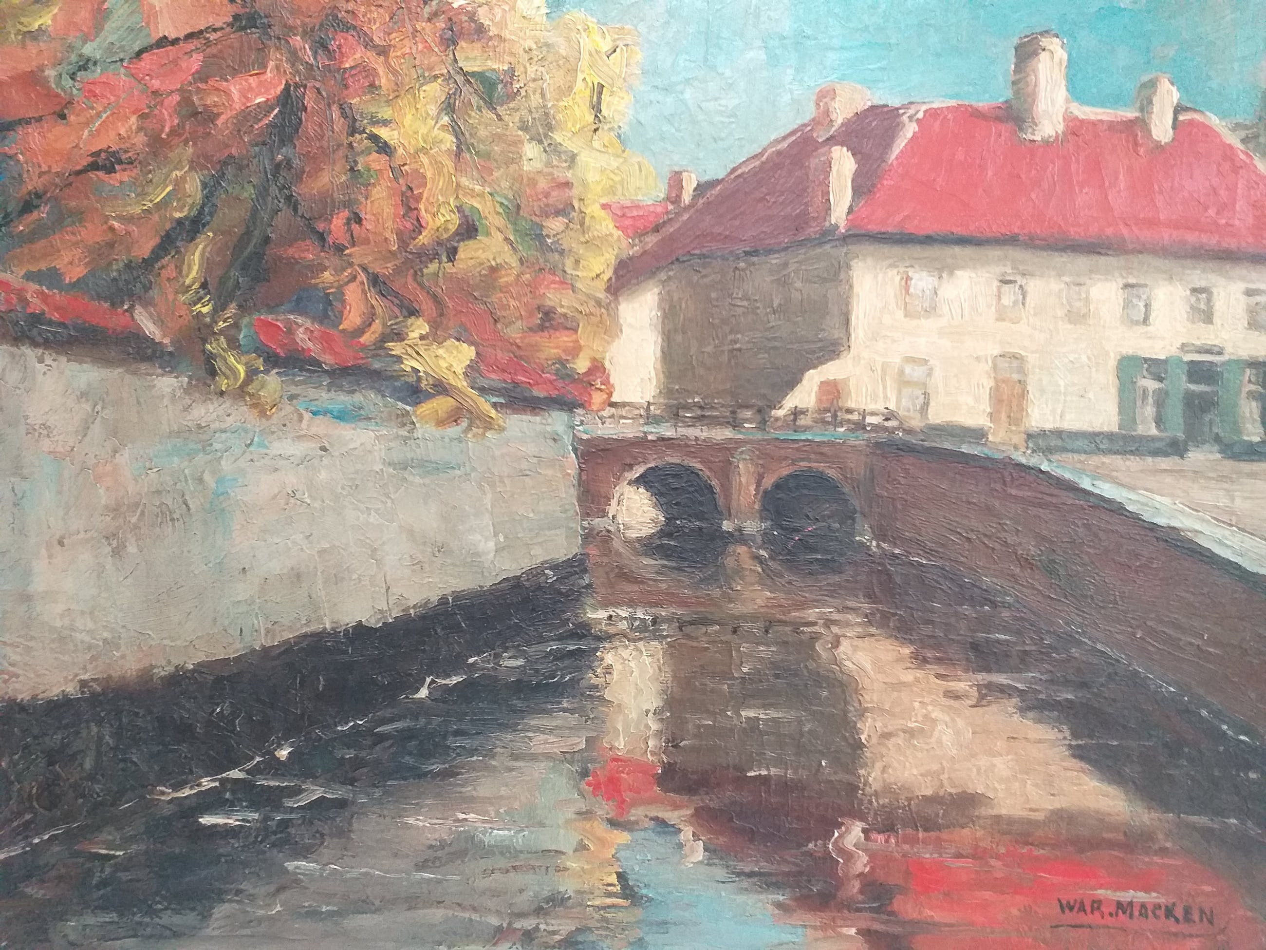 War Macken is de vader van Mark Macken (1913-1977), bekend beeldhouwer en voormalig docent en directeur aan de Academie van Schone Kunsten in Antwerpen. Mark Macken werd tijdens WOII als politieke gevangene gedeporteerd naar Duitsland waar hij de leiding kreeg over een tekenbureau voor het opstellen van V1 en V2 rakettekeningen op echte schaal. Mark Macken implementeerde opzettelijk fouten in de ontwerpen als een daad van sabotage.War Macken was tevens ook een succesvolle meubelmaker, samen met zijn broer Jan Macken die tijdens WOII werd gedood omdat hij bij het verzet was aangesloten. Jan Macken had één zoon, Jozef Macken, waarover War Macken zich ontfermde omdat Jozef's moeder, depressief omwille van de dood van haar man, niet in staat was haar zoon groot te brengen. De laatste foto, met dank aan Peter Macken, toont de vrouw van Jozef en moeder van Peter, poserend op de brug over de Demer aan de Kaai, enige tijd na WOII. Zij woonde en werkte in het huis rechts van het gebouw afgebeeld op de foto en het schilderij. Tijdens de late jaren '60 werden er werken uitgevoerd waardoor de brug nu niet langer herkenbaar is. Enkel het schilderij van Petrus Josephus Eduardus "War" Macken blijft over als een levendige en tijdloze herinnering aan de Brug over de Demer aan de Kaai in Diest.