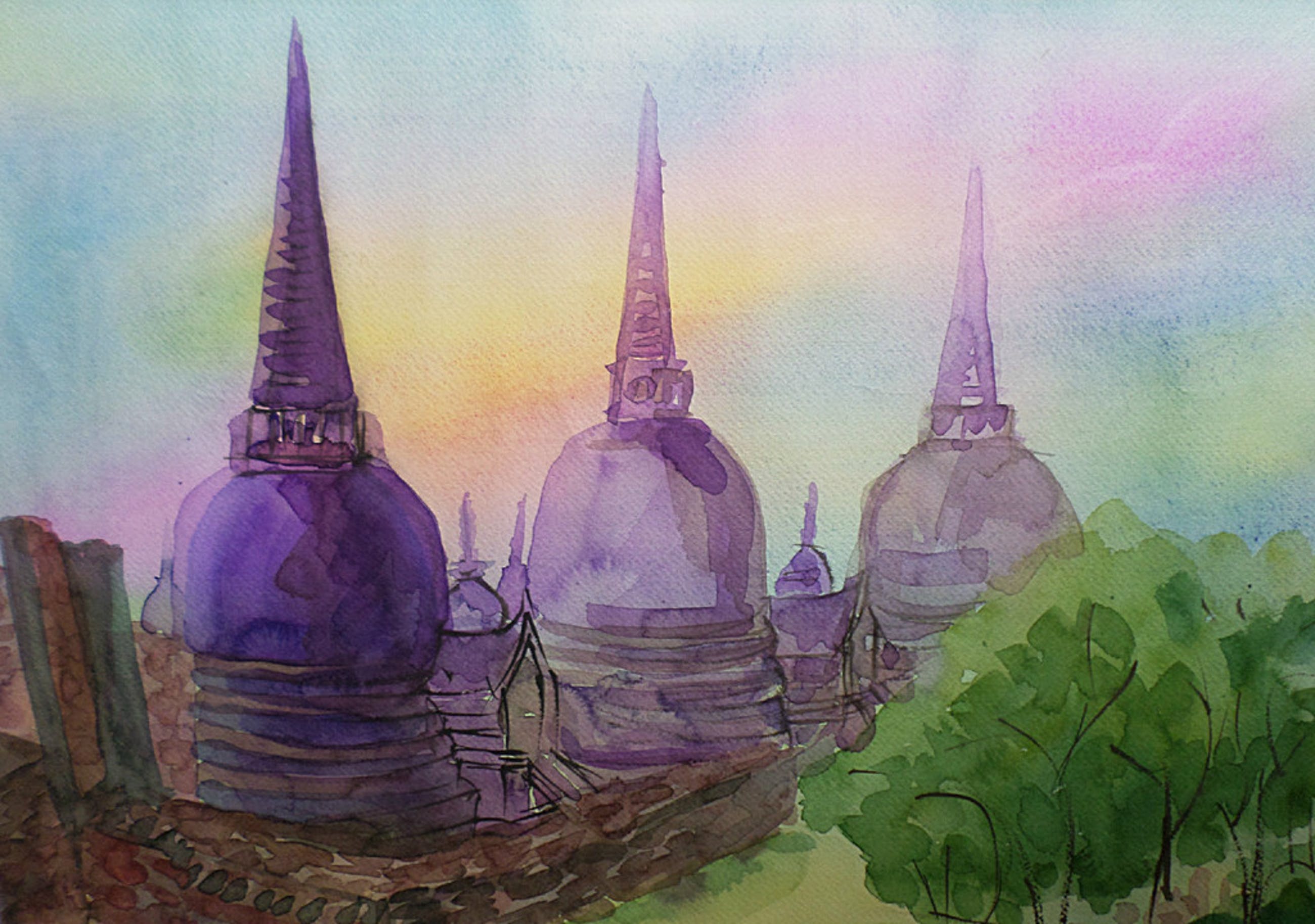 Schitterende aquarel van Wat Phra Si Sanphet in Ayutthaya (Thailand) gezien vanaf het noord-oosten. Prachtig ingelijst (Barth 2012), achter glas en passepartout.