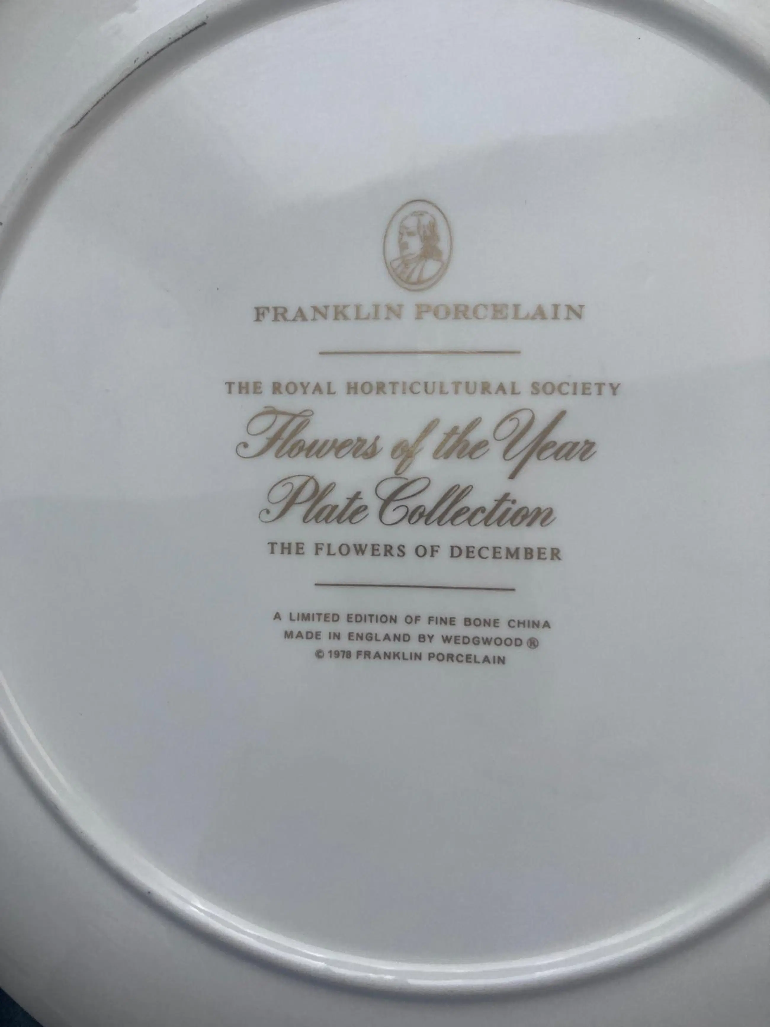 Prachtig en volledig gaaf Wedgwood bord uit de serie Flowers of the Year Plate Collection (Franklin Porcelain van 1977-78): "Bloemen van de maand december" (Frl_4).