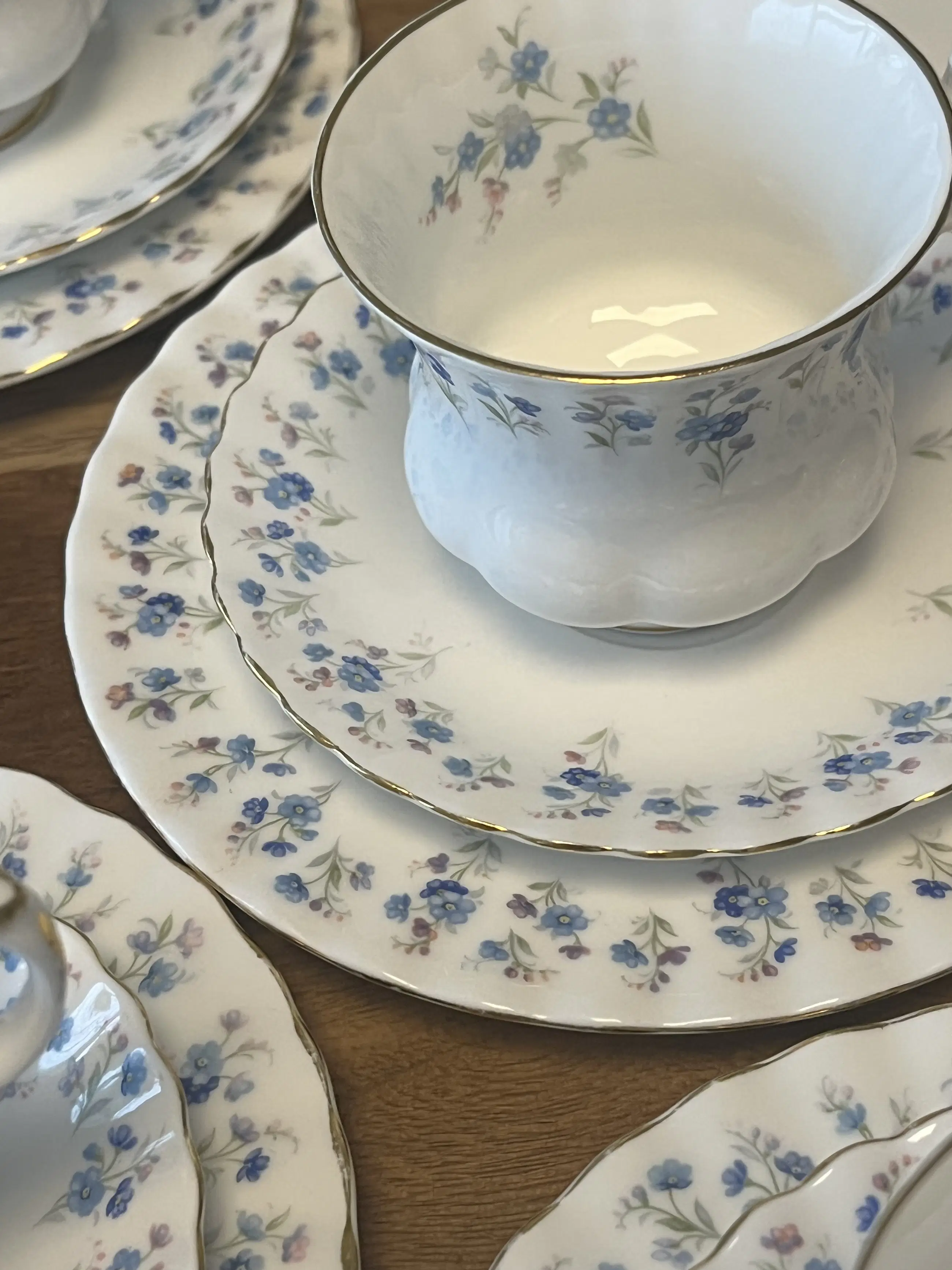 Het Royal Albert Memory Lane-patroon is versierd met elegante blauwe vergeet-me-nietjes langs de rand, geaccentueerd met een gouden rand. Het taart-/serveerbord is in nieuwstaat. Afmetingen: 26 × 23 cm. De set van 5 kleine bordjes is in goede staat. De gouden rand kan licht versleten zijn. Je moet echt goed kijken om slijtage te zien. Afmetingen: d = 16 cm. Geen chips of barsten op de bordjes. Set van 5 kopjes en schoteltjes. Eén kopje koffie is niet in perfecte staat. U kunt dit zien op de laatste foto.
