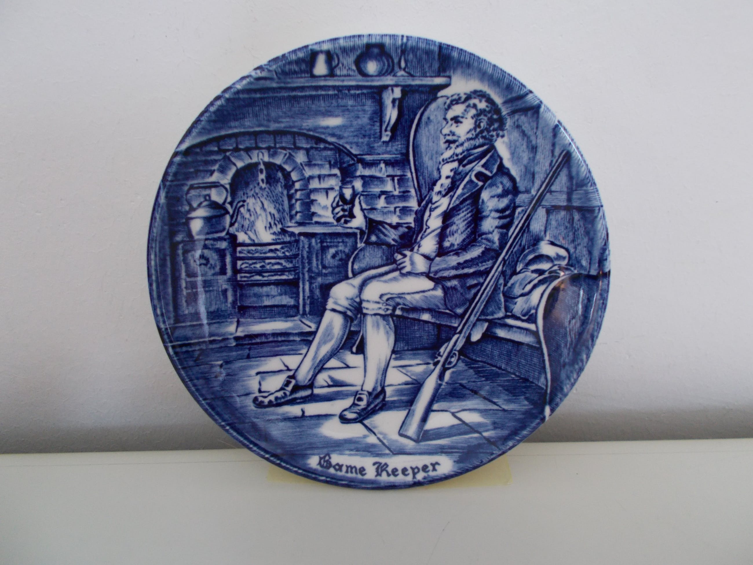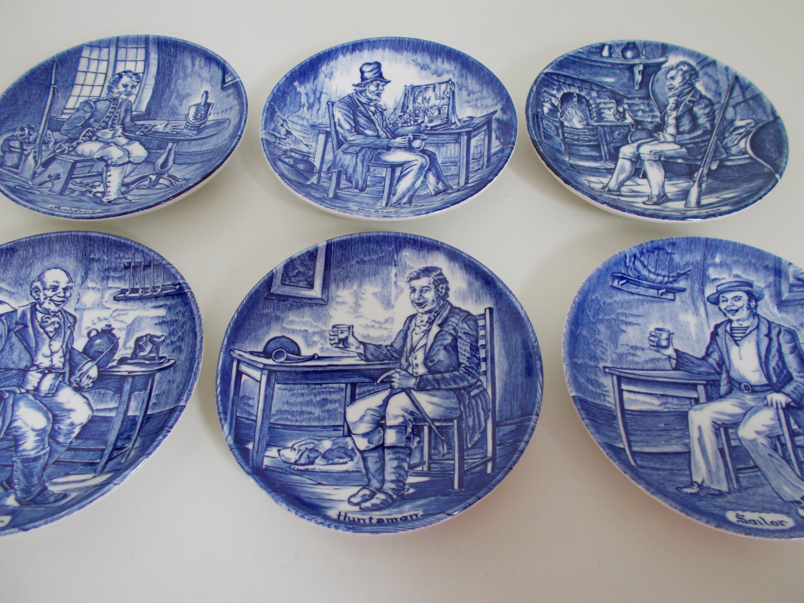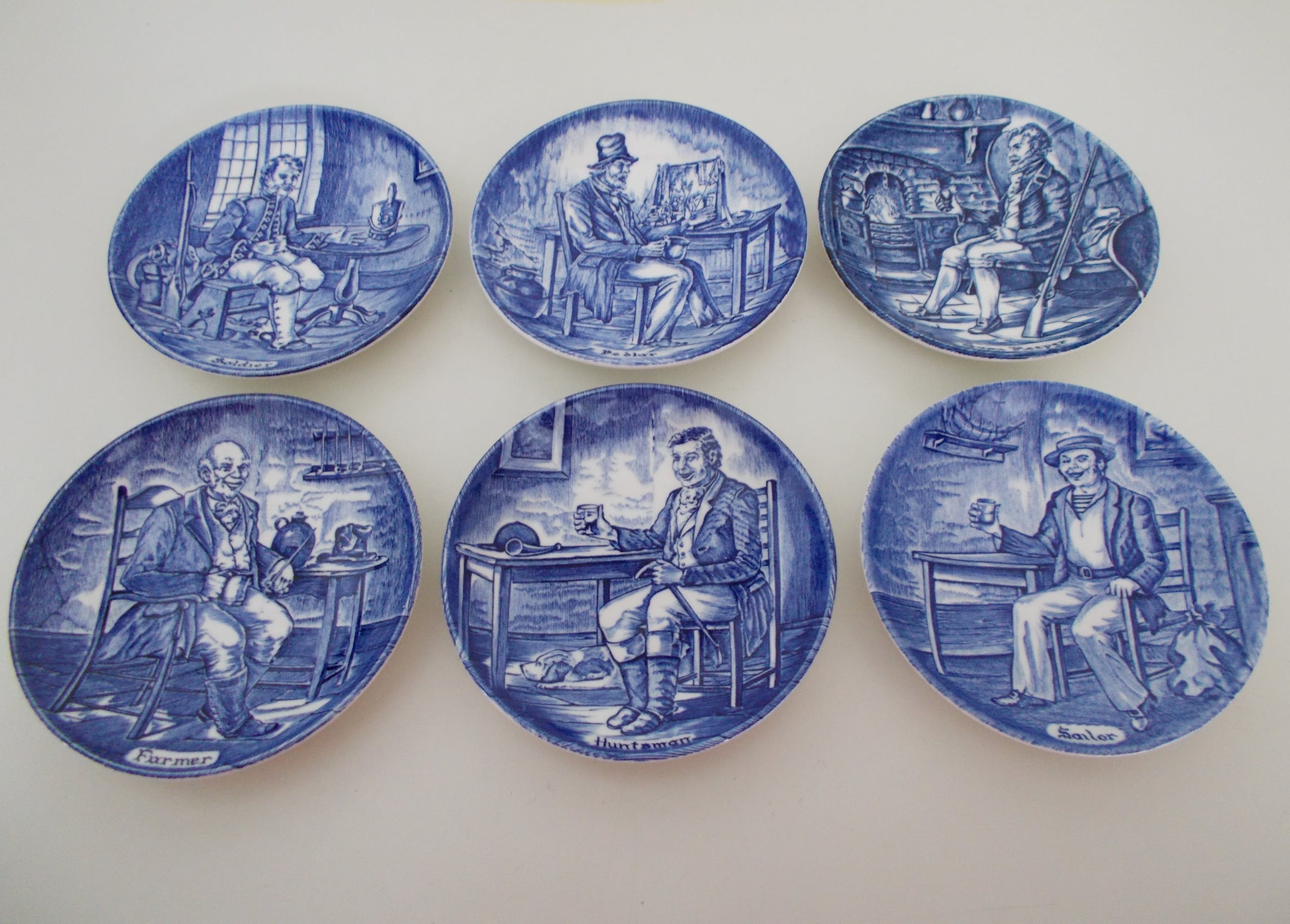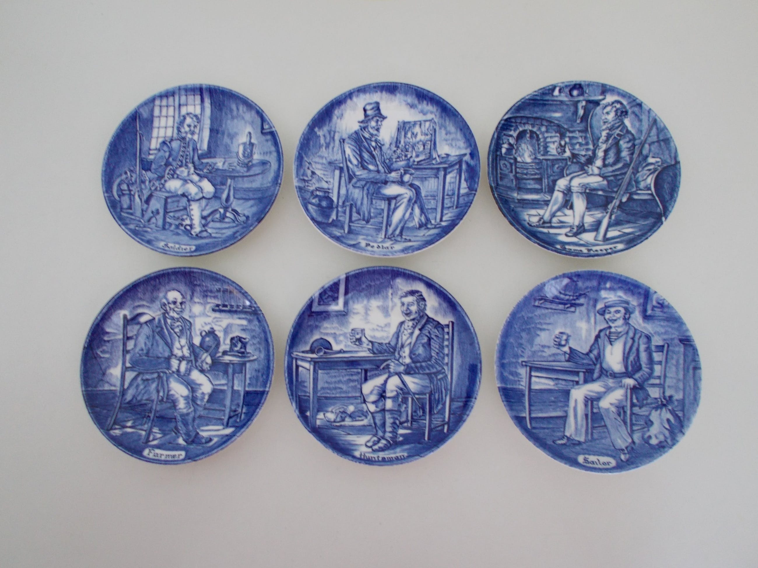 Set van 6 Wedgwood bordjes (Flow Blue Small Tradesmen Plates).Enoch Wedgwood Tunstall Ltd. England. Trade mark founded in 1835 Elk bordje met een interieurtafereel en een andere beroepsgroep. 1. Soldier (soldaat)2. Pedlar (marskramer)3. Game Keeper (spelhouder)4. Farmer (landarbeider)5. Huntsman ( jager)6. Sailor (zeeman). Doorsnede van de bordjes is 10,5cm