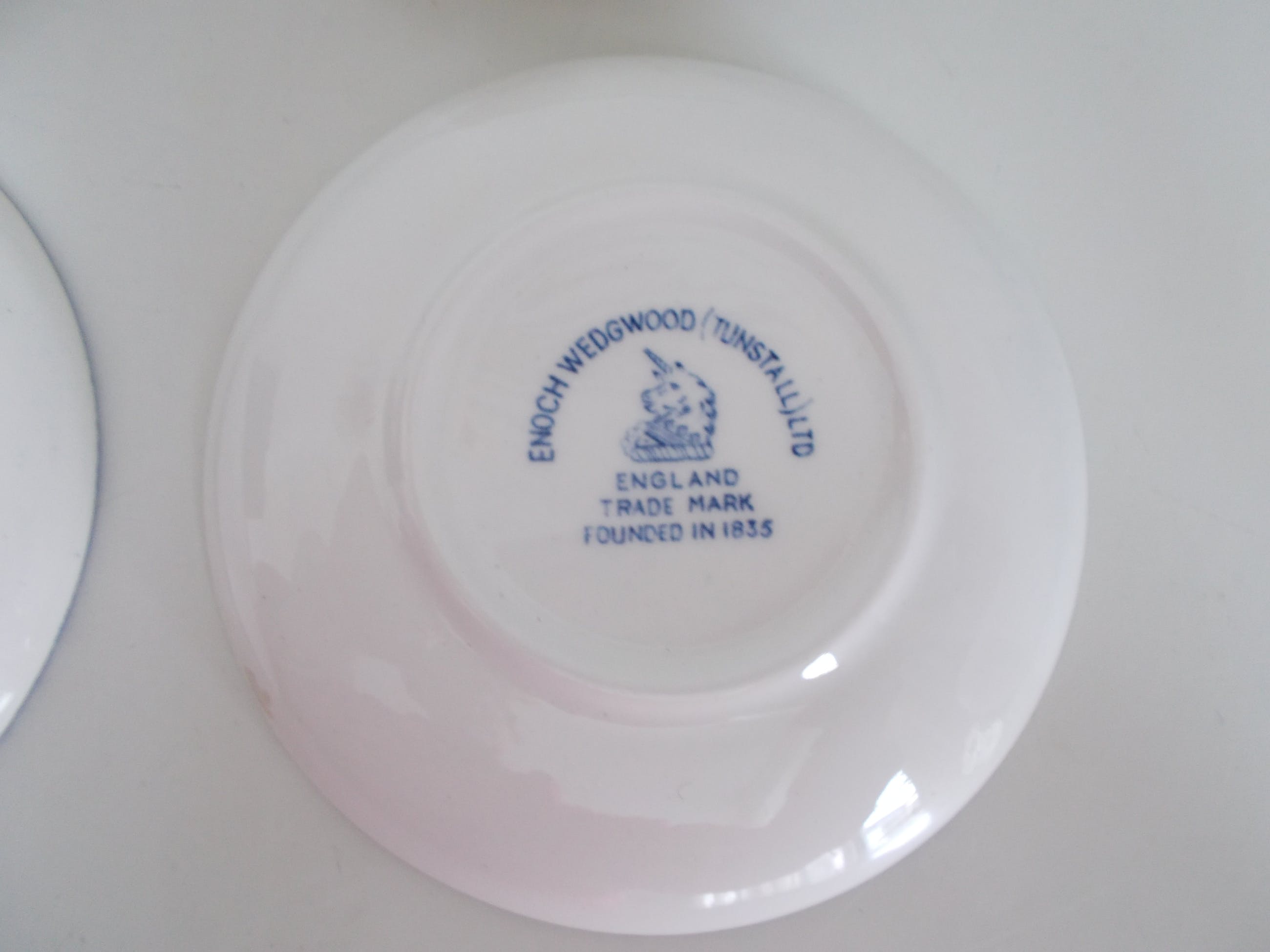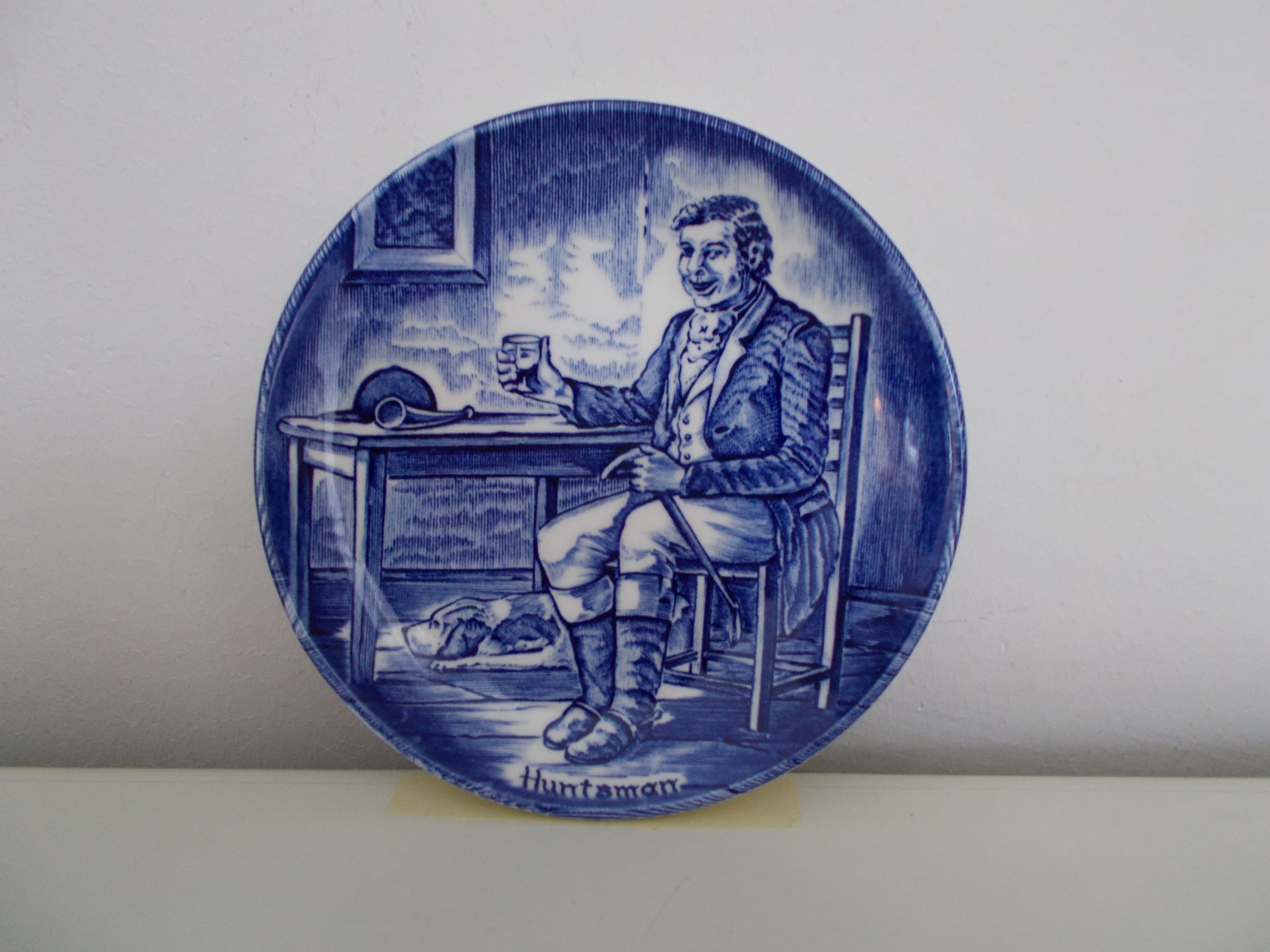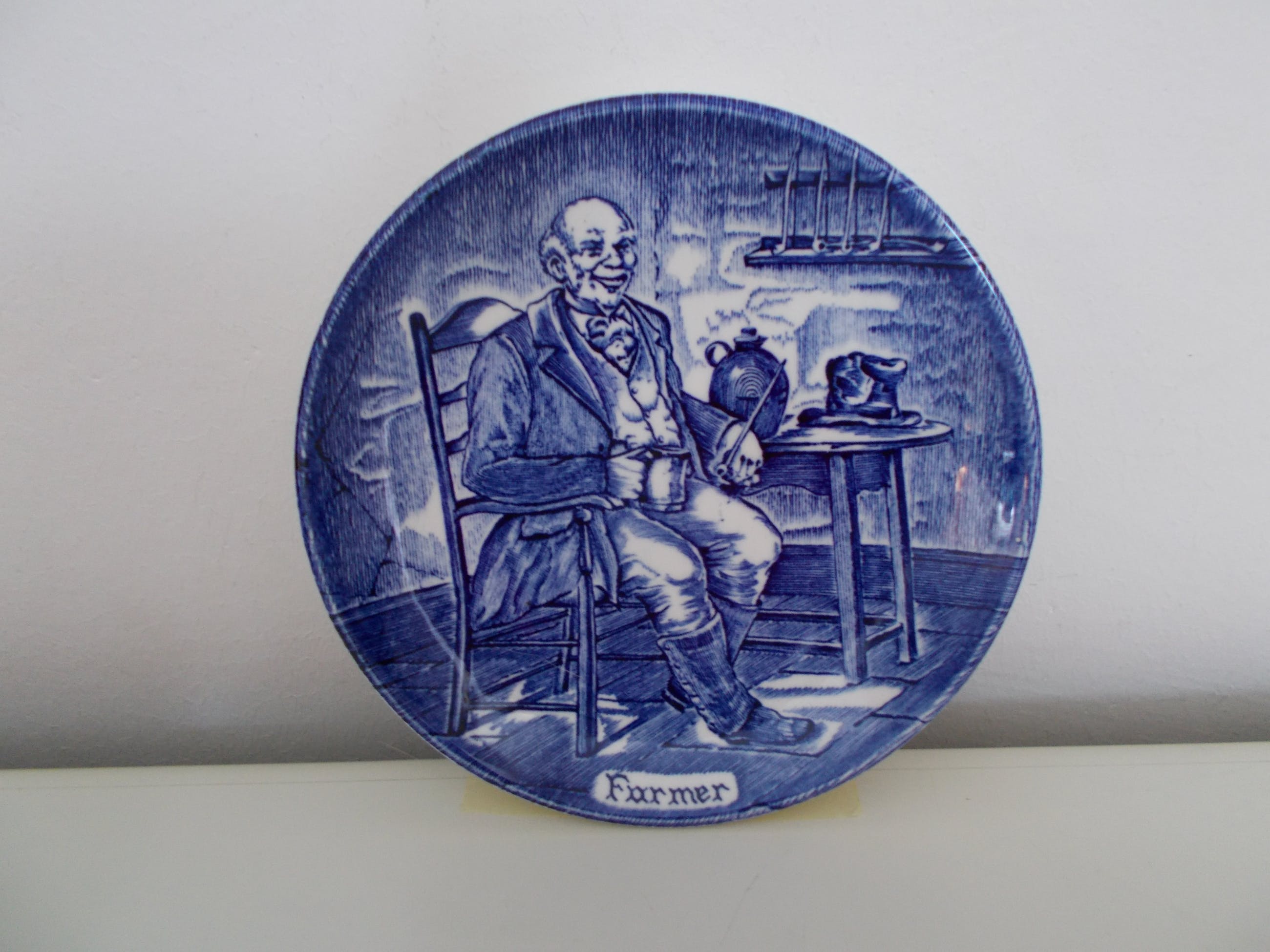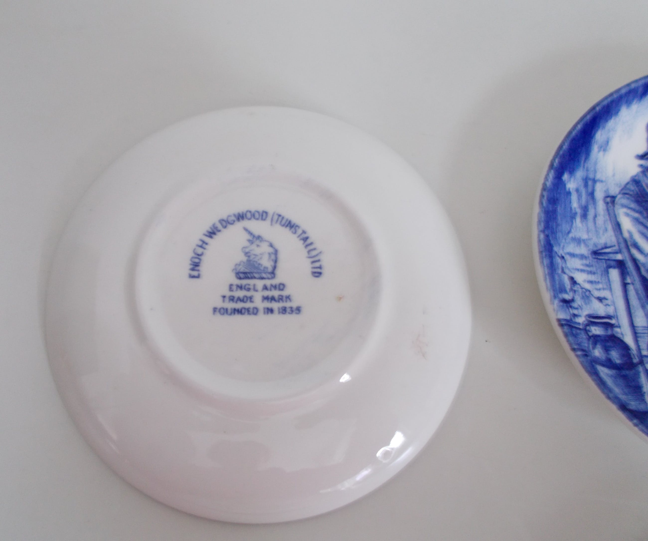 Set van 6 Wedgwood bordjes (Flow Blue Small Tradesmen Plates).Enoch Wedgwood Tunstall Ltd. England. Trade mark founded in 1835 Elk bordje met een interieurtafereel en een andere beroepsgroep. 1. Soldier (soldaat)2. Pedlar (marskramer)3. Game Keeper (spelhouder)4. Farmer (landarbeider)5. Huntsman ( jager)6. Sailor (zeeman). Doorsnede van de bordjes is 10,5cm