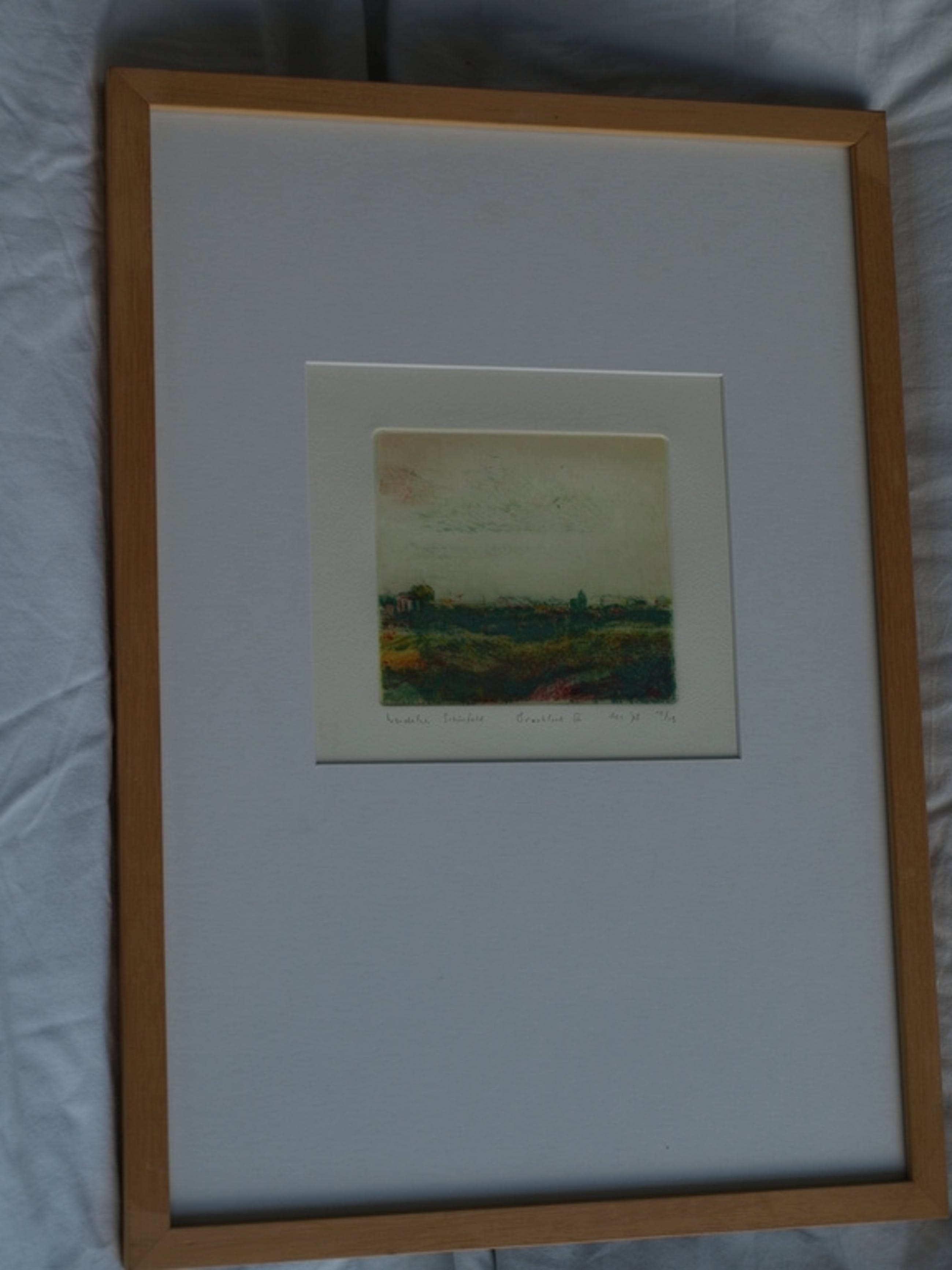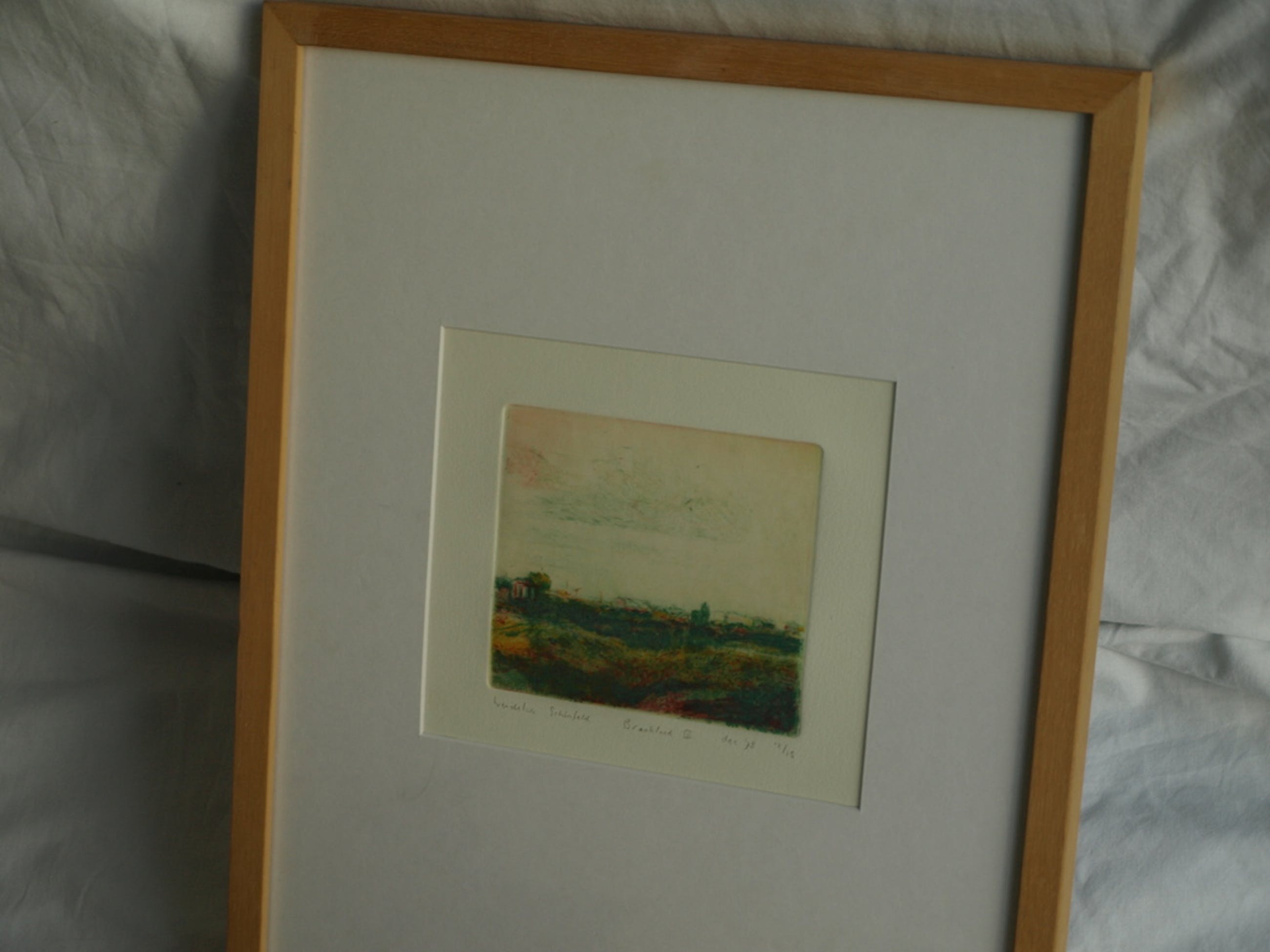 Goed ingelijst in een houten lijst met passe-partout en glasplaat.