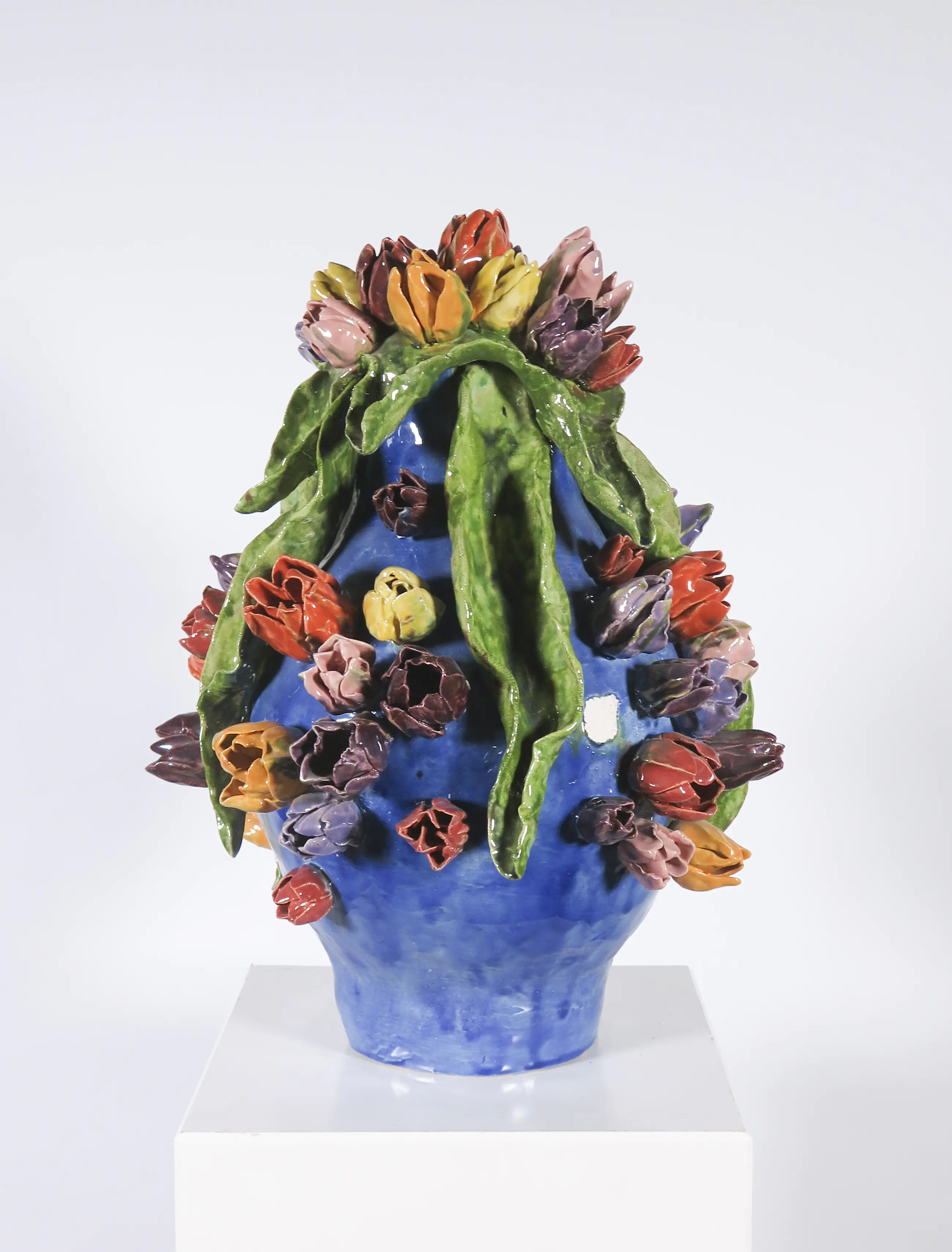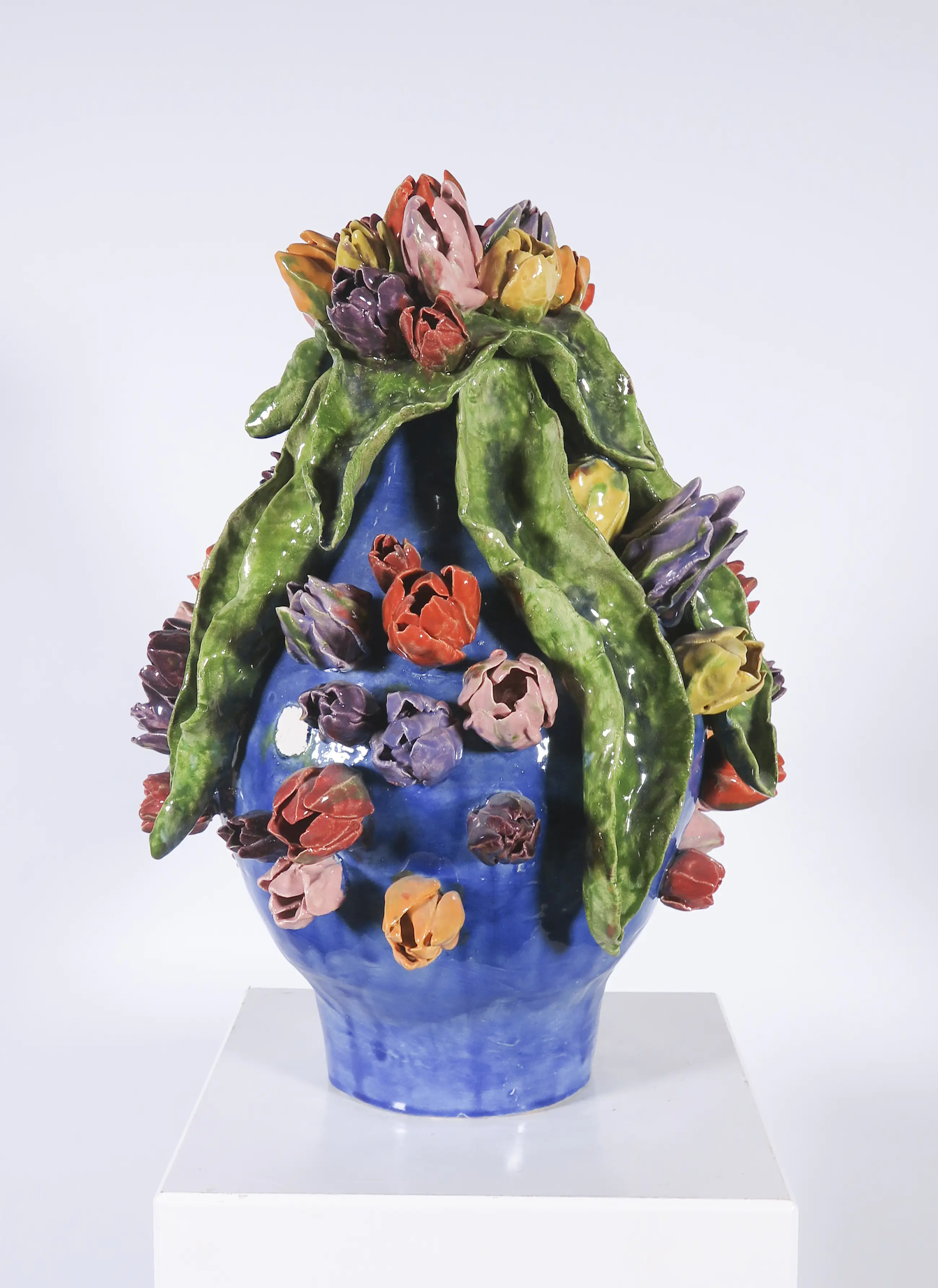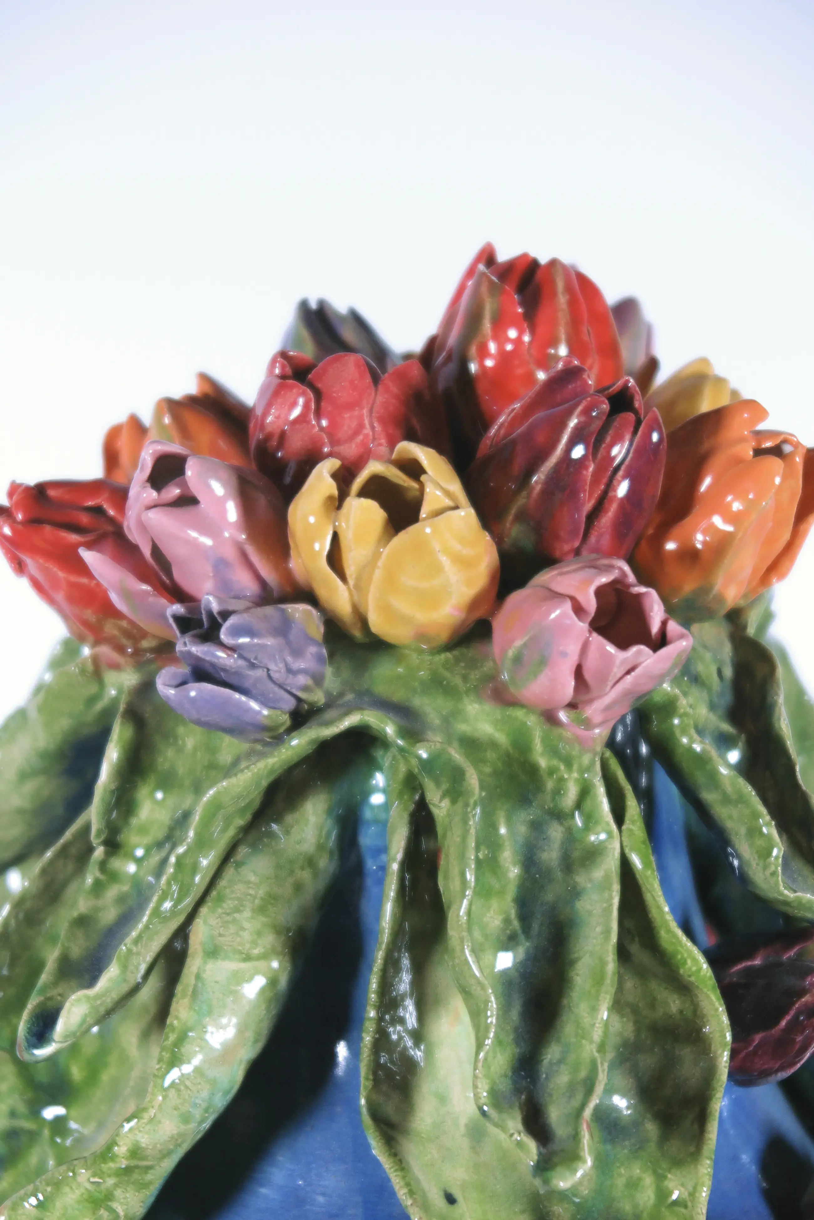 | Een van de tulpjes is afgebroken. Nog wel aanwezig, dus kan gerepareerd worden. Daarnaast een beschadiging van het blad van de rode, bovenste tulp op deksel. Ook dit stukje is nog aanwezig en kan gelijmd worden. Verder ook twee kleine beschadigingen aan een paarse tulp aan de zijkant van de vaas (zeer klein en minimaal, kan eventueel geretoucheerd worden in betreffende kleur). | |