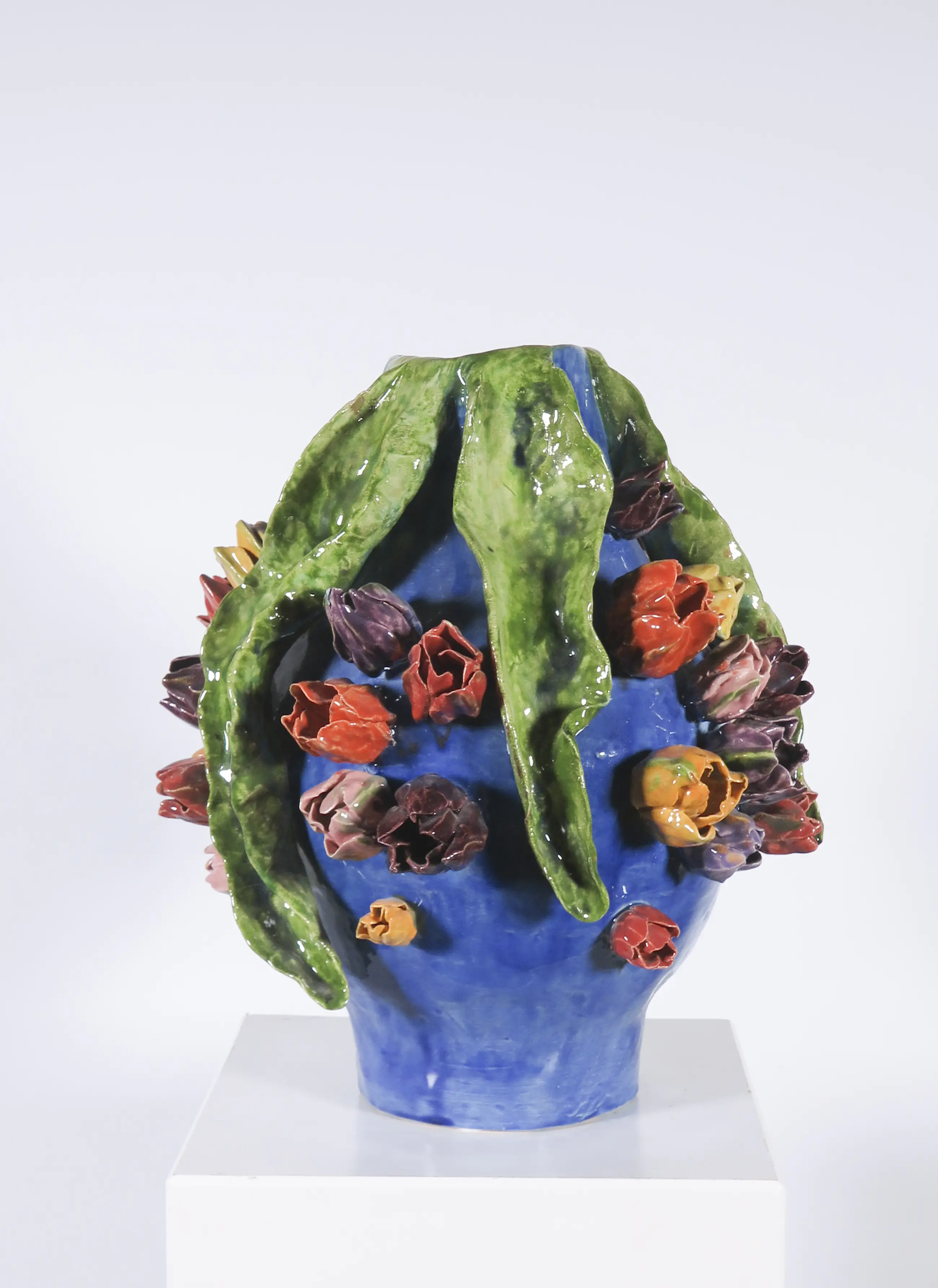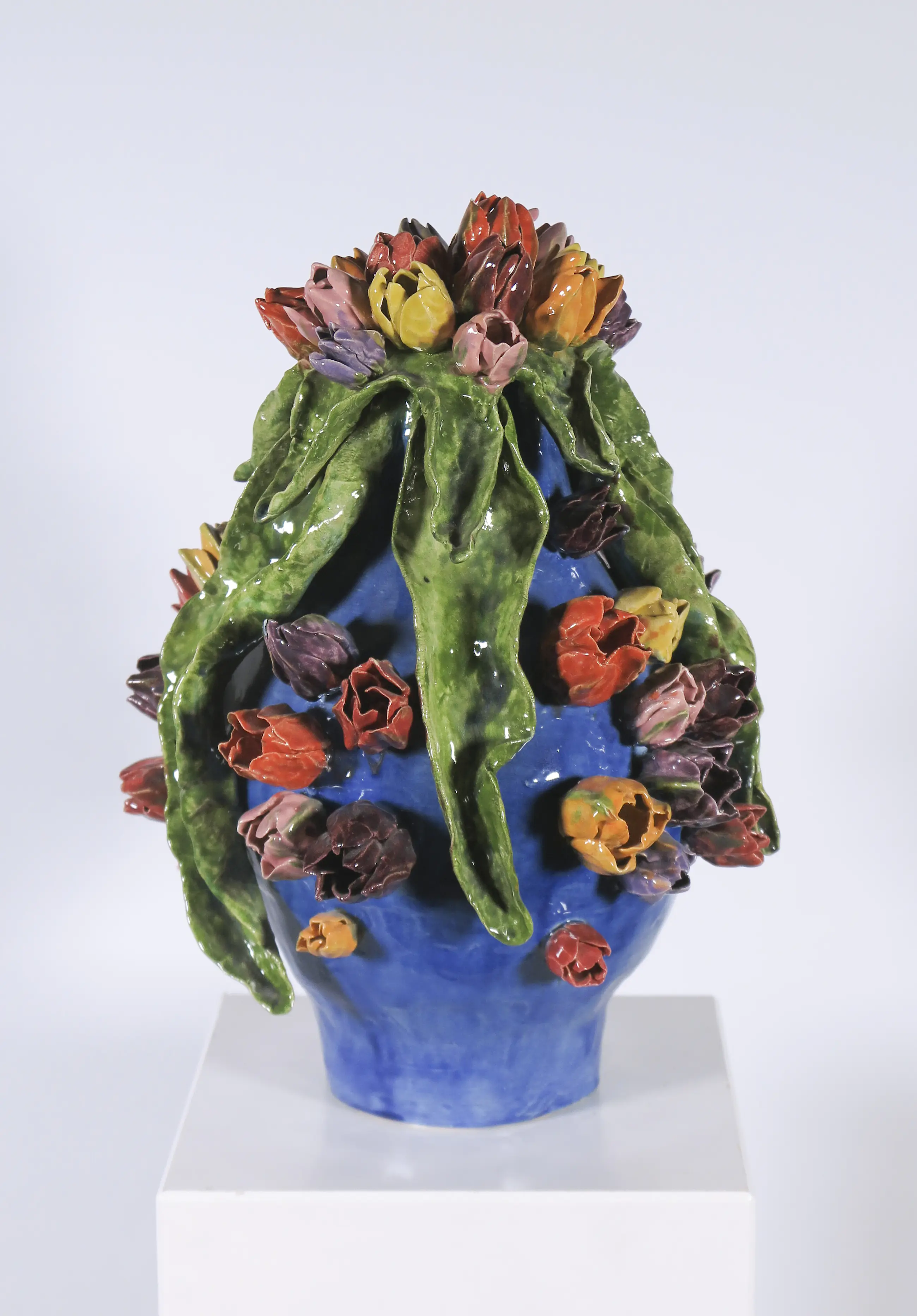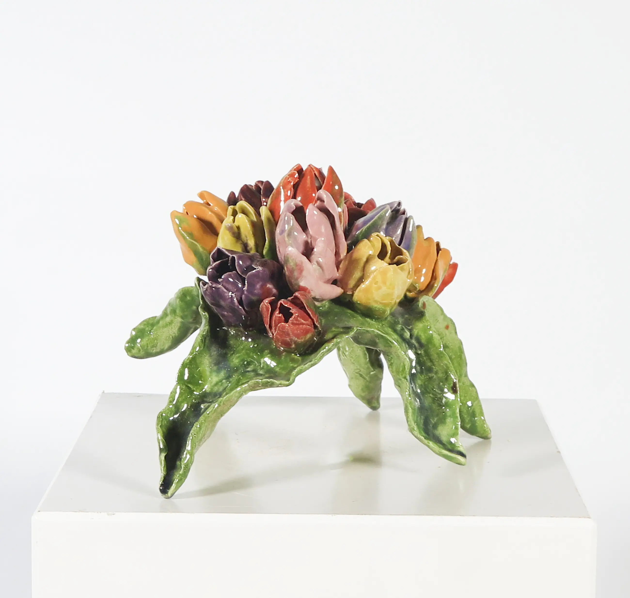 | Een van de tulpjes is afgebroken. Nog wel aanwezig, dus kan gerepareerd worden. Daarnaast een beschadiging van het blad van de rode, bovenste tulp op deksel. Ook dit stukje is nog aanwezig en kan gelijmd worden. Verder ook twee kleine beschadigingen aan een paarse tulp aan de zijkant van de vaas (zeer klein en minimaal, kan eventueel geretoucheerd worden in betreffende kleur). | |