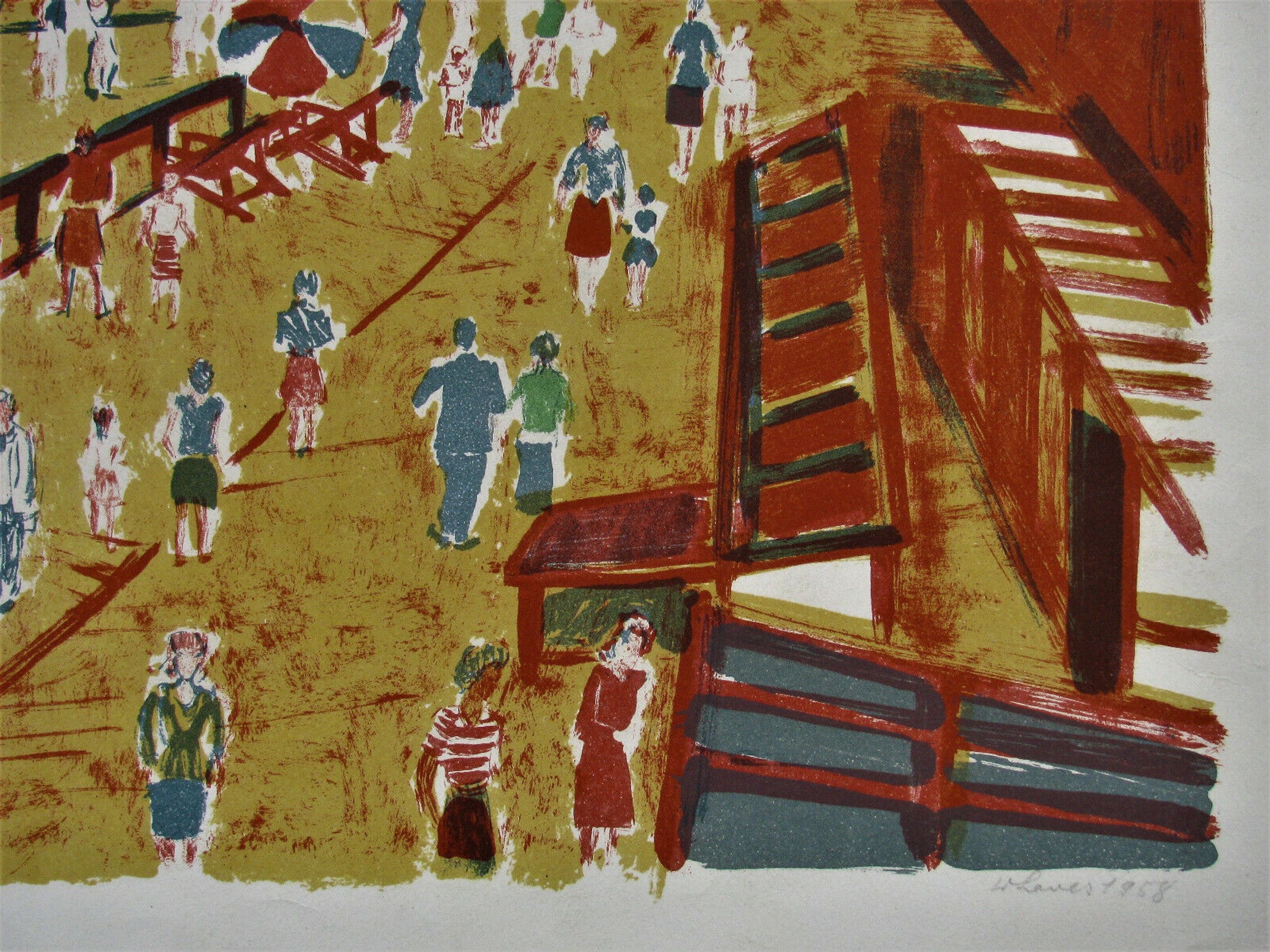 Groot formaat kleurenlitho, 48 x 63 cm (54 x 70 cm het vel) op vergépapier. Gesigneerd, getiteld en gedateerd 1958 in potlood. De litho is in goede staat, 2 oude scheuren aan de onderrand. Zie de foto's. Zeer zeldzaam blad.