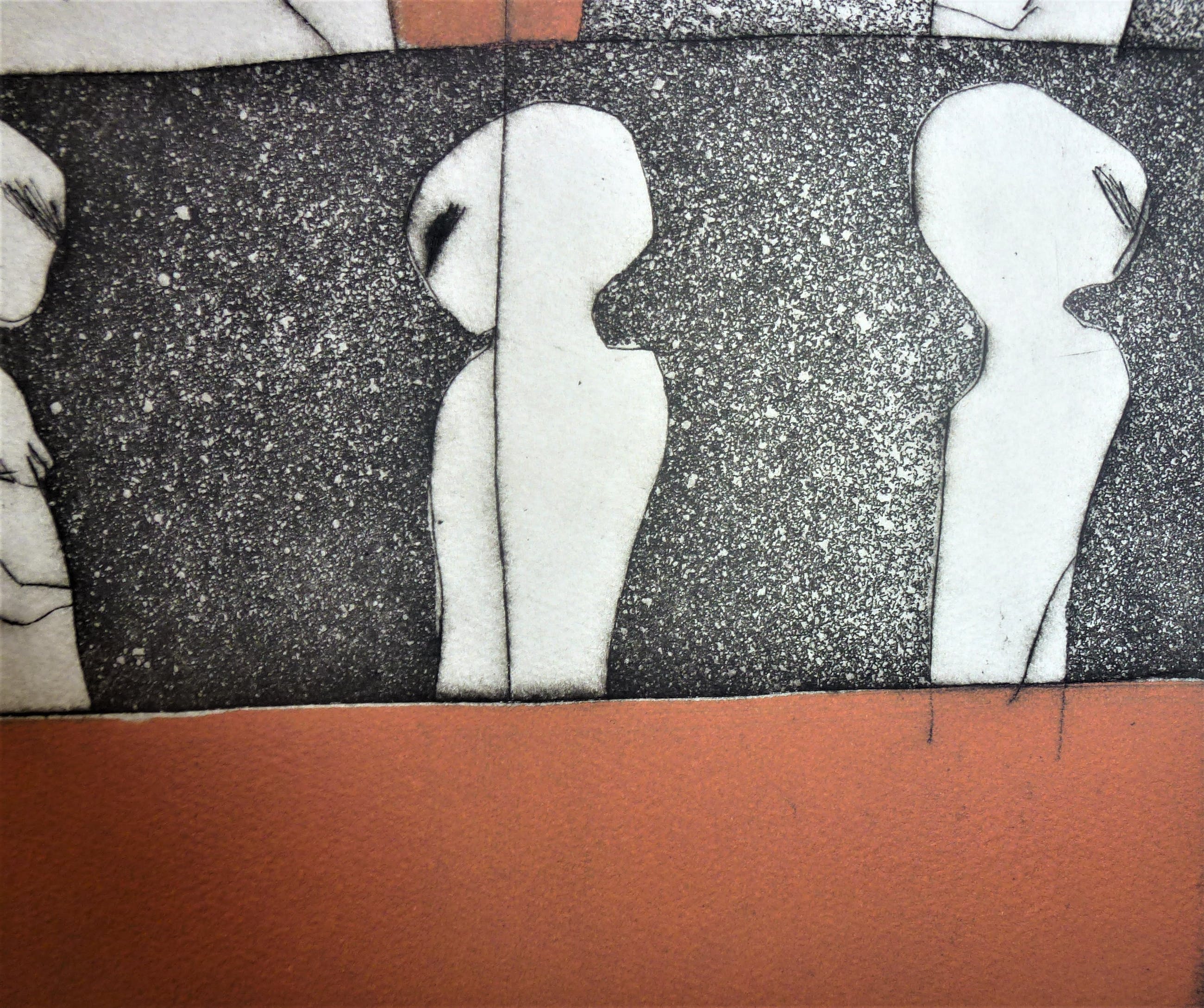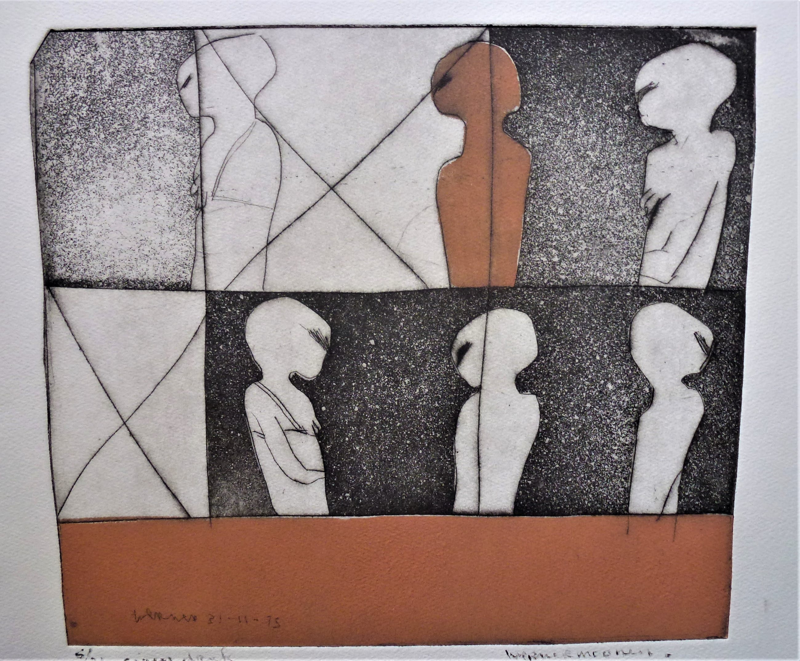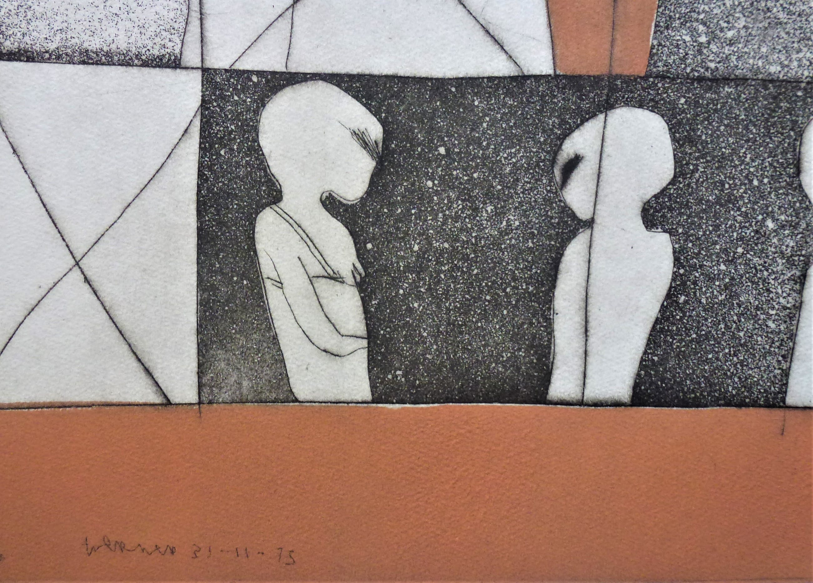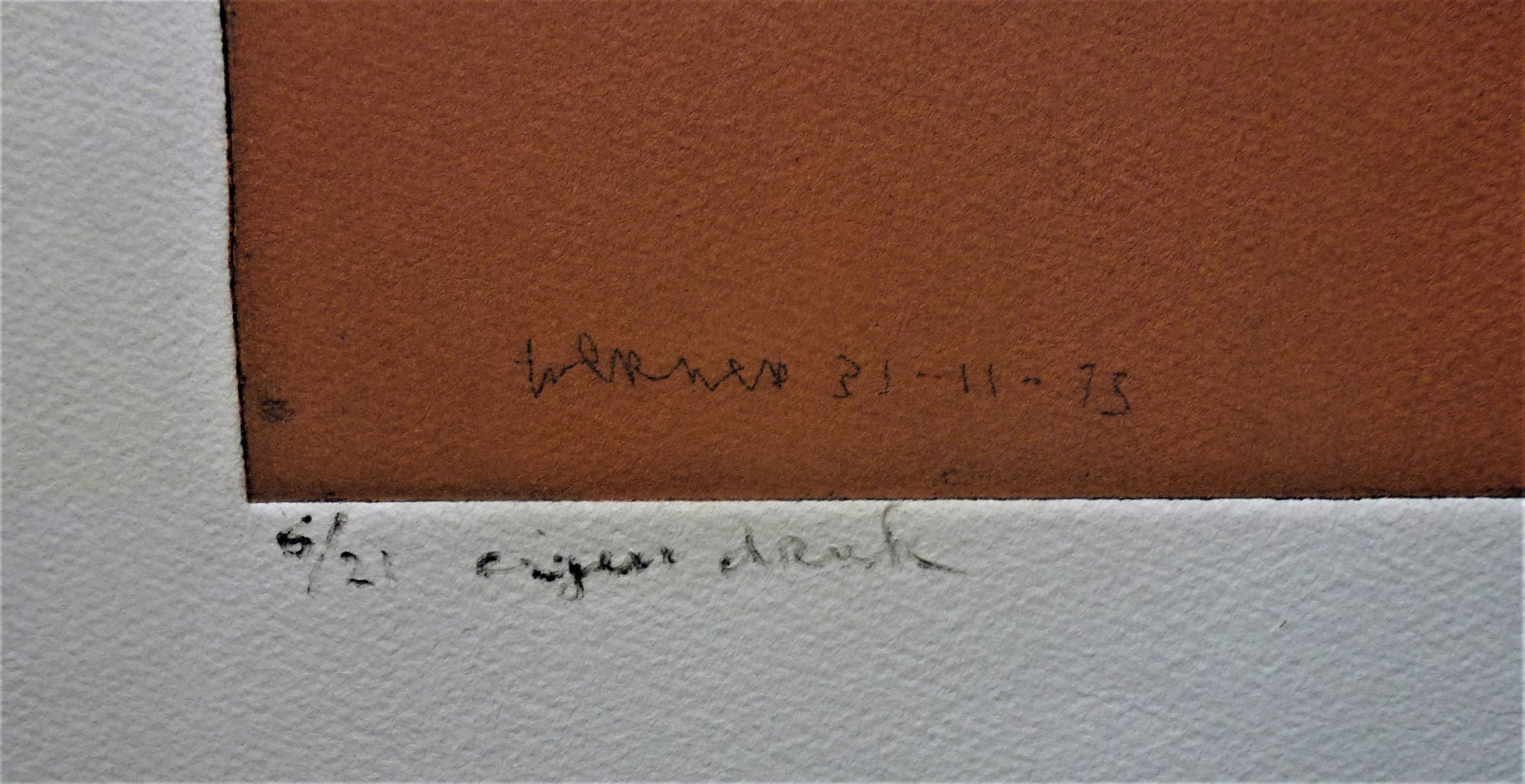 Geëtst en gedrukt door Werner Moonen 1975. Afmetingen : Papier 39 cm x 53 cm . Ets 21,5 cm x 24 cm ,