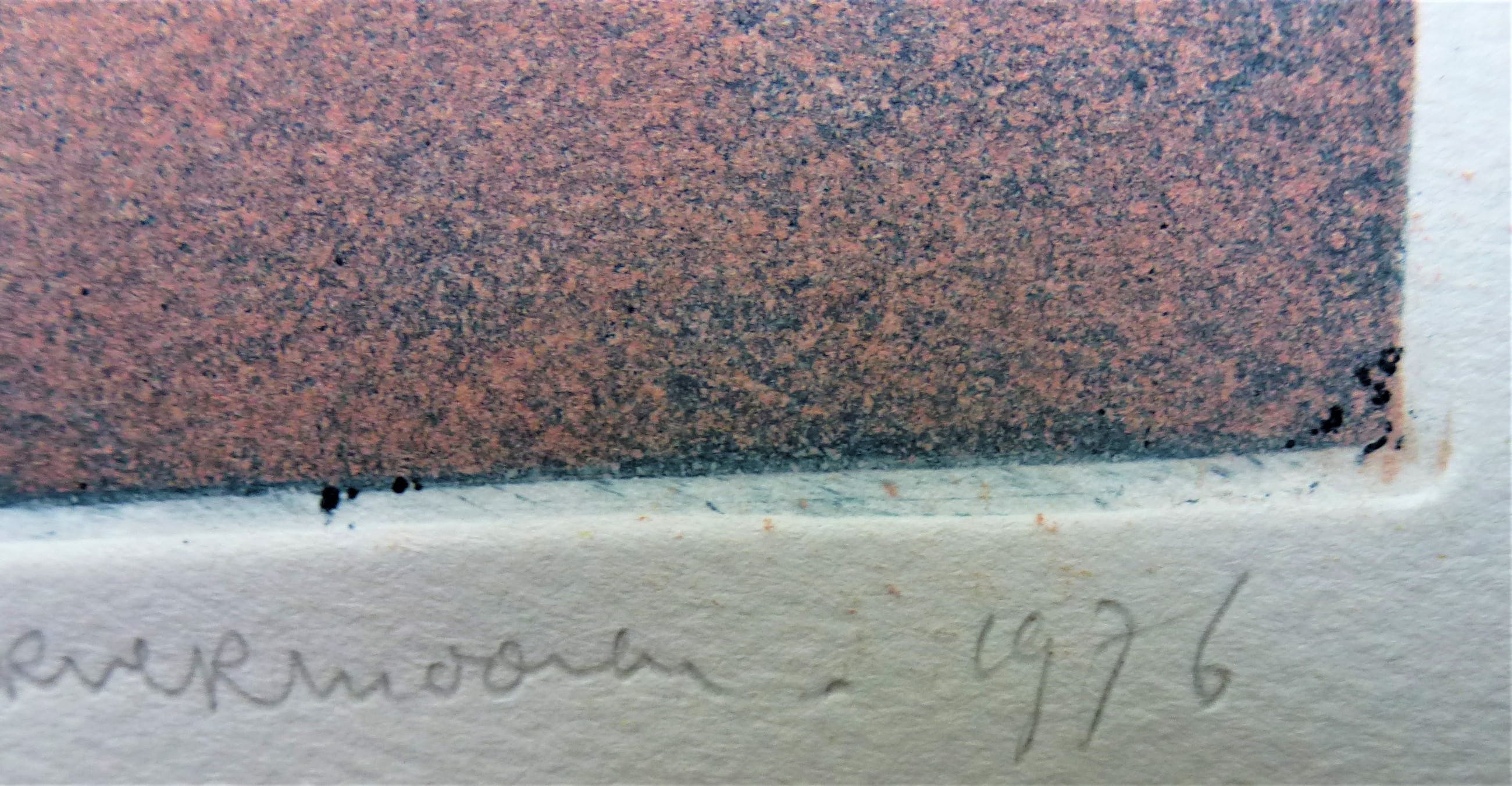 Geëtst en gedrukt door Werner Moonen in1976 Afmetingen : Papier 53 cm x 39 cm . Ets 28 cm x 20 cm Gedateerd 20 -9-1976 Genummerd 3 /37 Voorstelling : Confrontatie. Conditie : Als nieuw. Herkomst : Gekocht in 1976 van Werner Moonen . Wordt aangetekend verzonden .