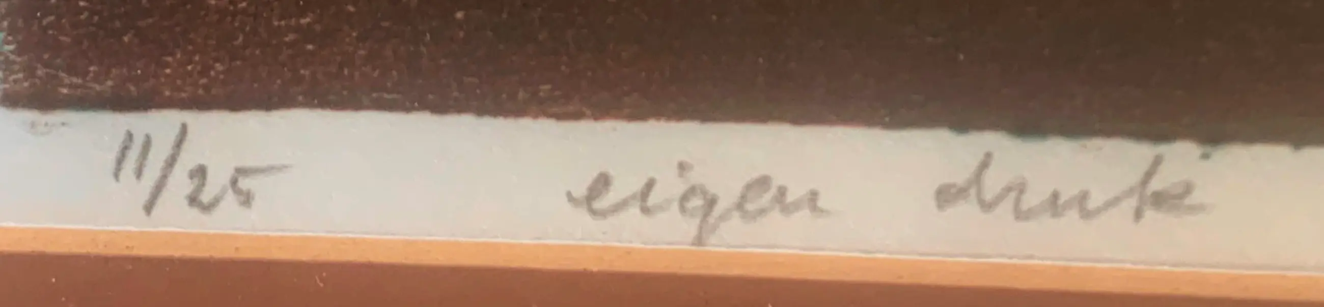 Ingelijste ets/aquatint van Werner Moonen. Titel: . Oplage: 11/25, eigen druk. Afmetingen incl lijst: H60 x b757m. Afmetingen voorstelling: H40 x b57cm. Het werk is rechts onderaan gesigneerd door de kunstenaar. De authenticiteit van het, aangeboden, werk wordt volledig gegarandeerd. Een certificaat van echtheid kan, op aanvraag, worden gemaild.