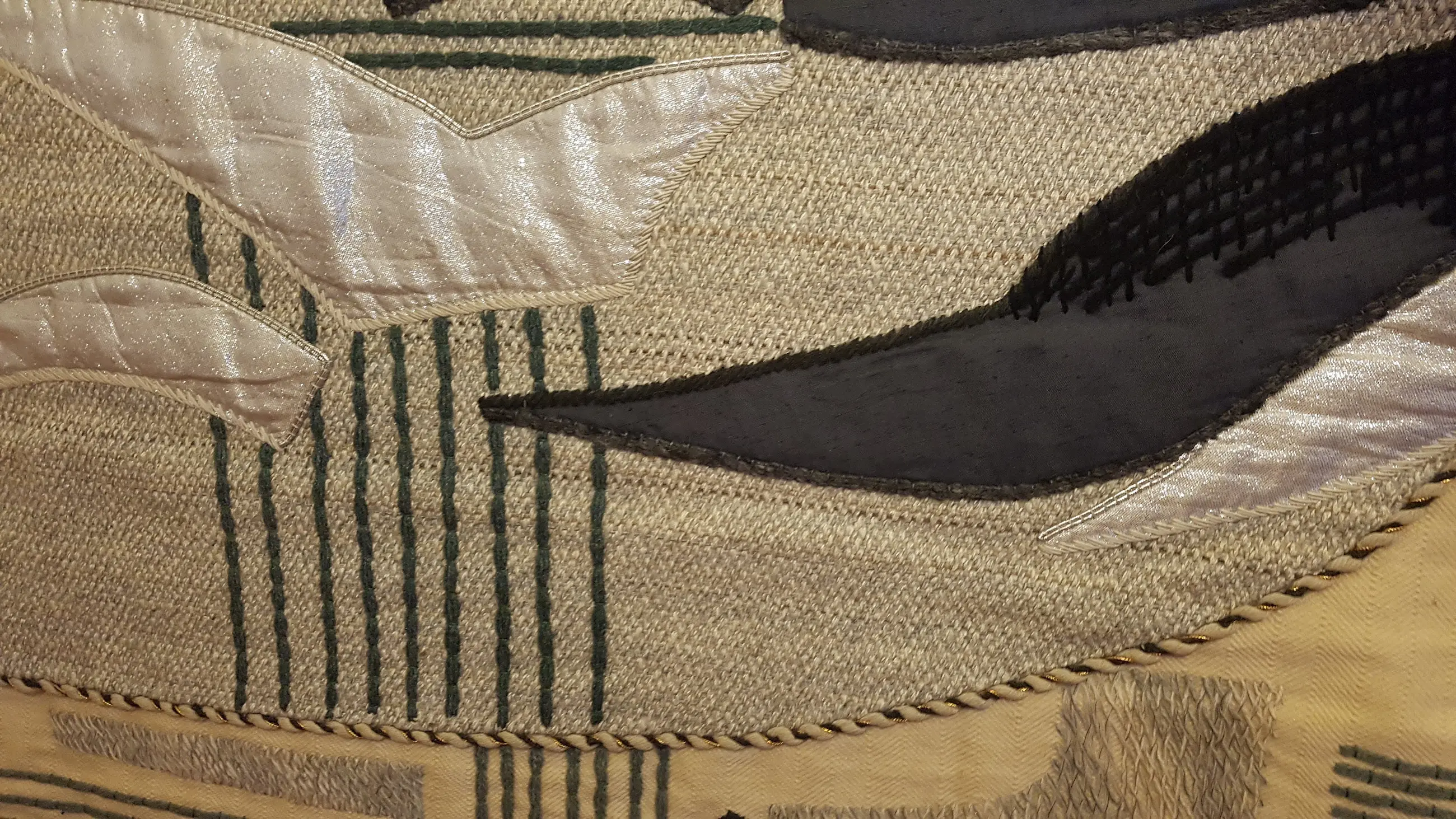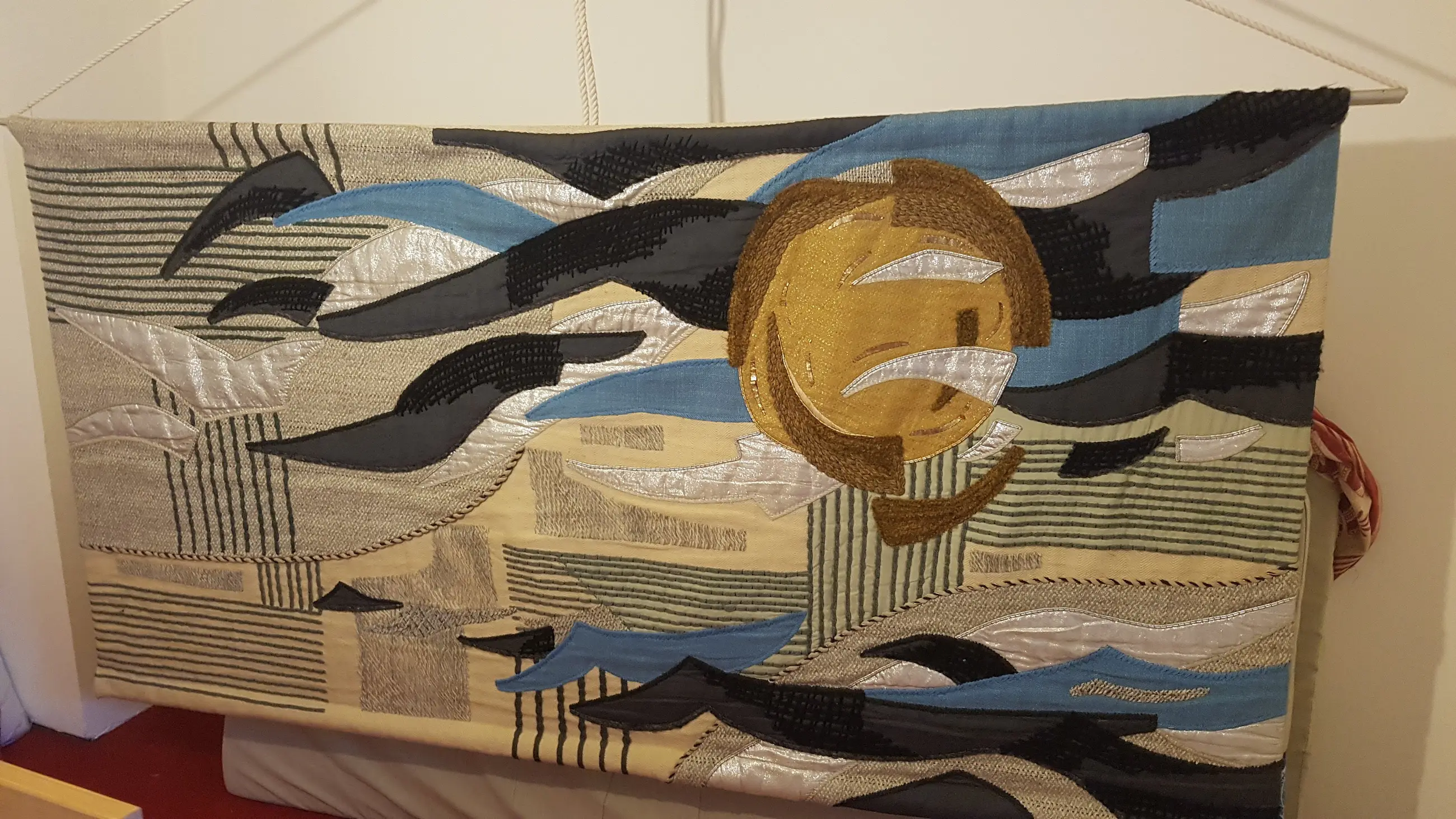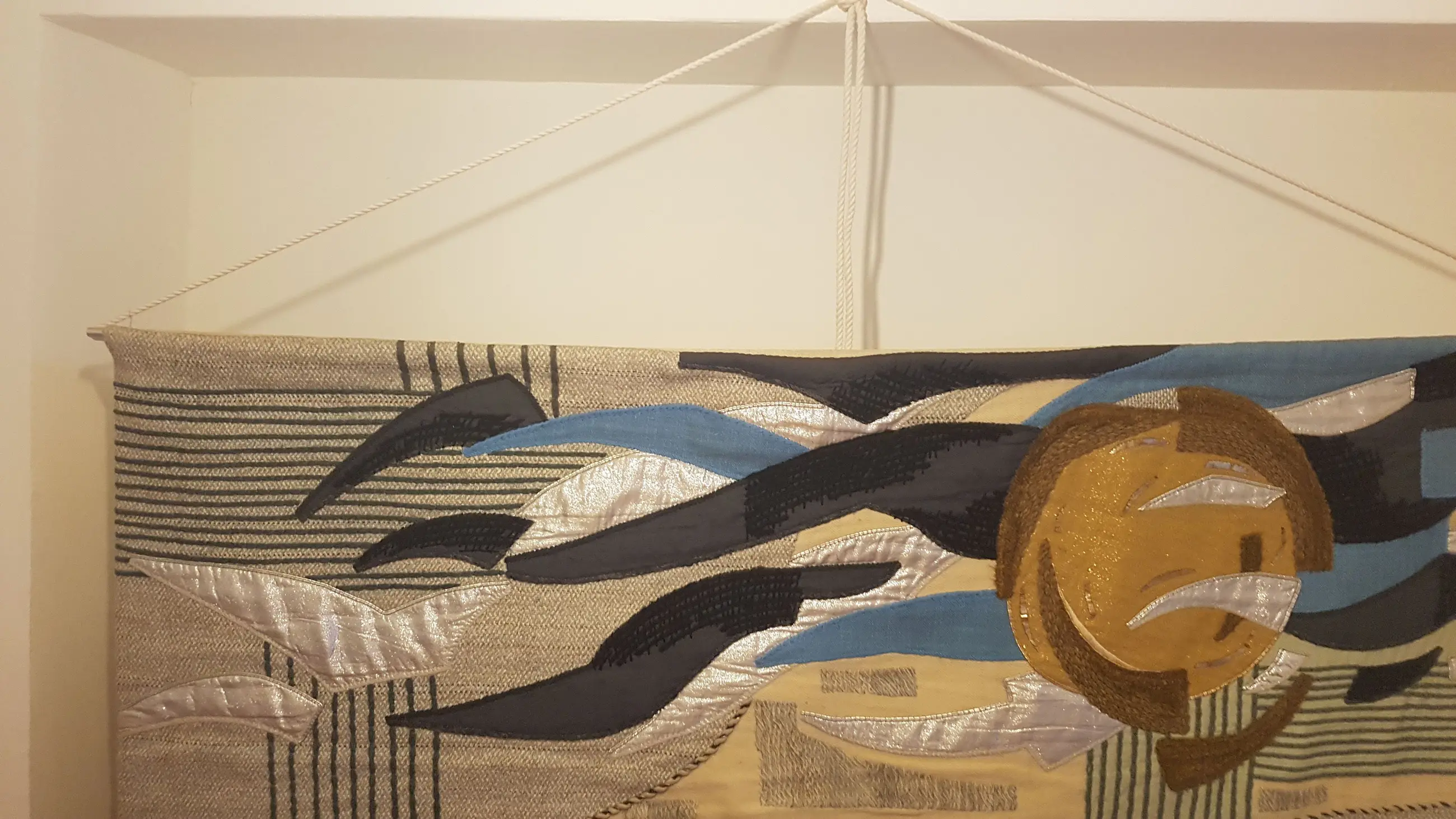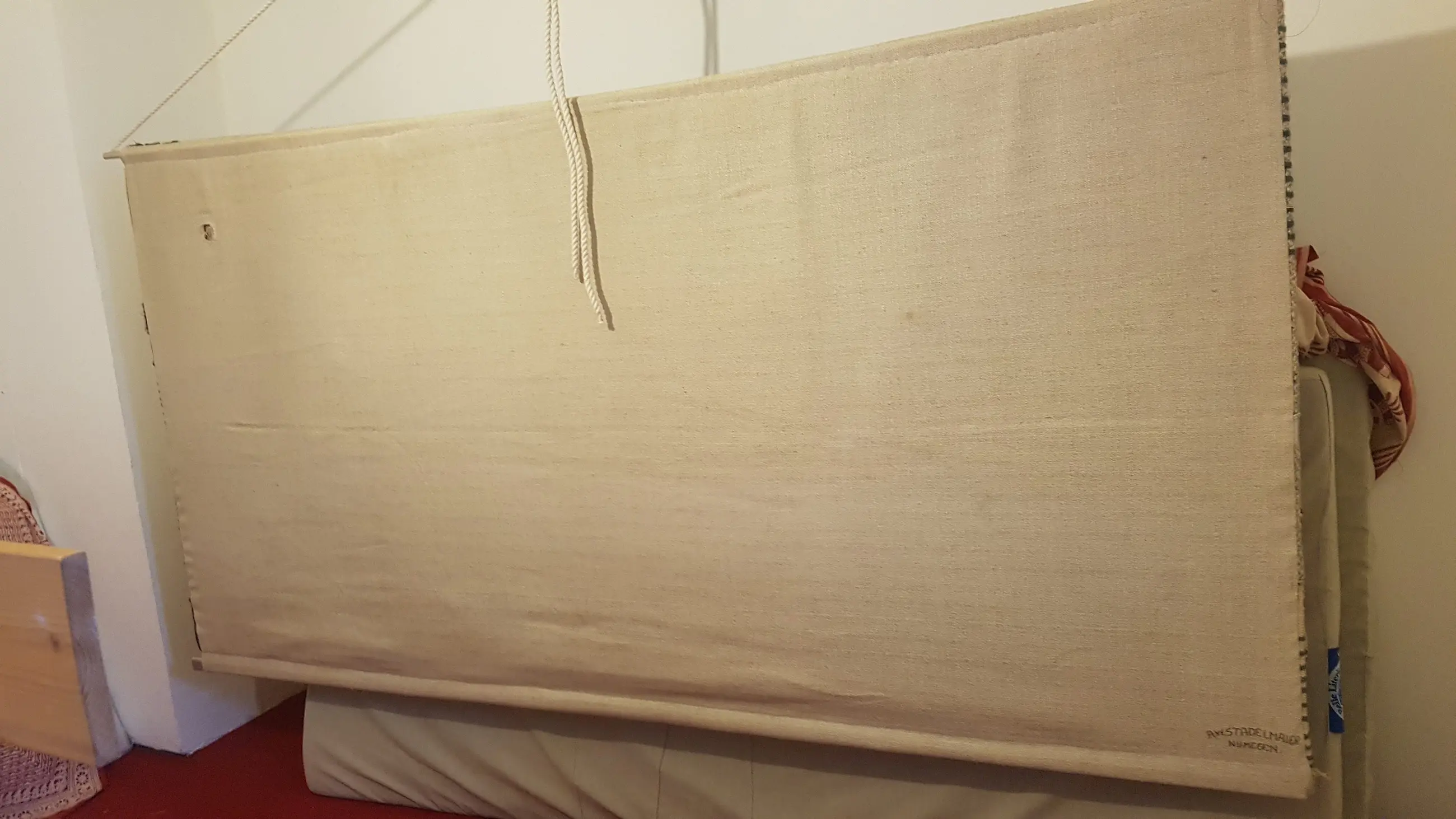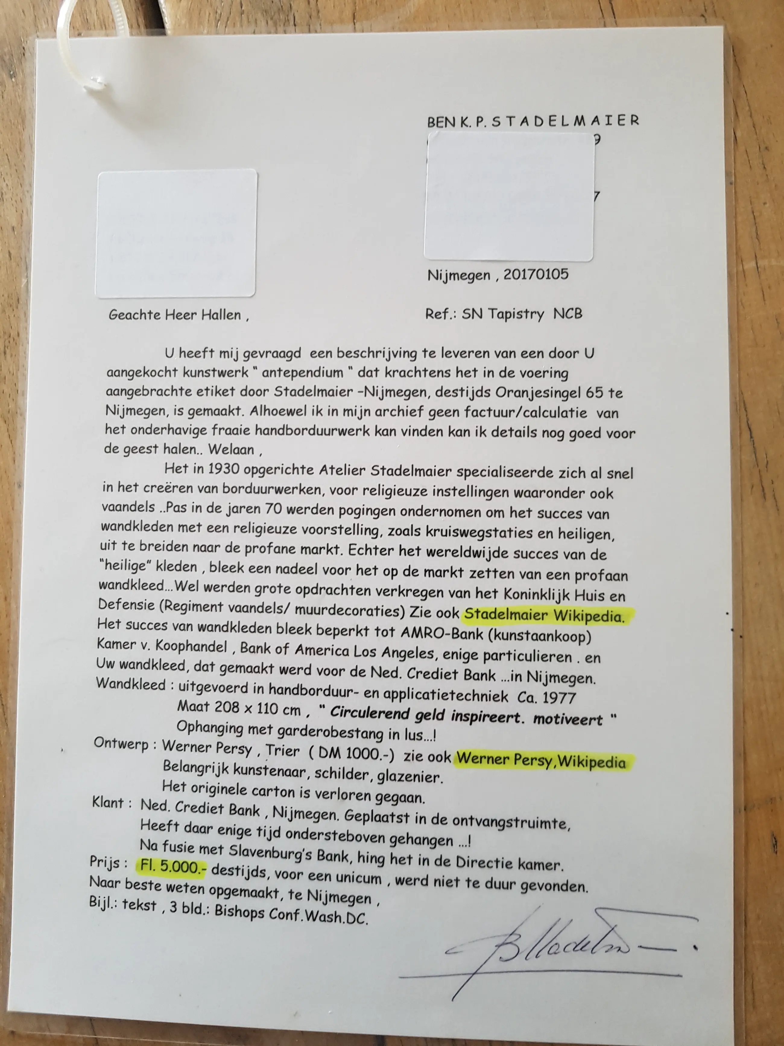 Diese grosse Wandstickerei, ein Unikat, war Jahre lange aufgehängt im Empfangraum von verschiedenen niederländischen Banken.