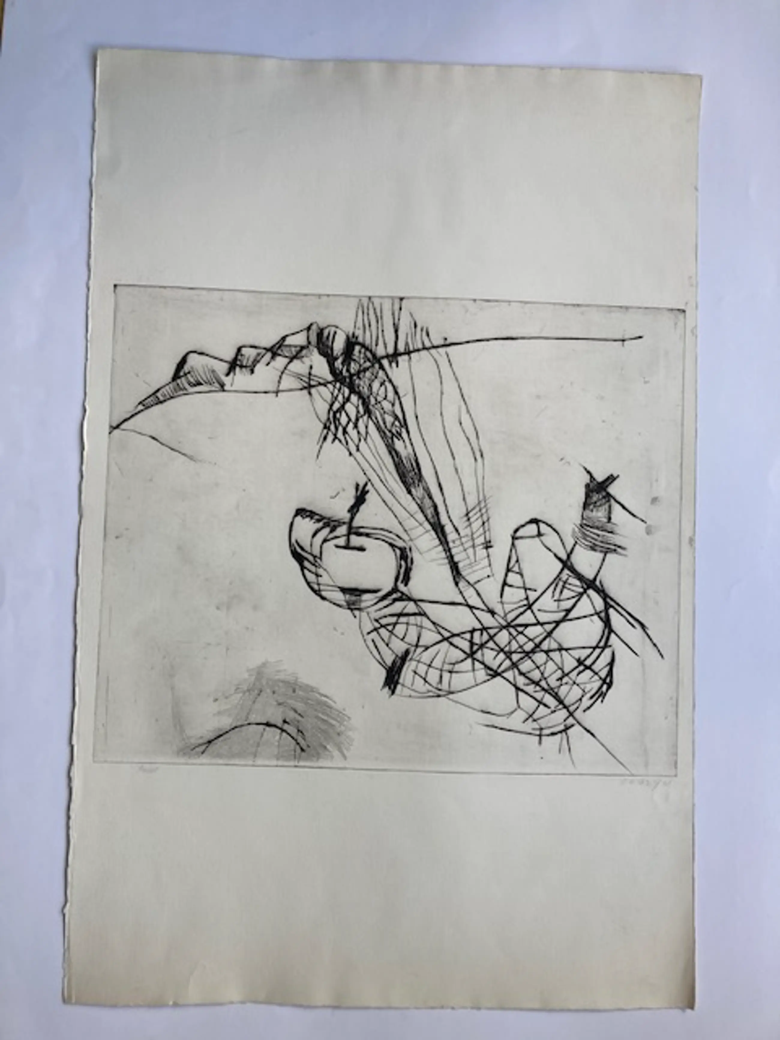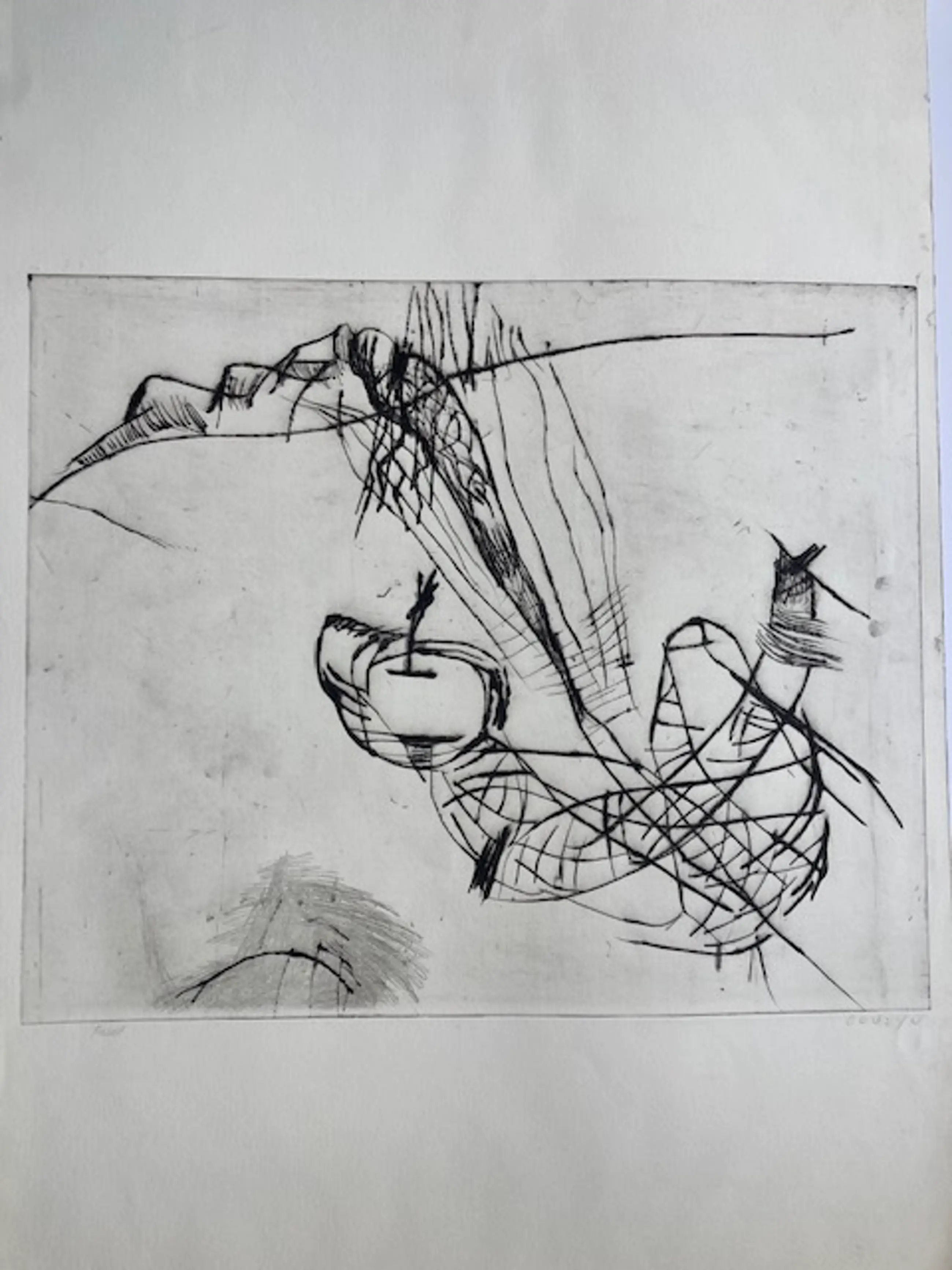 Collectors item: proefdruk van droge naald ets van kunstenaar Wessel Couzijn. Gesigneerd met potlood. Wessel Couzijn is het meest bekend om zijn beeldhouwkunst maar hij maakte ook grafisch werk. Zijn werk is verwant aan het het grafische oeuvre van zijn levenspartner Pearl Perlmuter. Let op de indruk van de etsplaat is minder groot dan de totale papiermaat.