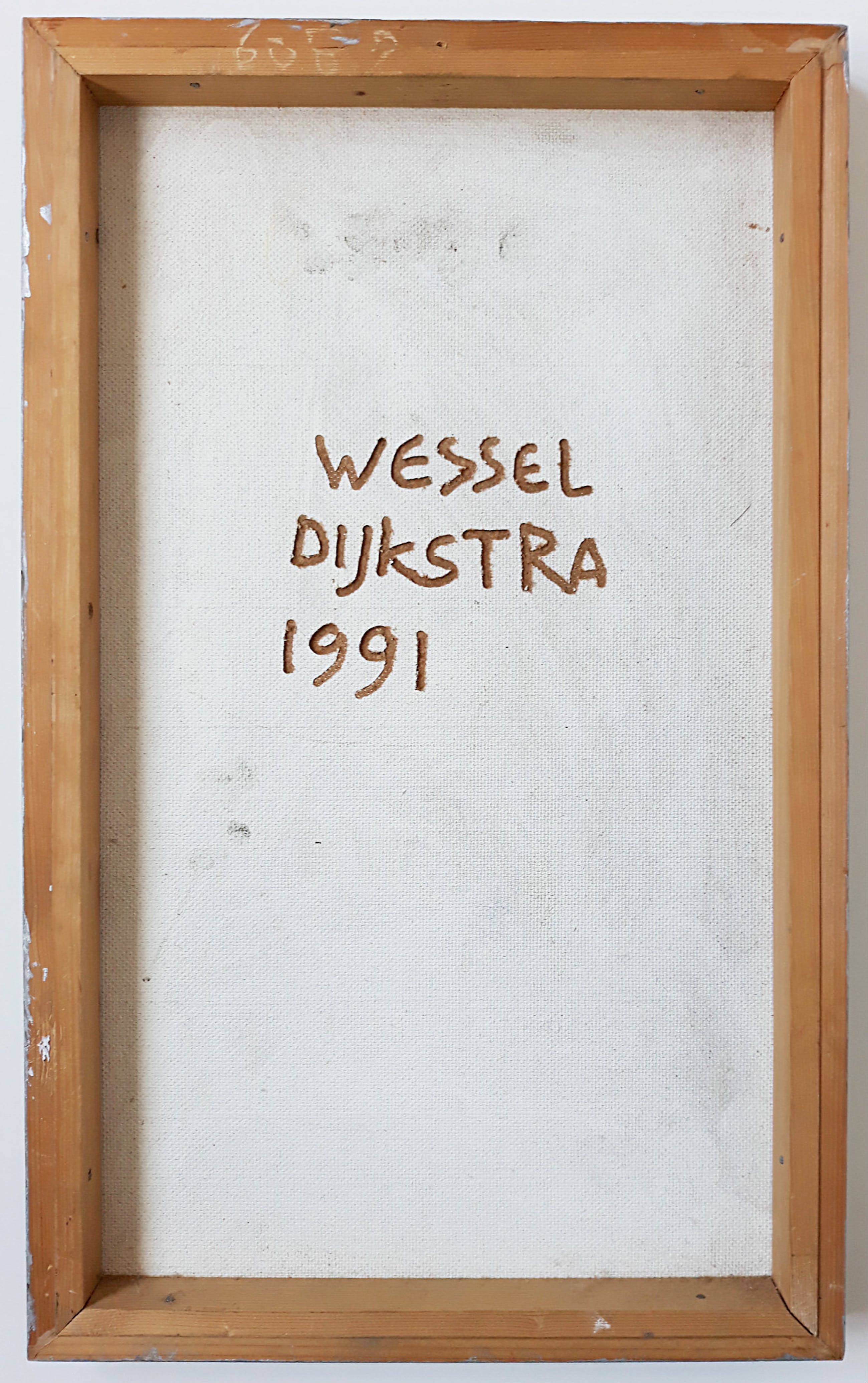 Fascinerend werk van Wessel Dijkstra. Olieverf op gesculpteerd hout, in verso gesigneerd en gedateerd (1991). Eenvoudig maar complementerend ingelijst als één geheel. In uitstekende staat.