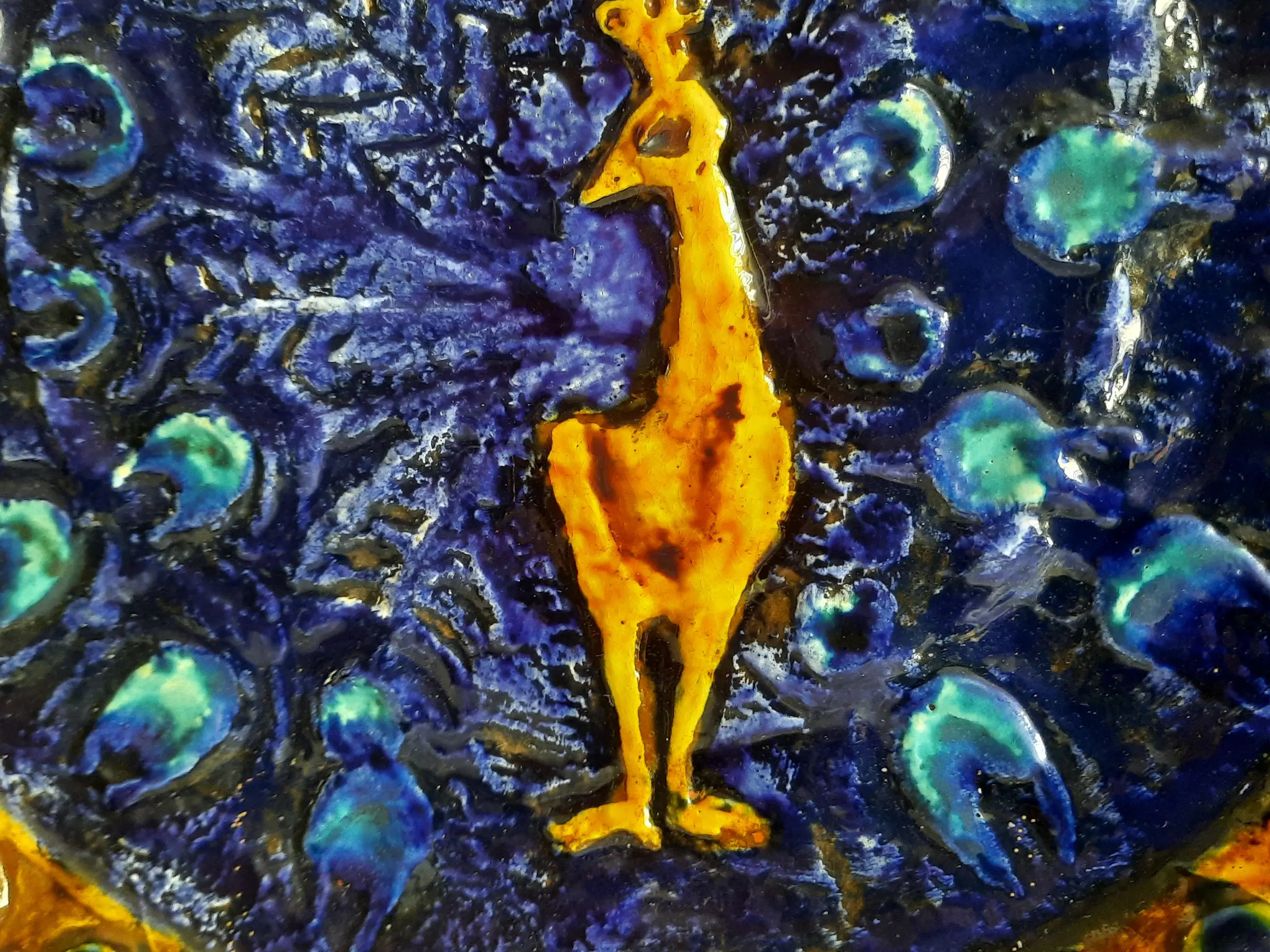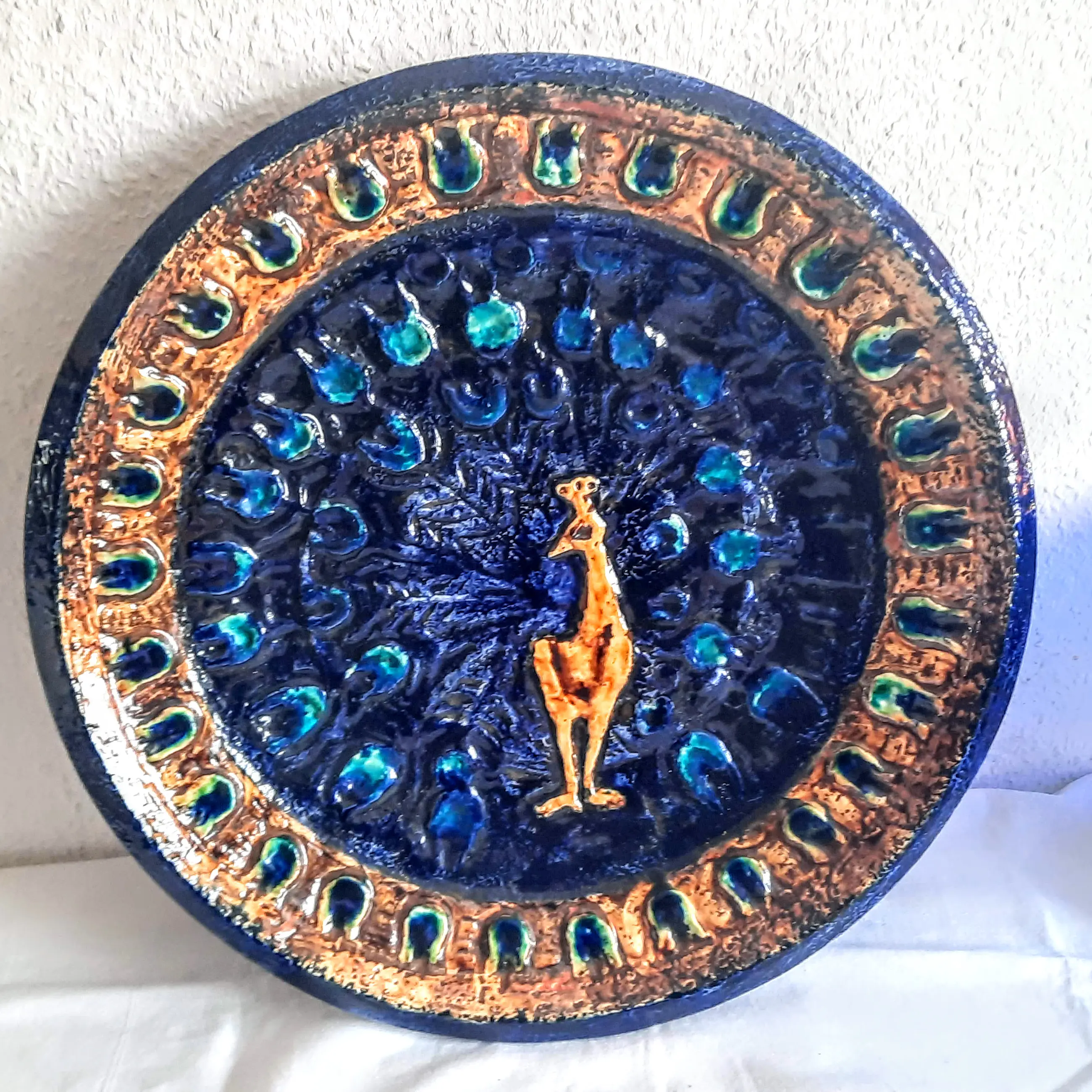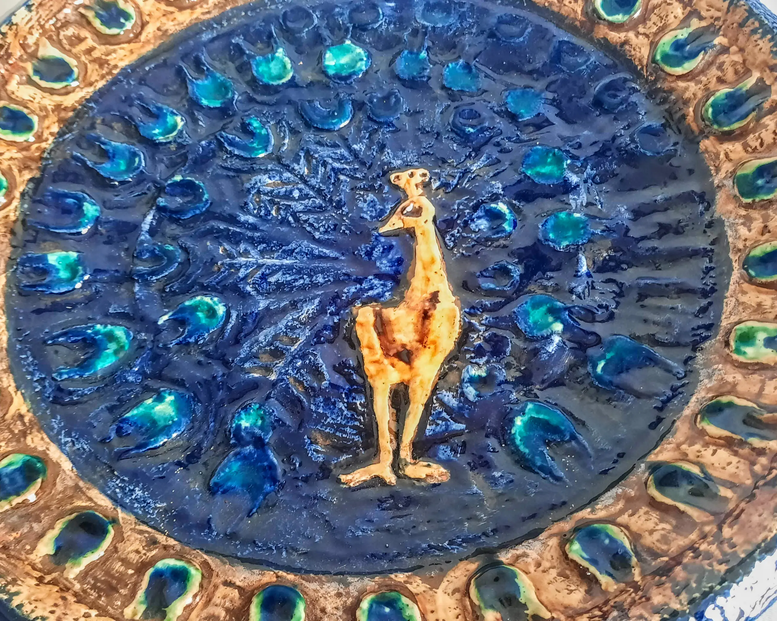 Het bord (bruin scherfje met karakteristieke onderglazuurschildering) toont een gestileerde, goudkleurige pauwafbeelding in laag reliëf, omgeven door een cirkelvormig patroon van blauwe en turkooizen "pauwenveren".
