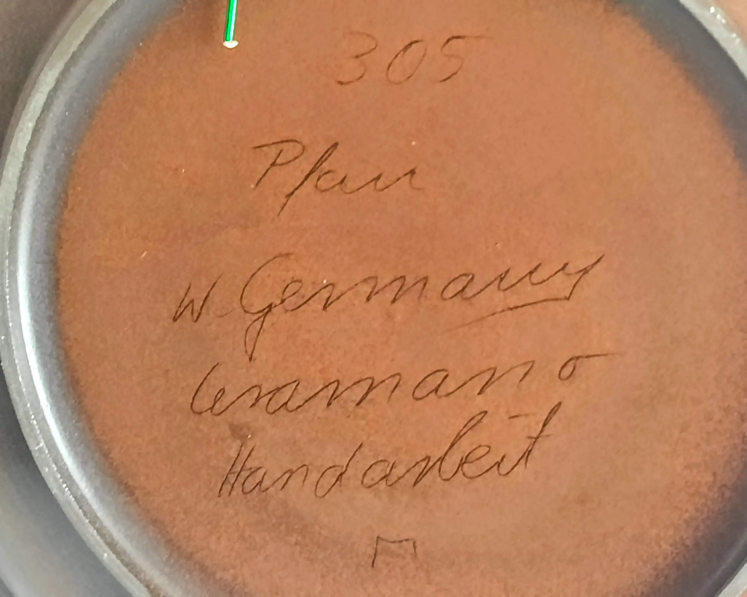 De onderkant van het bord is gemerkt met het nummer 305, de titel "Peacock" en "W. Germany Ceramano Handarbeit" (Handgemaakt Ceramano).