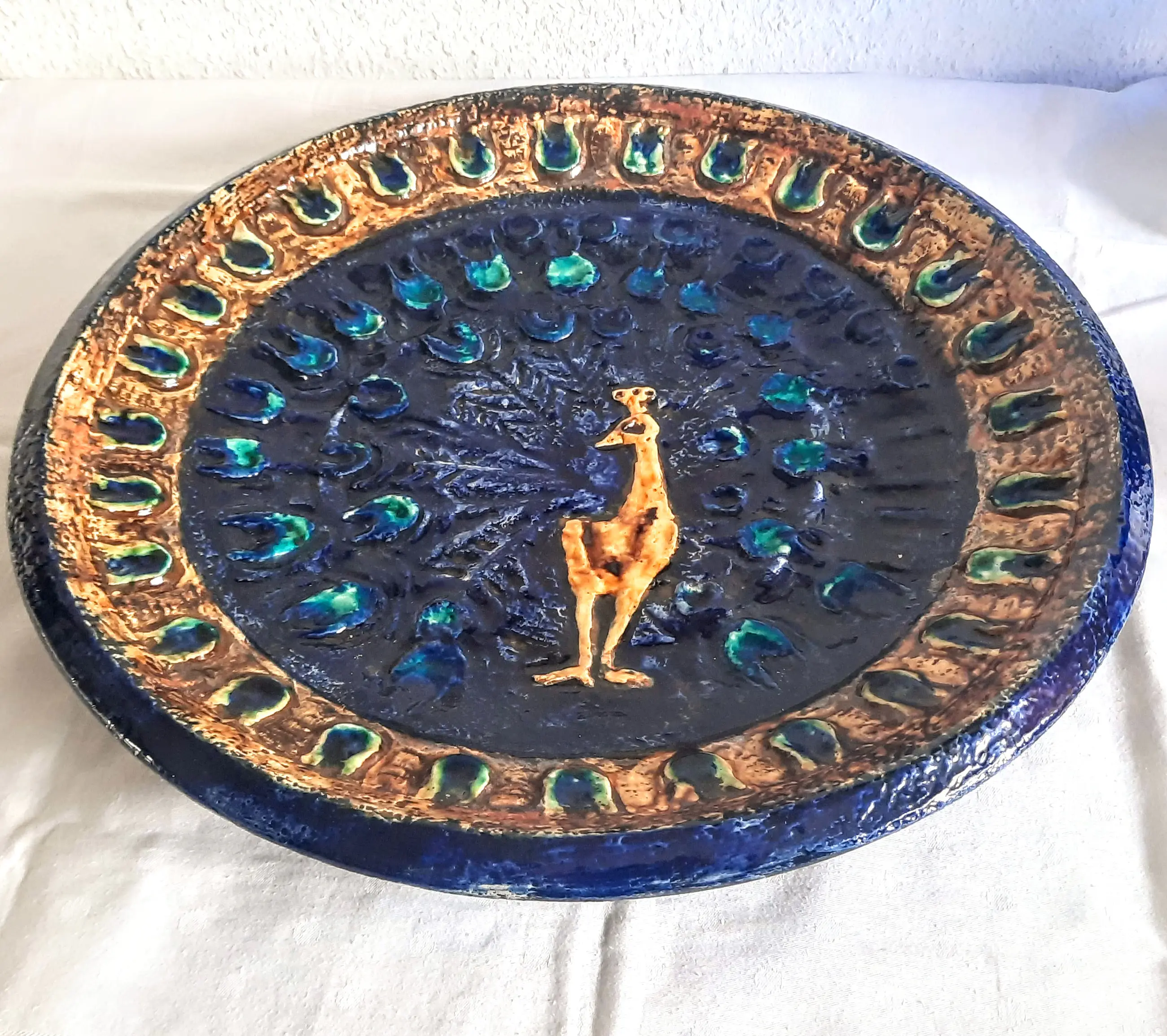 Een zeer fraai en zeldzaam keramisch bord met een pauwenmotief in de stijl van het Mid-Century Modern, van het merk Ceramano West-Duitsland uit de jaren 60.
