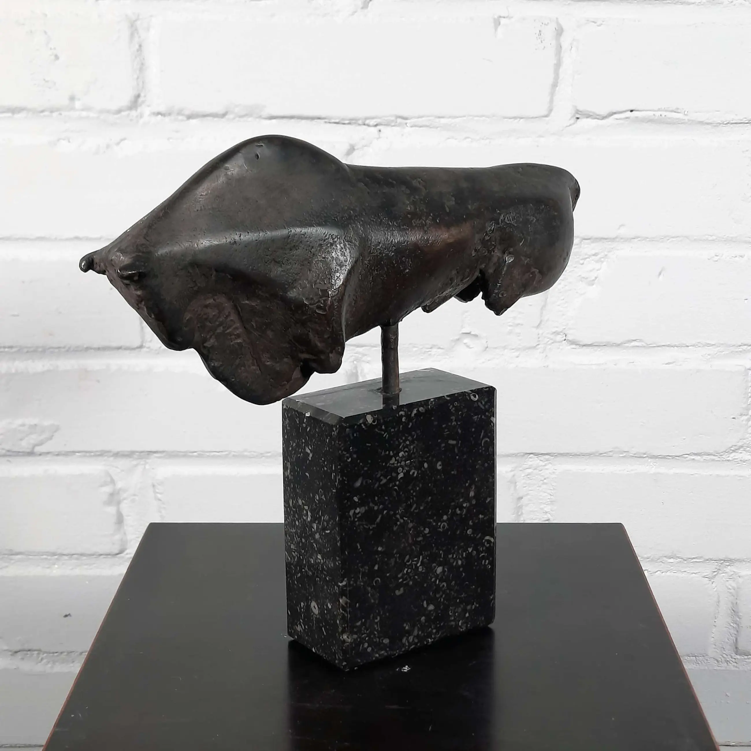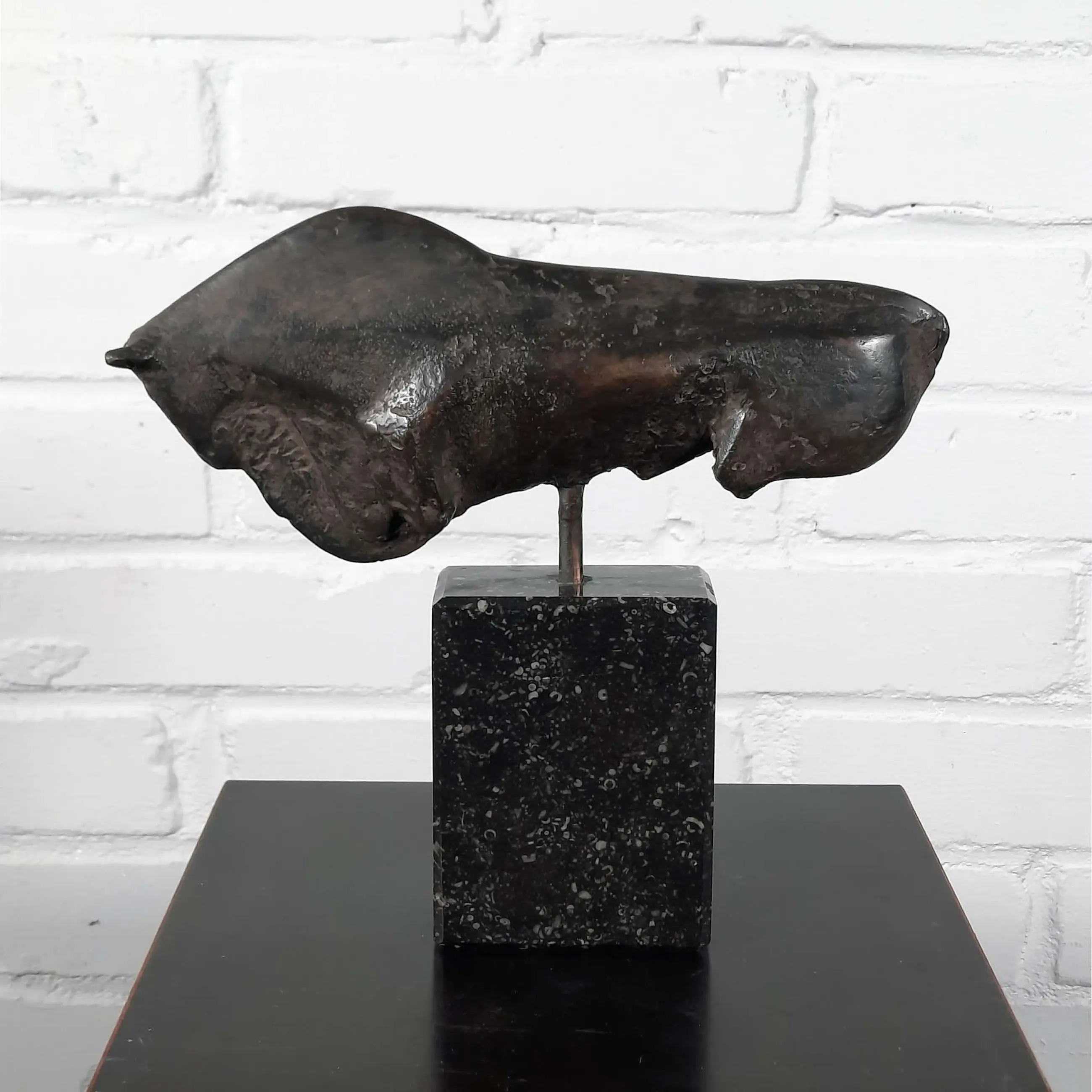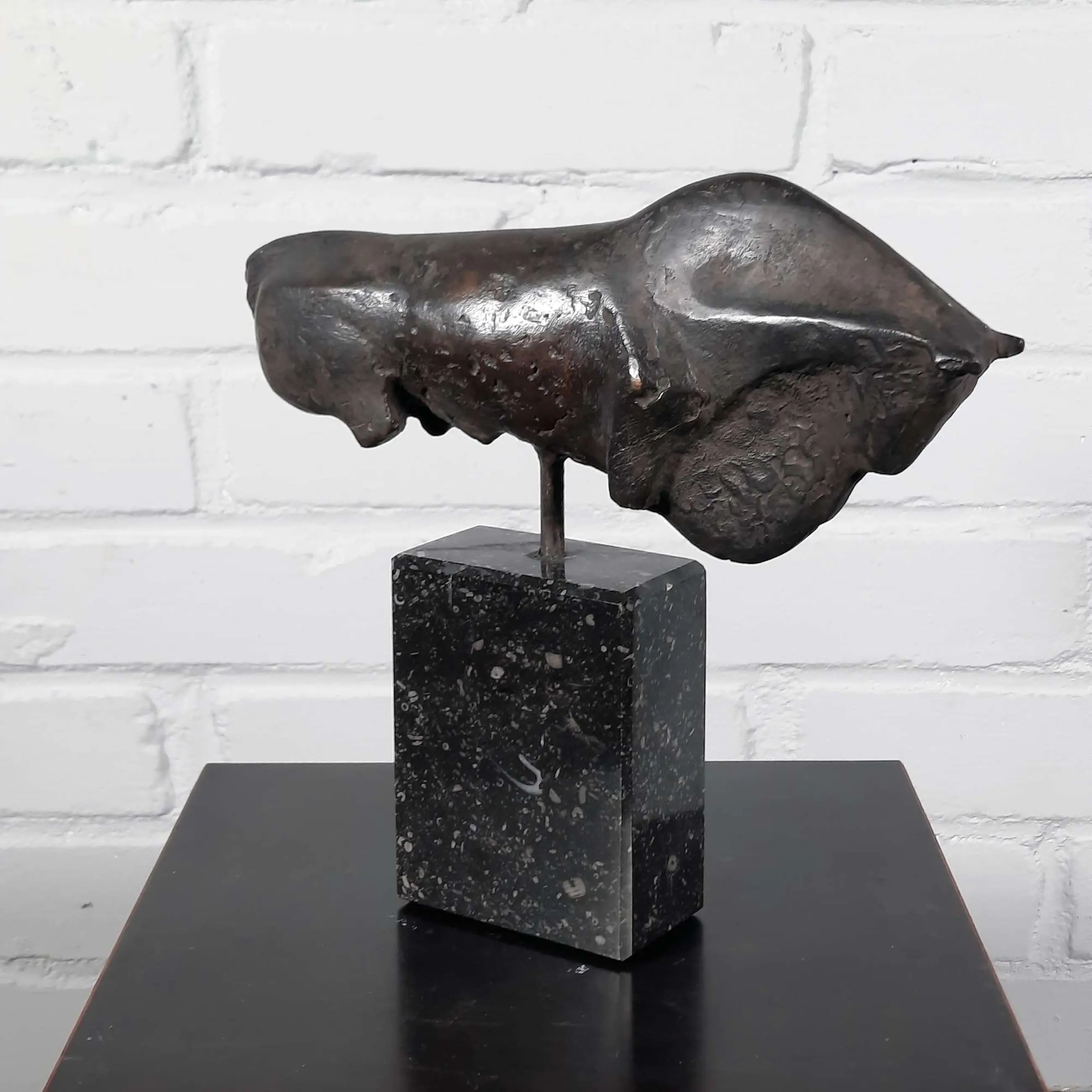 Mooi en gaaf werk van kunstenaar Wien Cobbenhagen op sokkel. Cobbenhagen studeerde aan de Tilburgse academie (1970-1972), bij Gerard Princée en Felix van der Linden, en vervolgens aan de Rijksakademie van beeldende kunsten in Amsterdam (1972-1976), als leerling van Piet Esser, Paul Grégoire en Theresia van der Pant. Hij won de Willem F.C. Uriôt Kunstprijs.