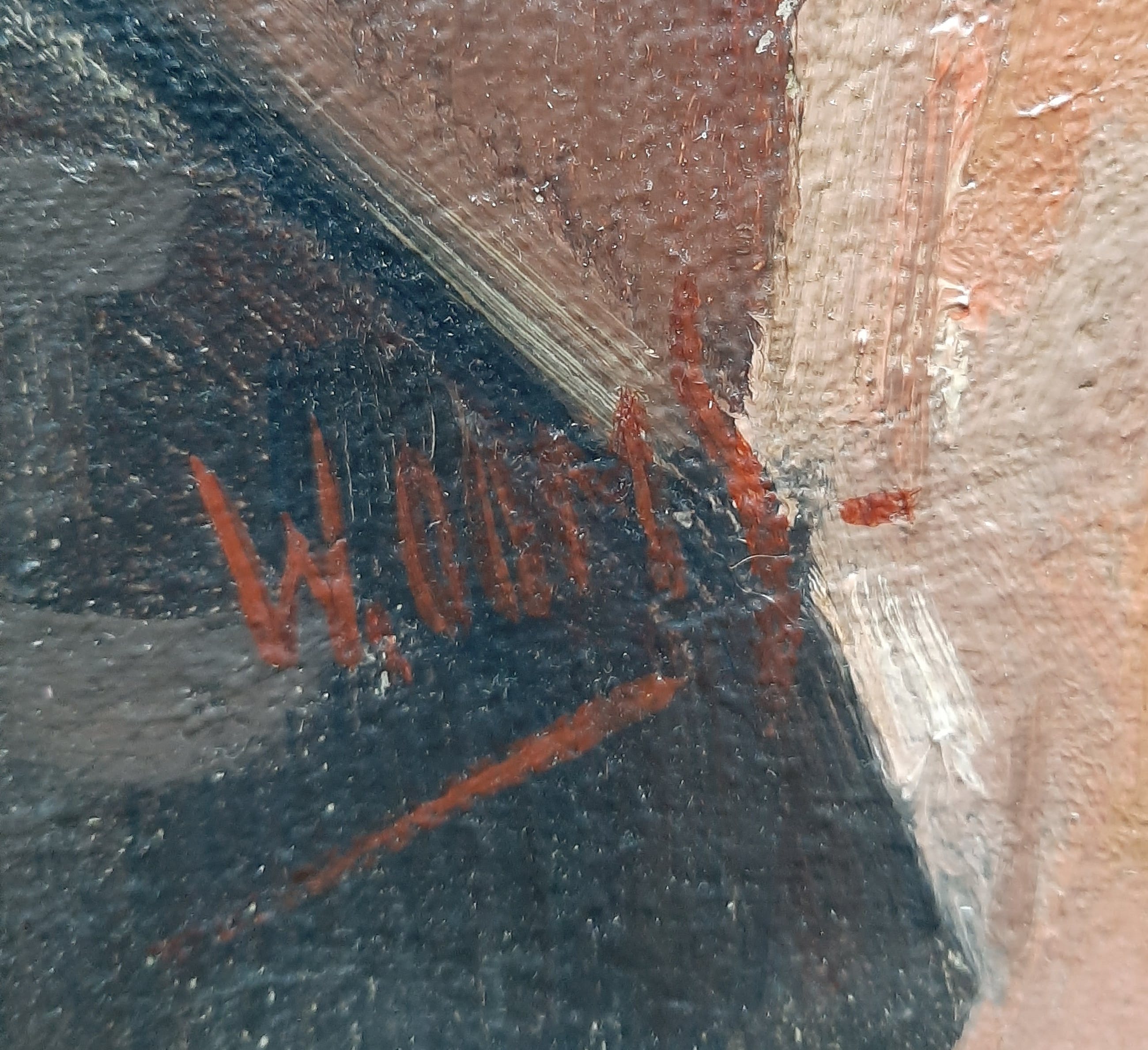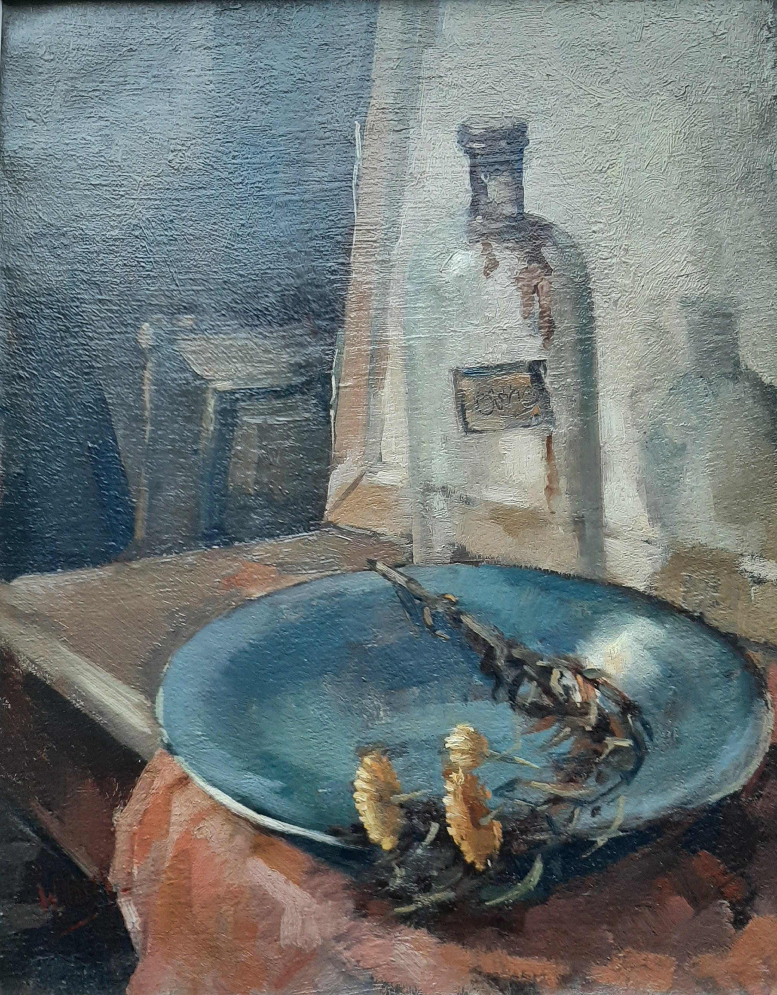 Mooi realistisch olieverfschilderij door Wiers Ooms. Stilleven met blauwe schaal en glazen fles, in het atelier van de schilder. Gesigneerd links onder en voorzien van een eenvoudige 'schilders-lijst'