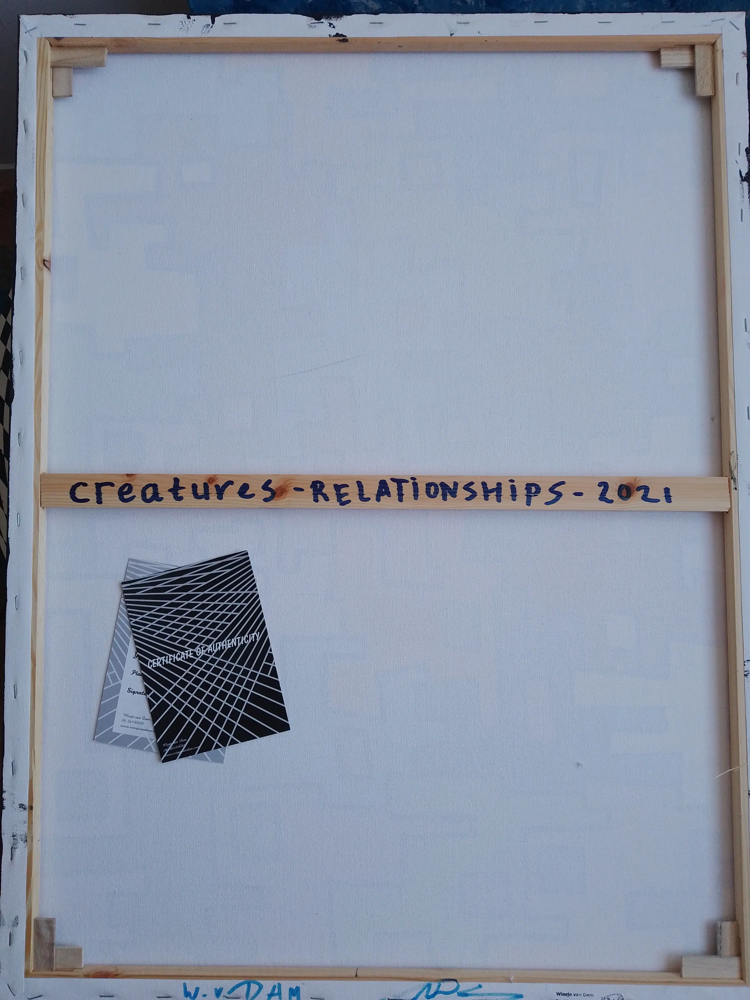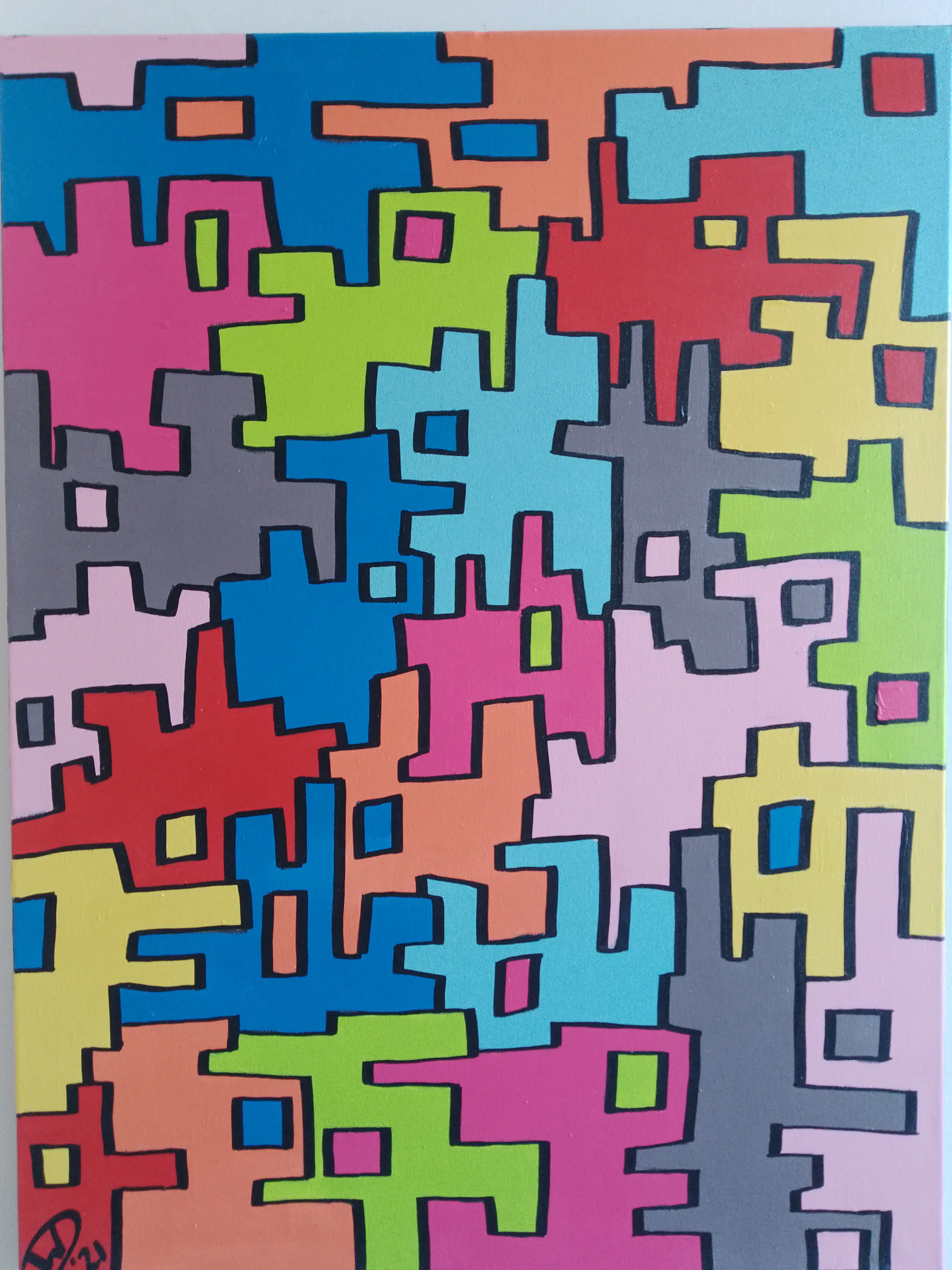 Abstract geometrisch kunstwerk gemaakt van acrylverf en beschermd met acryllak. Een fantasierijk schilderij met als onderwerp relaties.