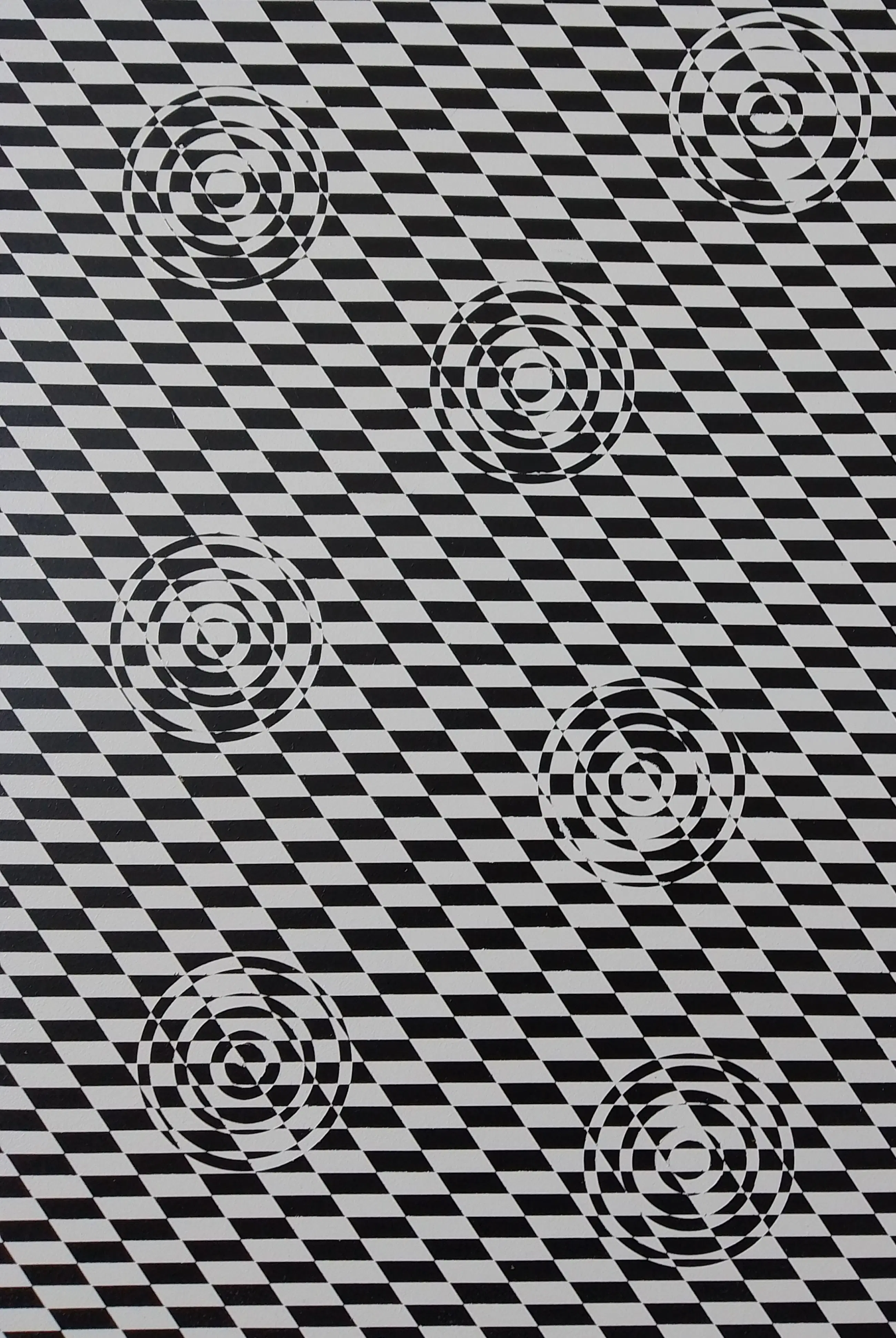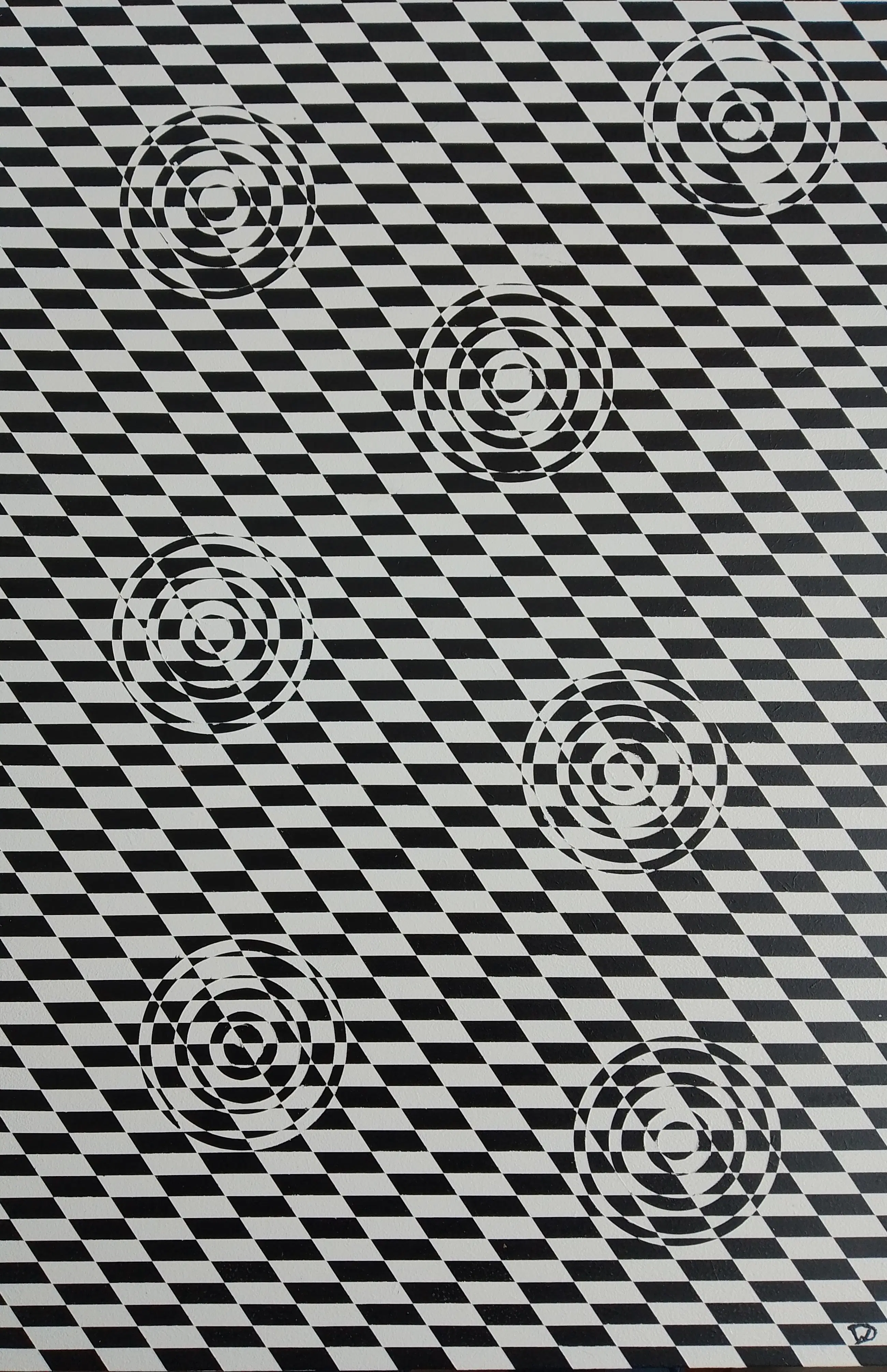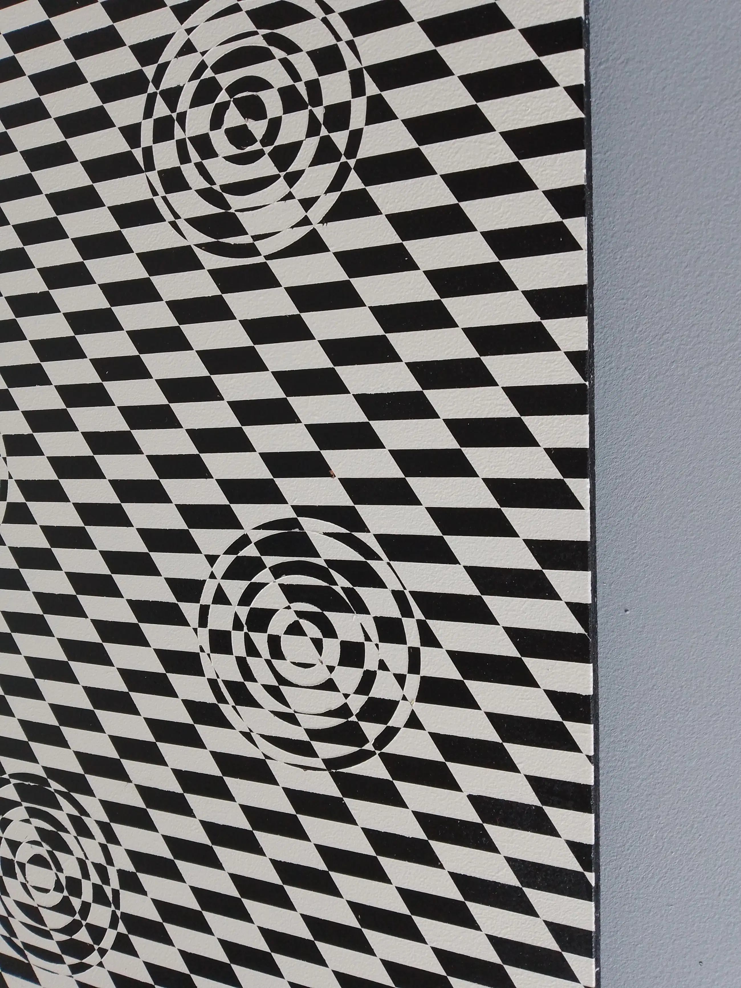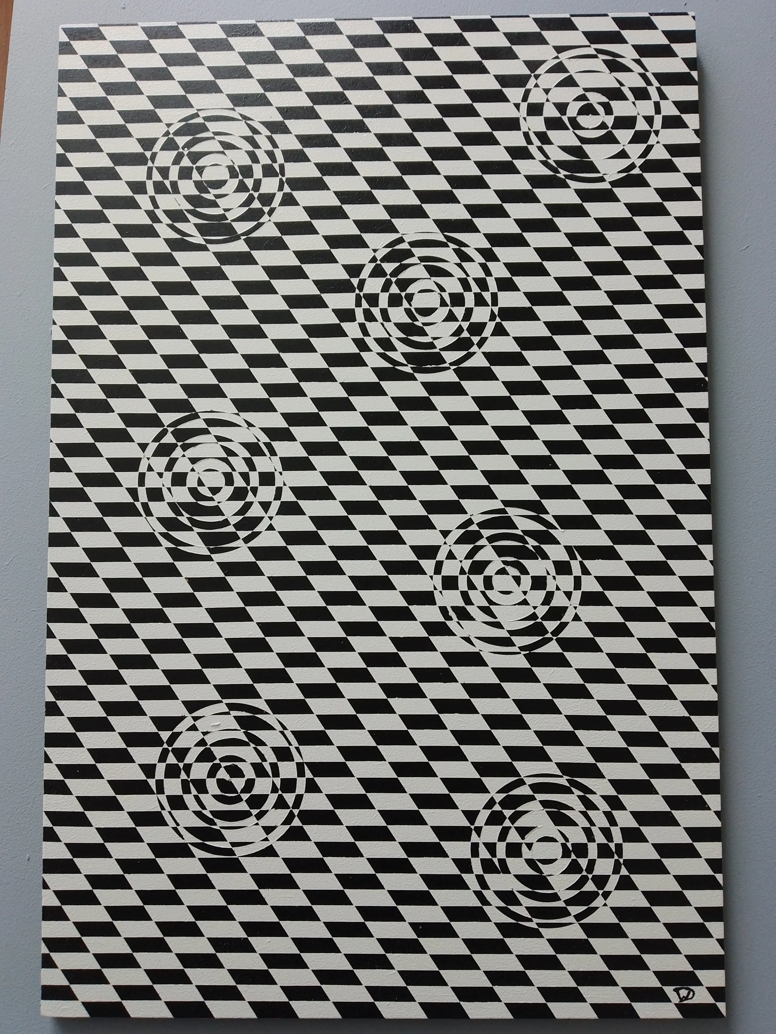Abstract optisch kunstwerk. In goede staat, Het is gemaakt met acrylverf op MDF-paneel. Voor bescherming gelakt met acryllak. Àan de achterzijde zit even haakje waaraan u het kunstwerk aan de muur kunt ophangen.