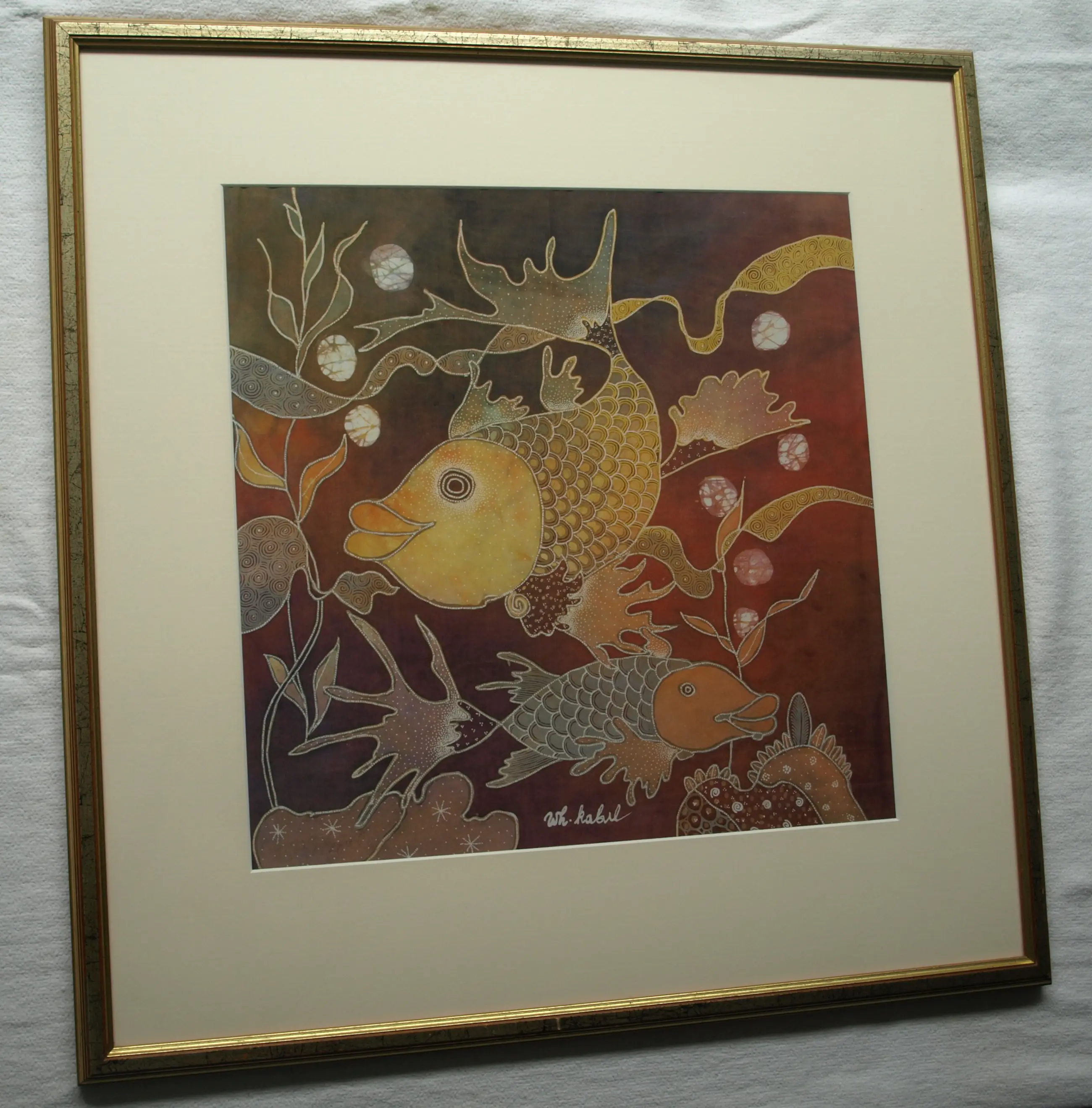 Een d.m.v. batiktechniek beschilderde zijden doek van de Indonesische kunstenaar Wiji Hartono Kabul (1950-). Gesigneerd en goed ingelijst in een houten lijst met passe-partout en glasplaat. Klaar om op te hangen. Afmetingen: Lijst, 72 x 71 x 2½cm. Beeld, 46½ x 46½ cm. Herkomst: Uit een inboedel. Conditie: Het werk is in zeer goede staat. Zie ook de foto’s voor een eigen indruk. Kan zo aan de muur.