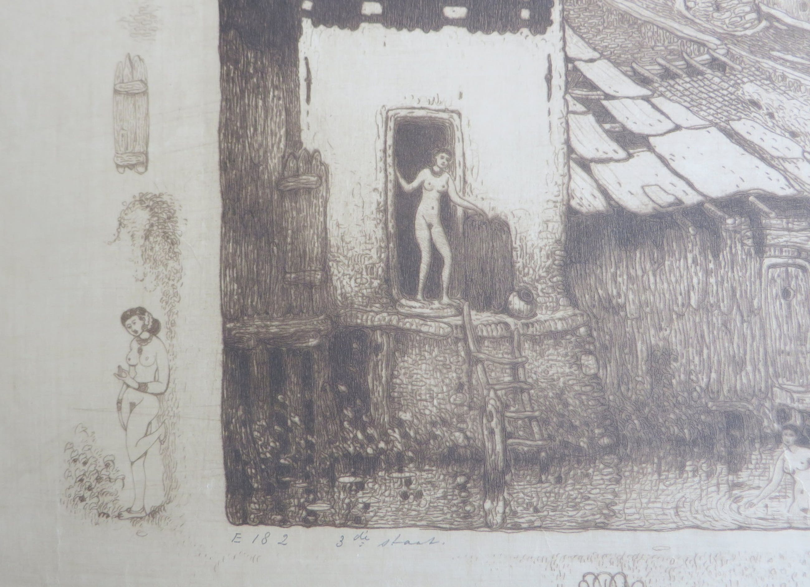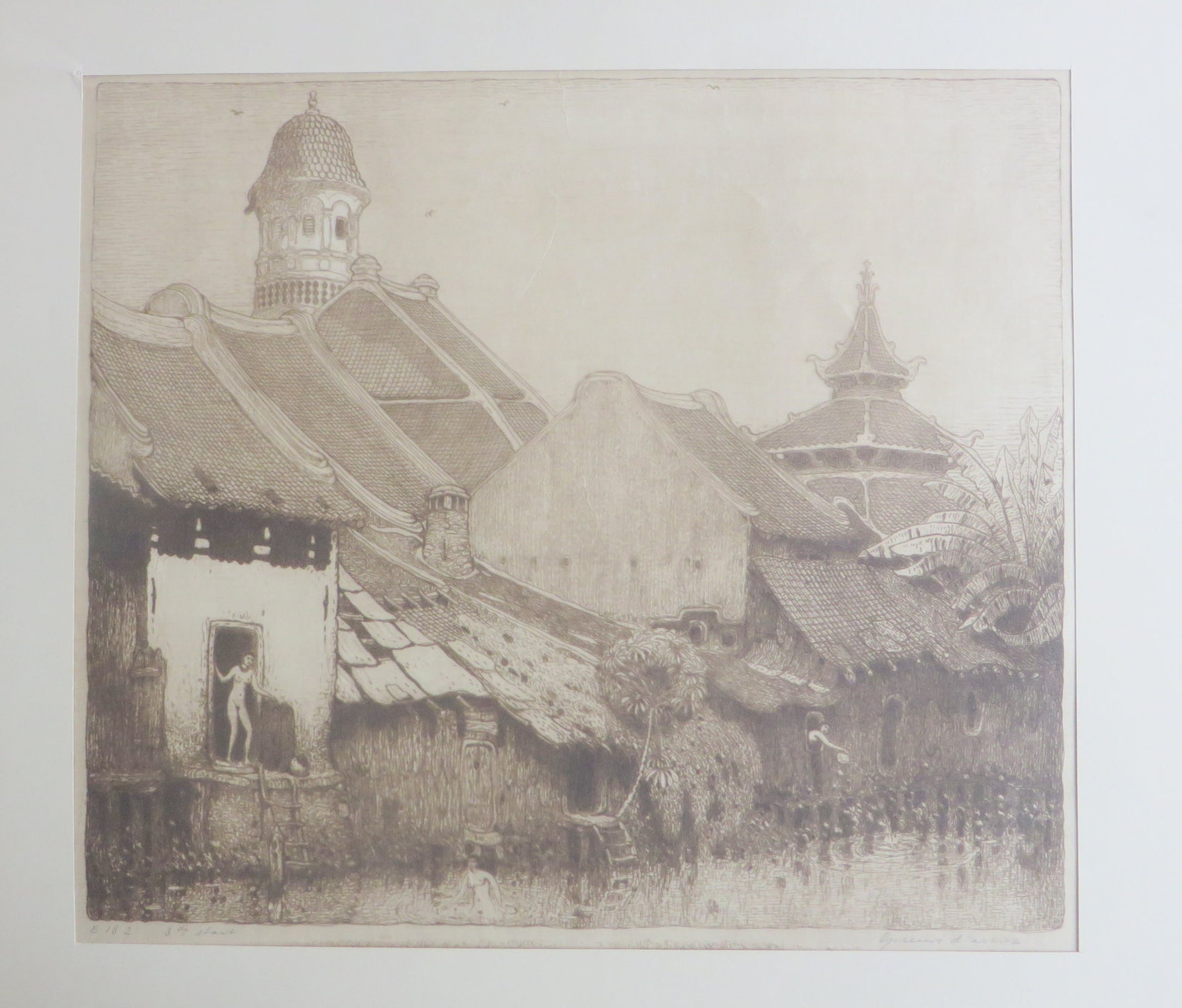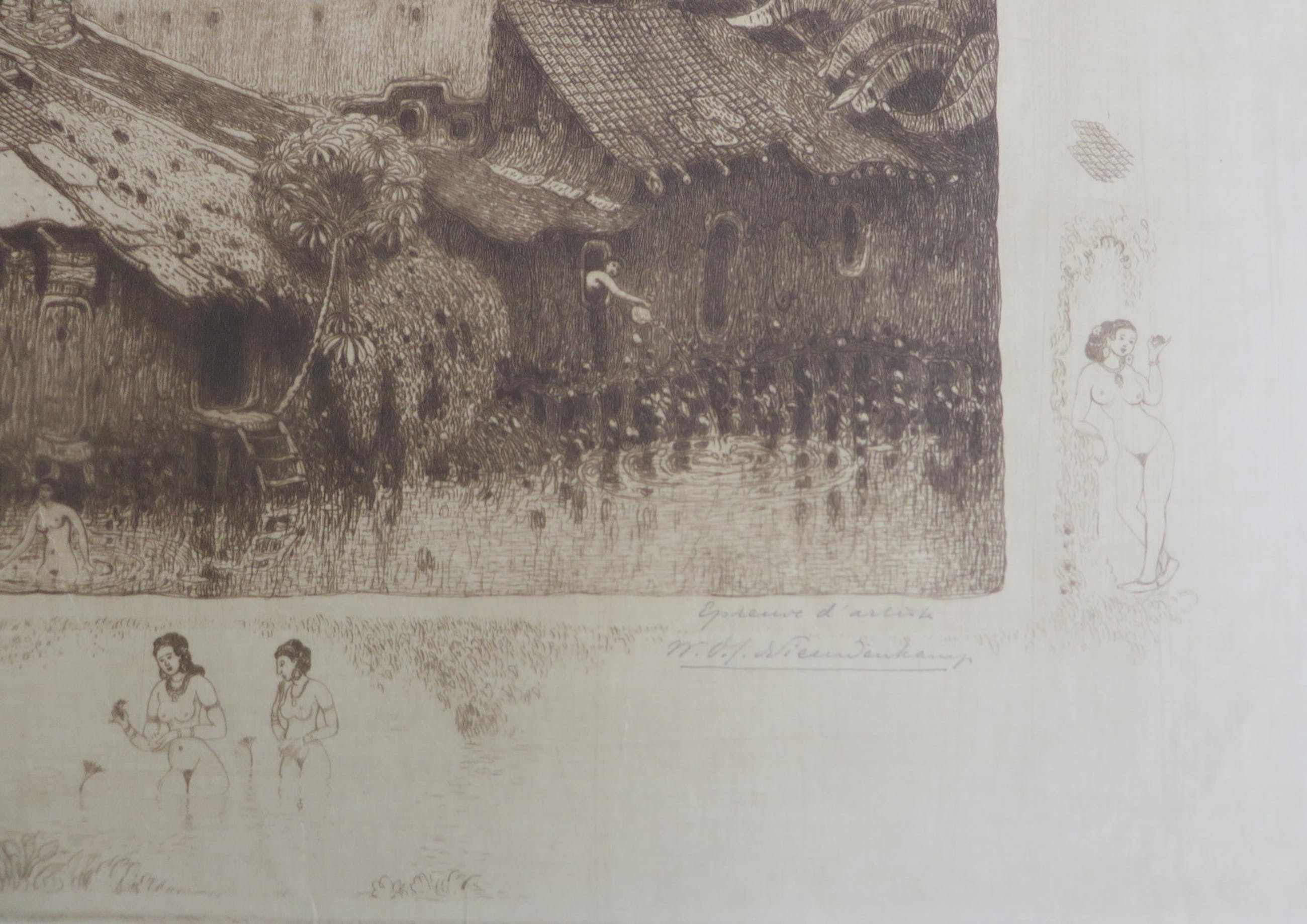 Een bijzonder grote ets met een fraaie weergave van het dagelijkse leven in Semarang,Indonesie.In het kader om de afbeelding een aantal vrouwen.De ets is rechts onder met potlood gesigneerd.De plaat is vermoedelijk bijgewerkt omdat het hier om een derde staat gaat. Genummerd:E 182.