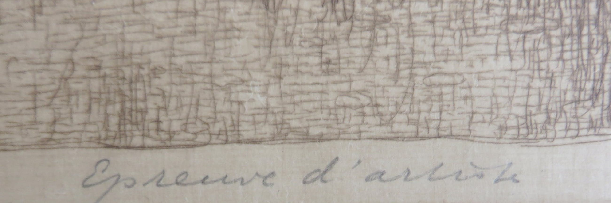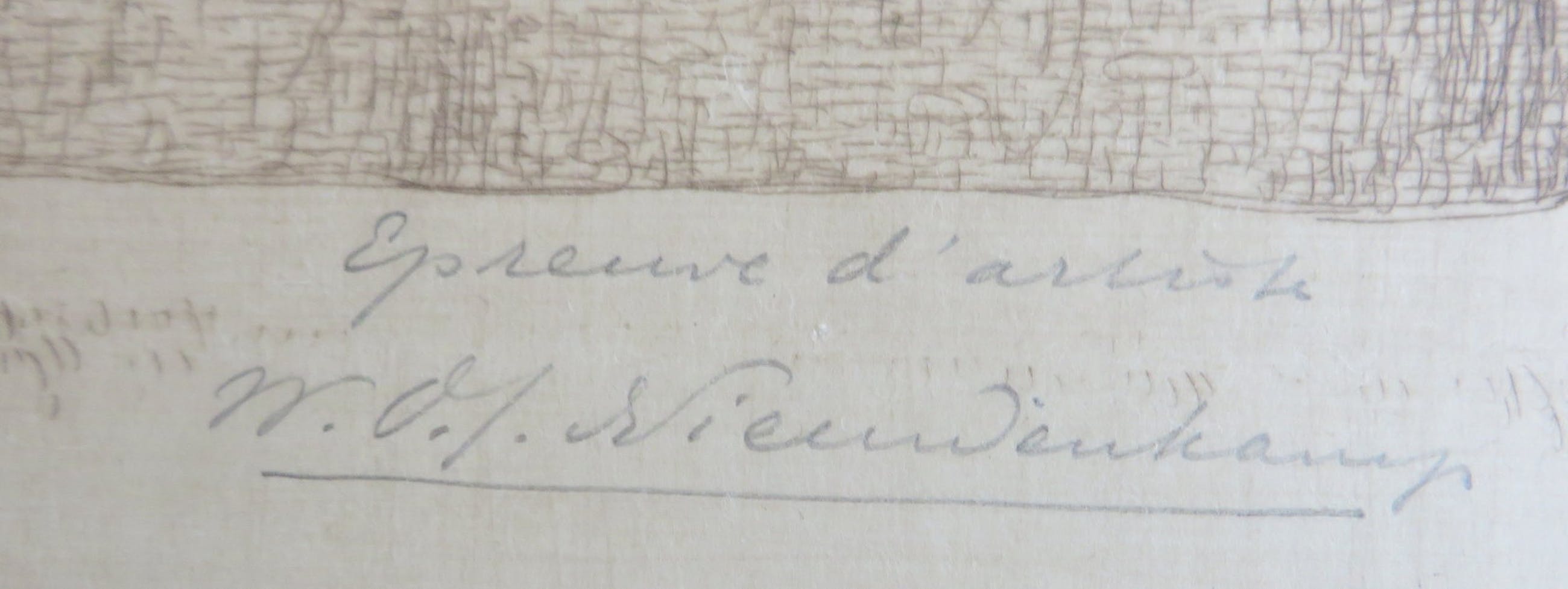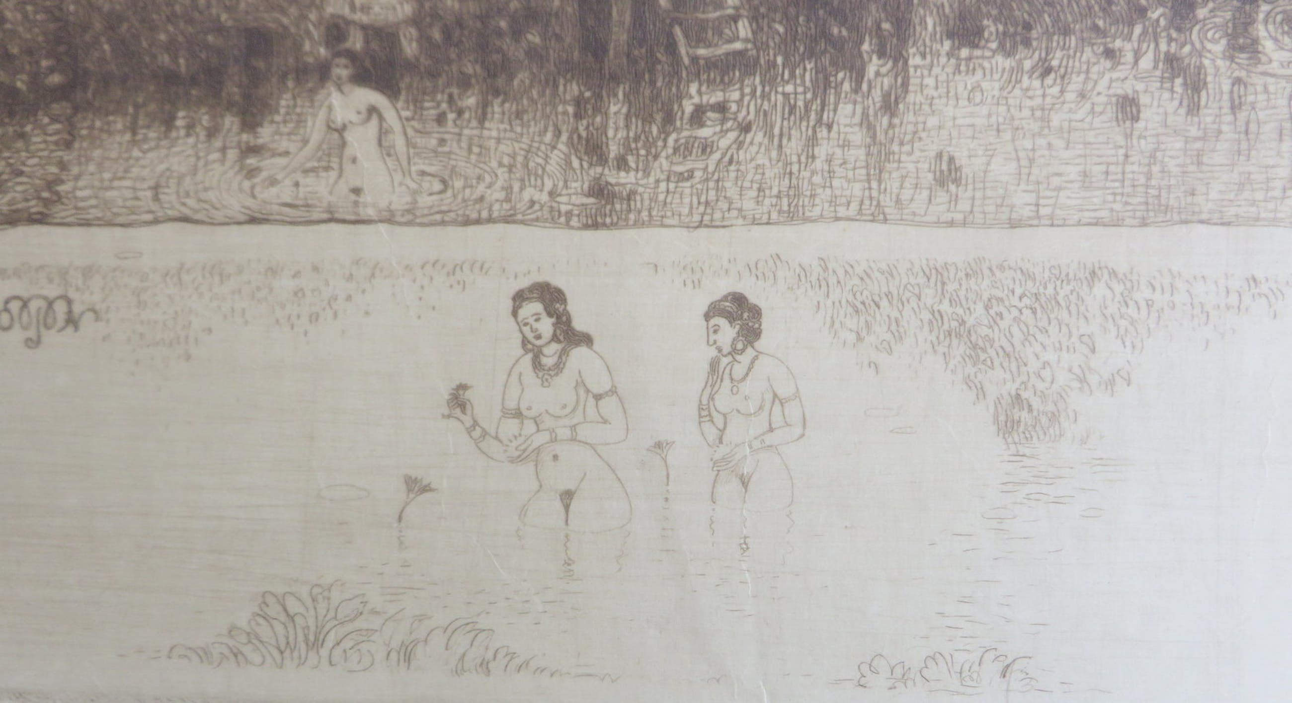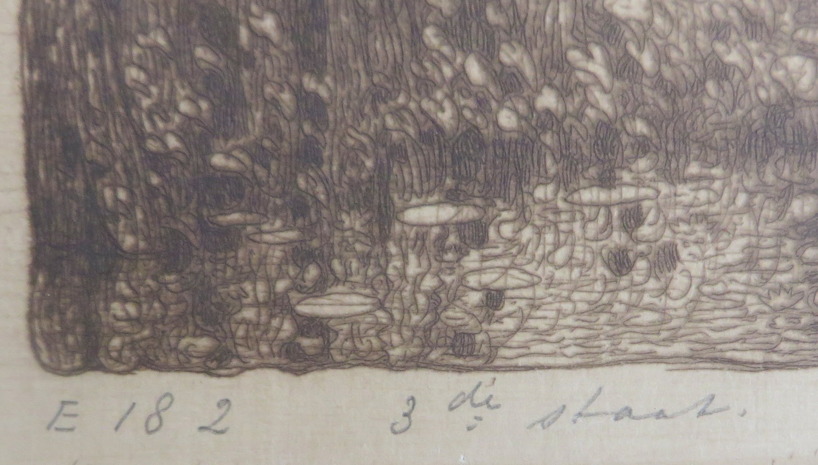 Een bijzonder grote ets met een fraaie weergave van het dagelijkse leven in Semarang,Indonesie.In het kader om de afbeelding een aantal vrouwen.De ets is rechts onder met potlood gesigneerd.De plaat is vermoedelijk bijgewerkt omdat het hier om een derde staat gaat. Genummerd:E 182.