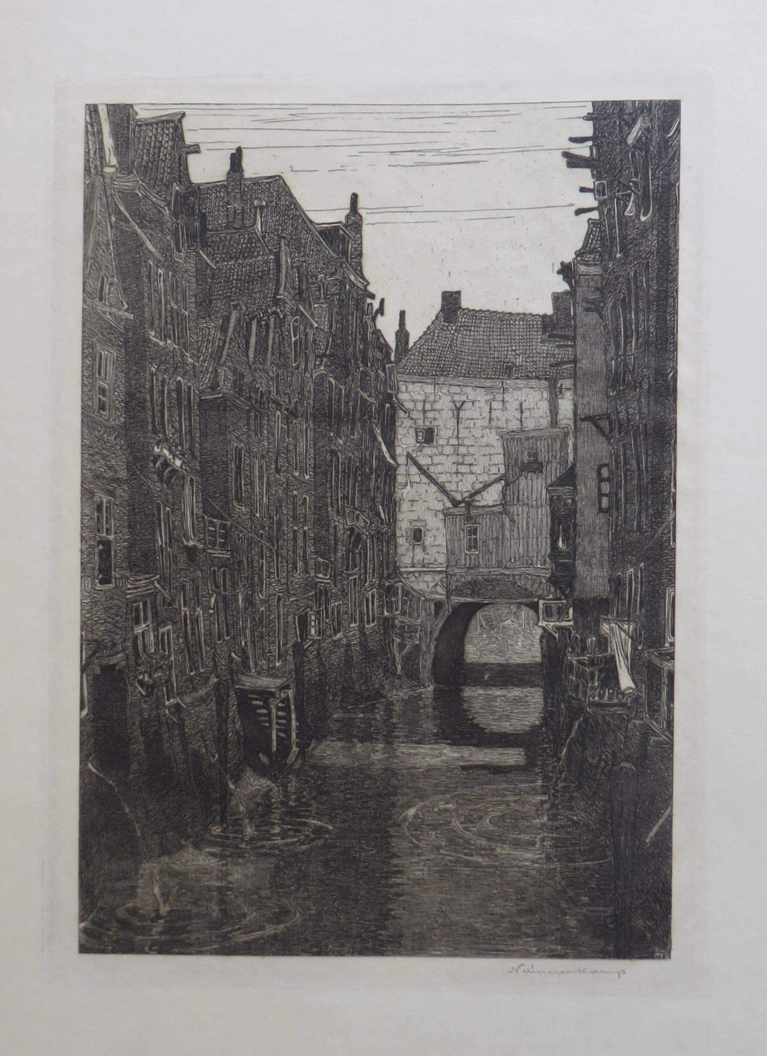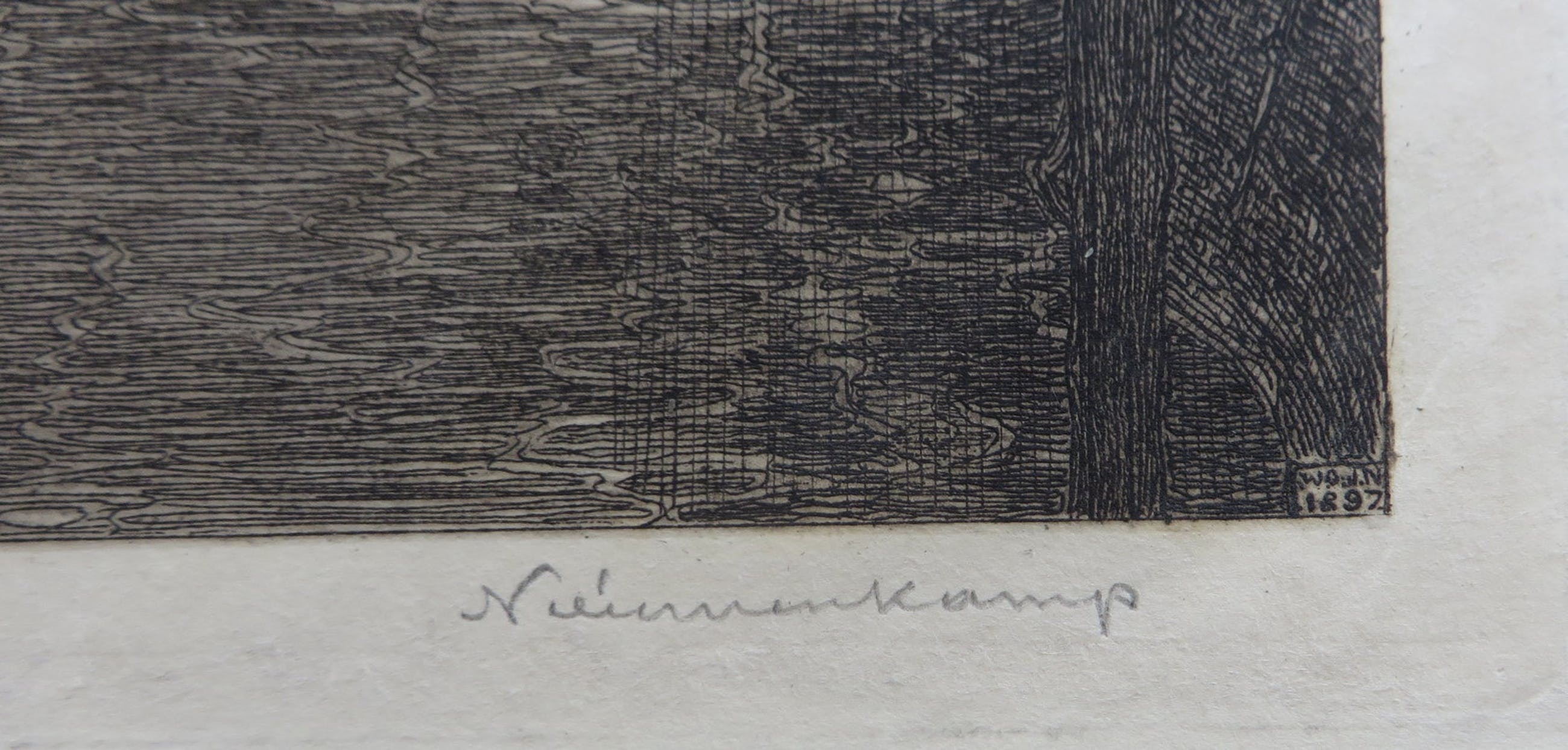 Een ets is gemonogrammeerd (r.o)en gesigneerd met potlood (l.o).Gedateerd:1897,de andere ets is ook gemonogrammeerd (r.o.),gesigneerd met poitlood,niet gedateerd. Voorzien met blinddruk van de drukker.